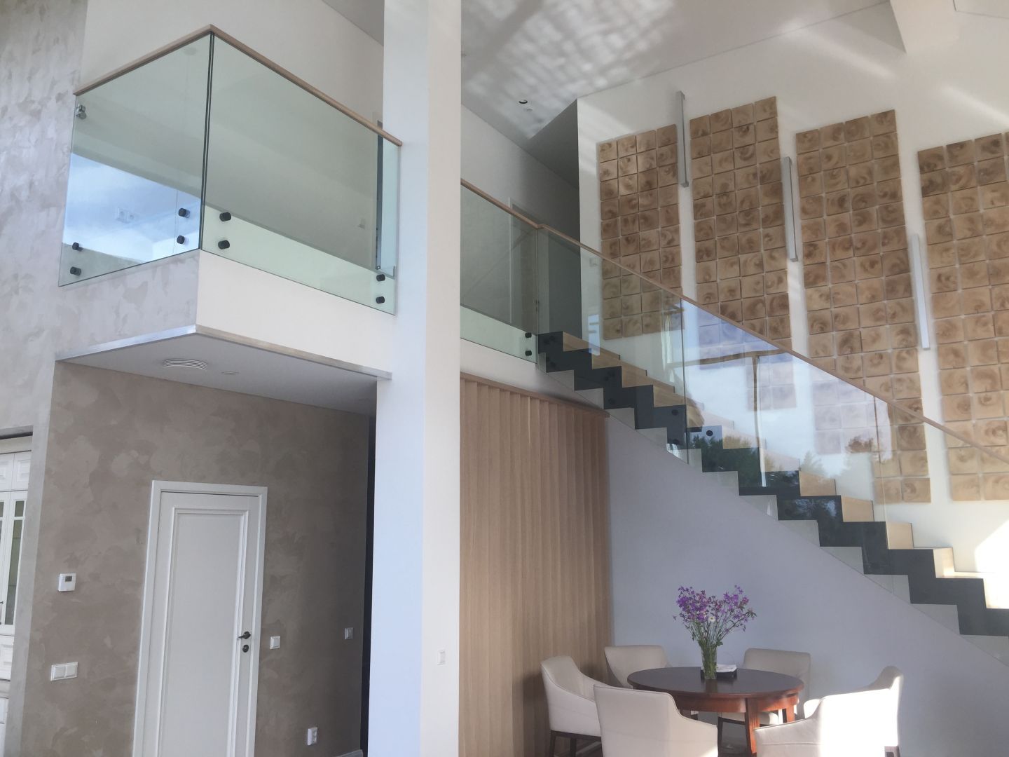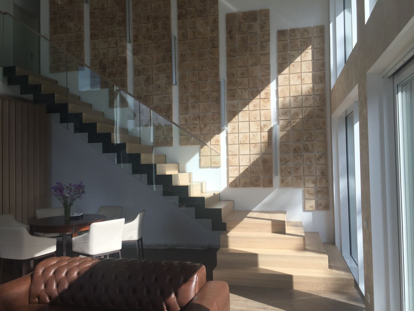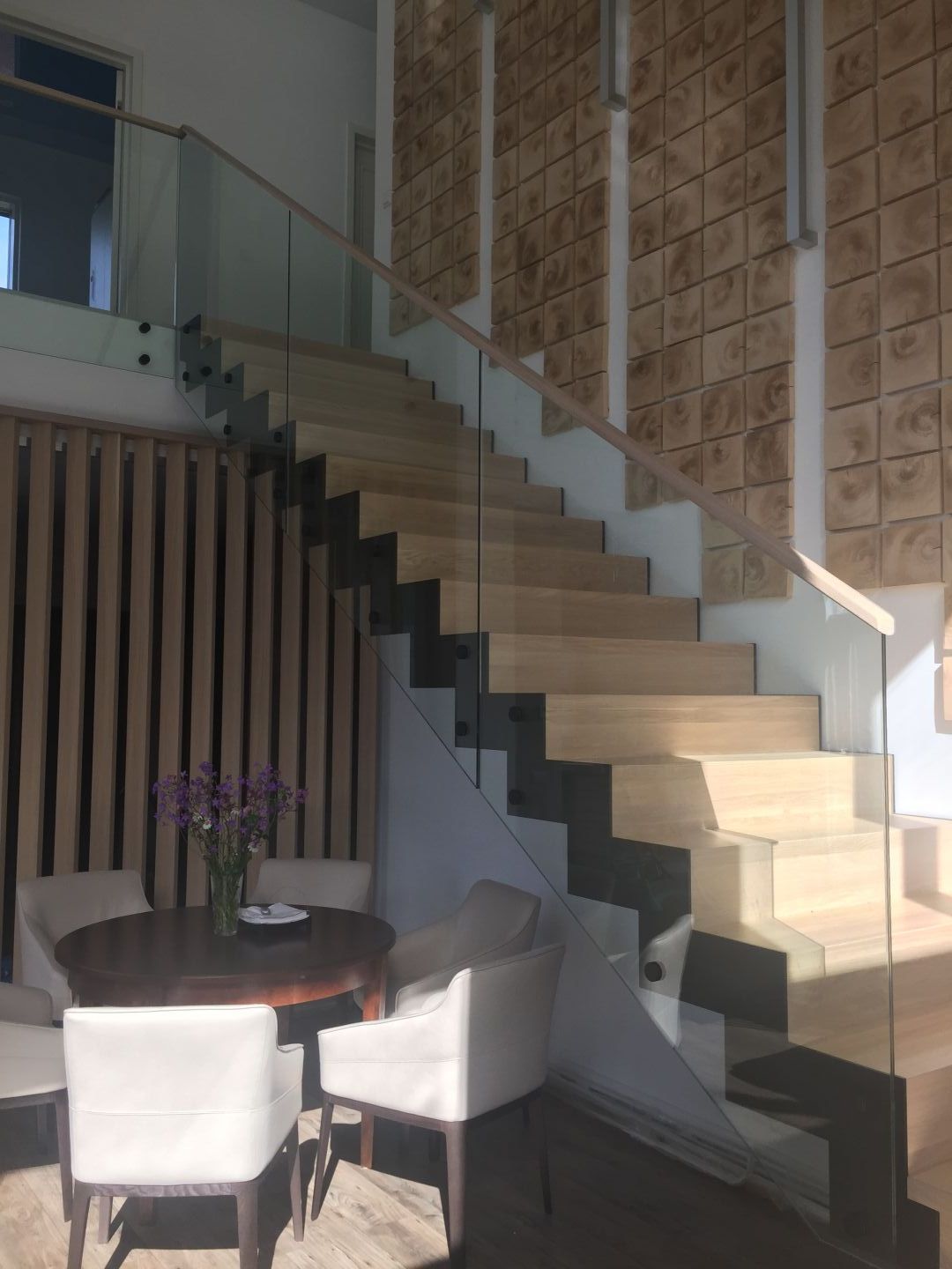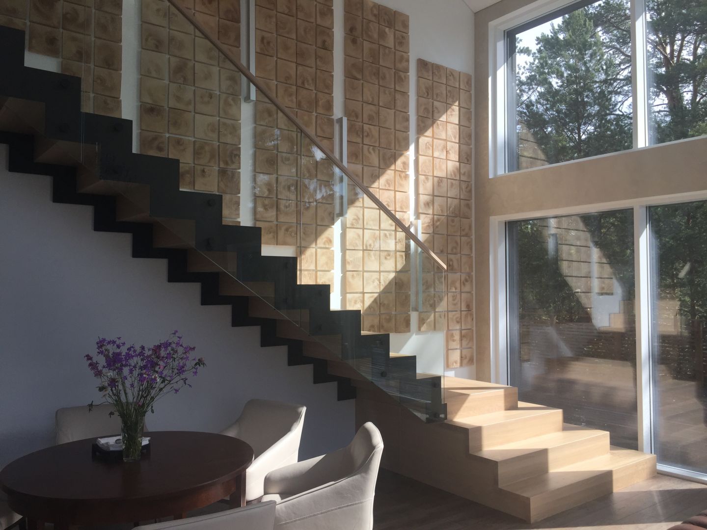 Poodiumiga L-trepp. Kandekonstruktsioon 10x170mm teraslehest, astmed ja varvaslauad tamme liimpuidust piirdeks kirgas karastatud ja lamineeritud 6+6 mm klaas.