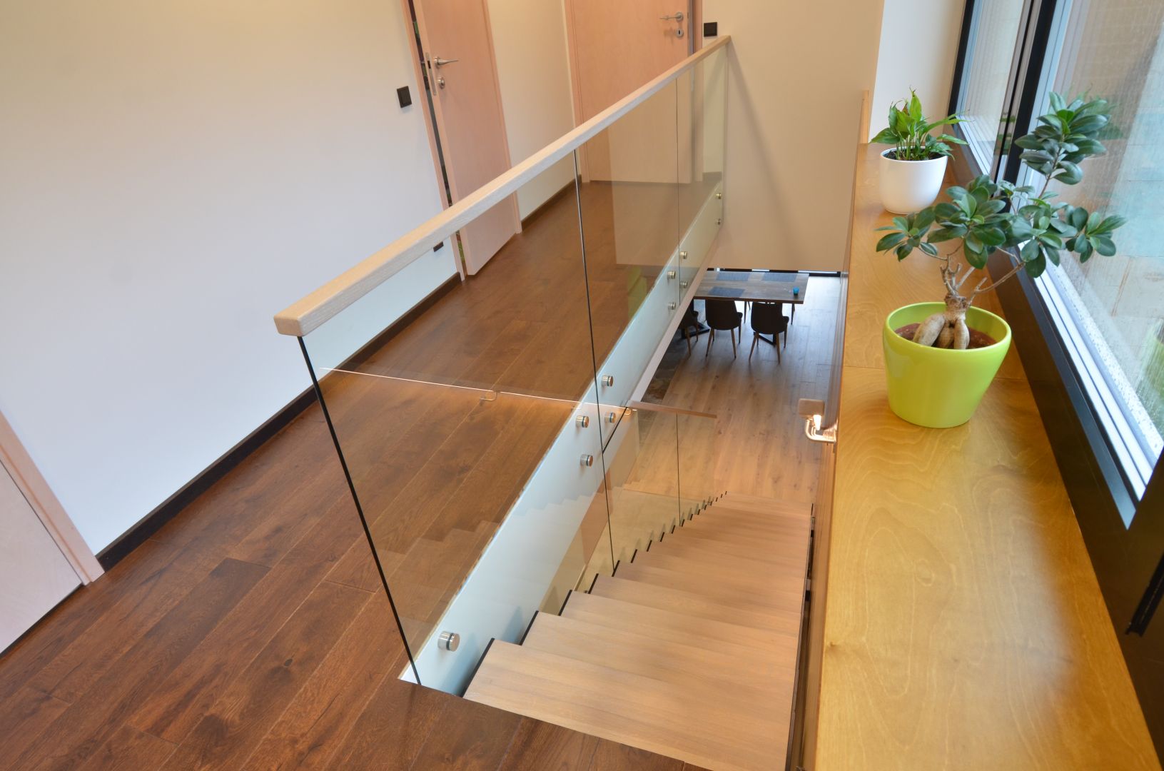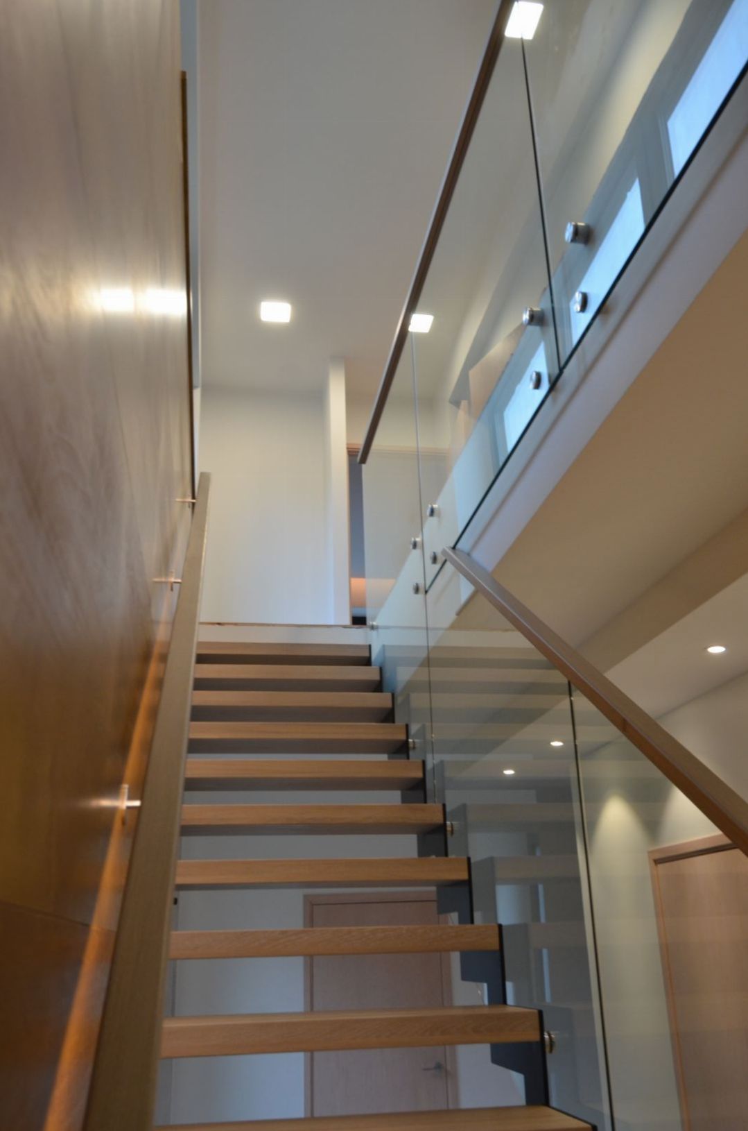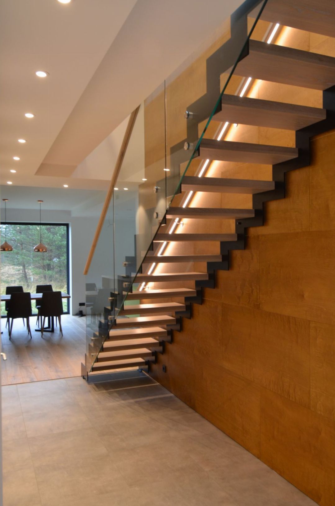 Kandekonstruktsioon 10x140 mm sik-sak teraslehest, astmed 57 mm paksused tamme liimpuidust "karpastmed". piirdeks kirgas karastatud 12 mm klaas.