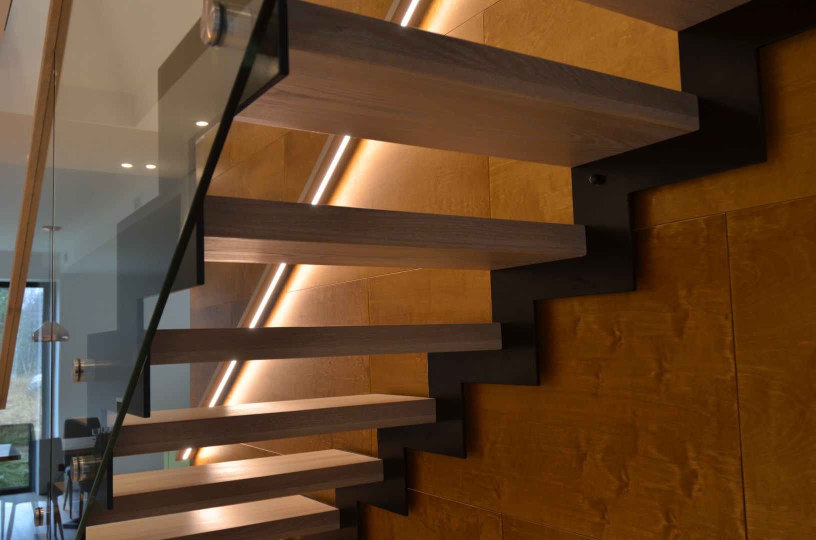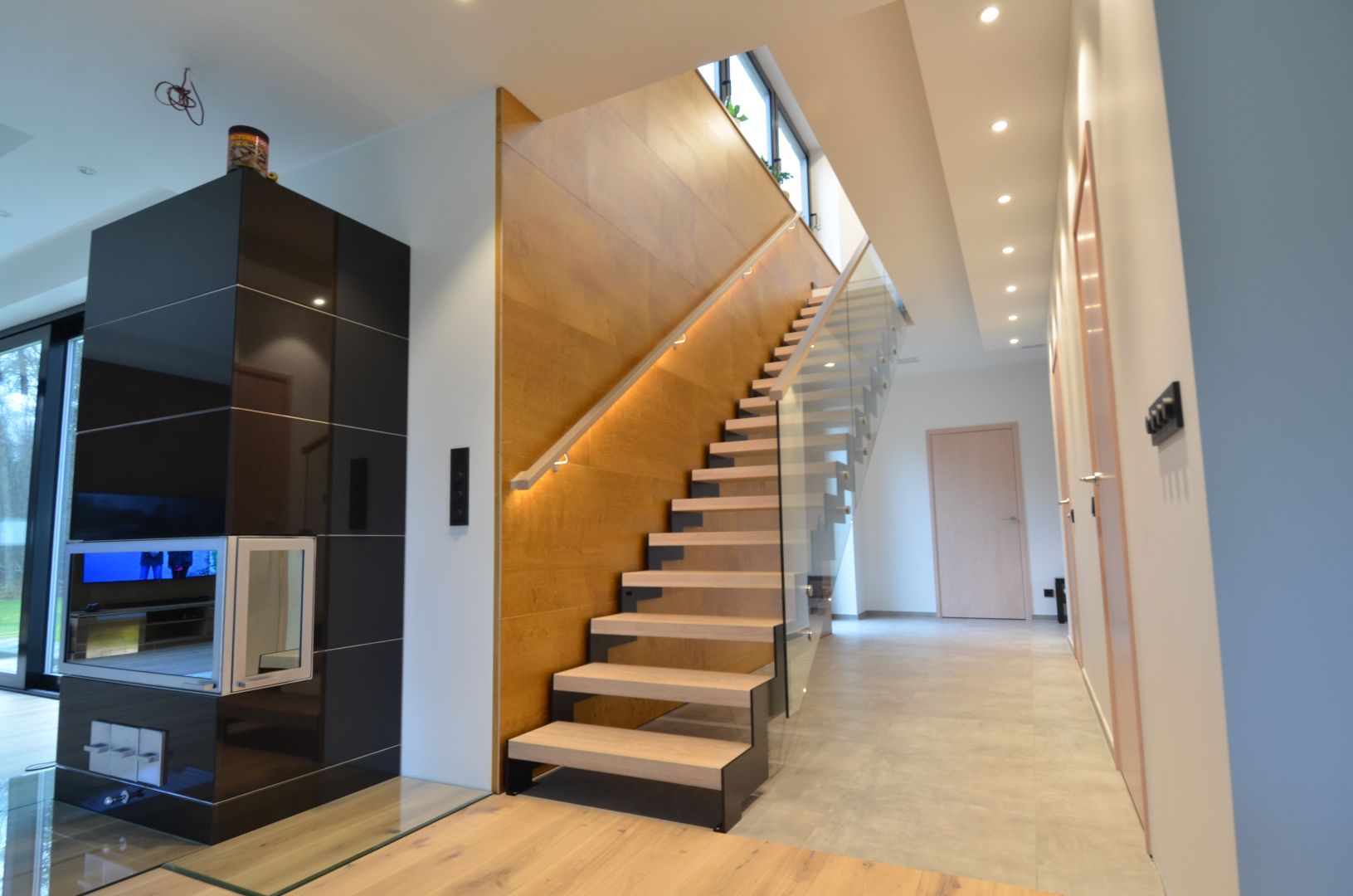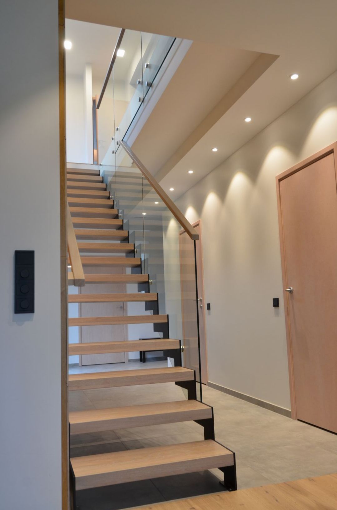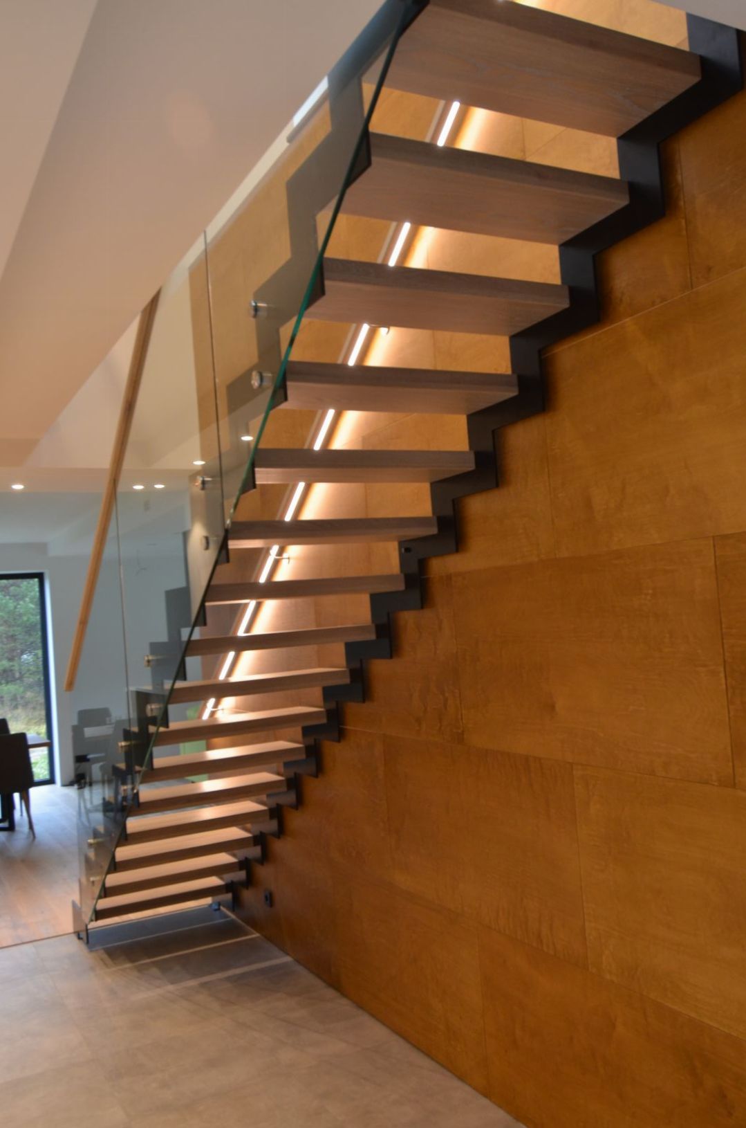 Kandekonstruktsioon 10x140 mm sik-sak teraslehest, astmed 57 mm paksused tamme liimpuidust "karpastmed". piirdeks kirgas karastatud 12 mm klaas.