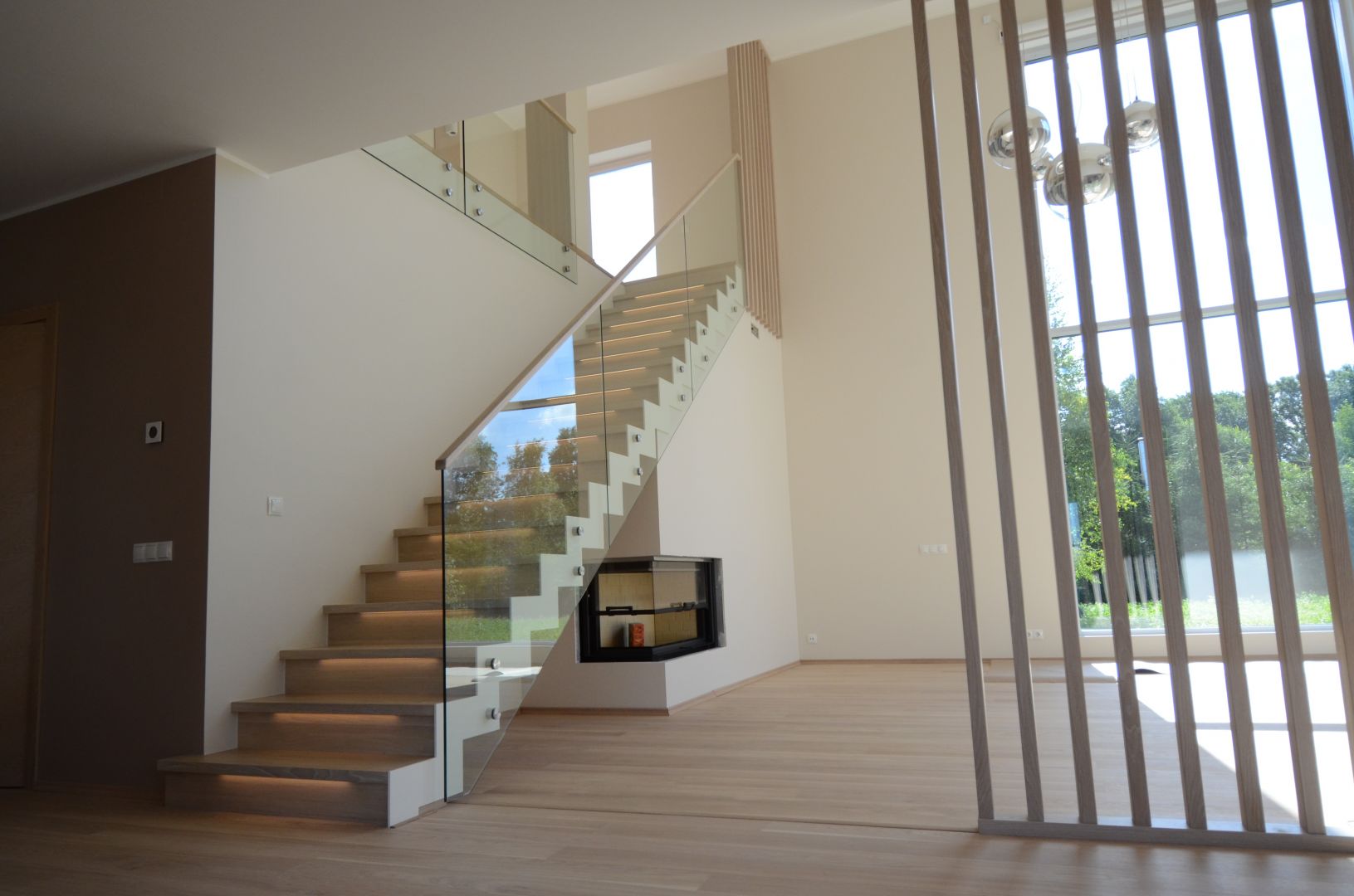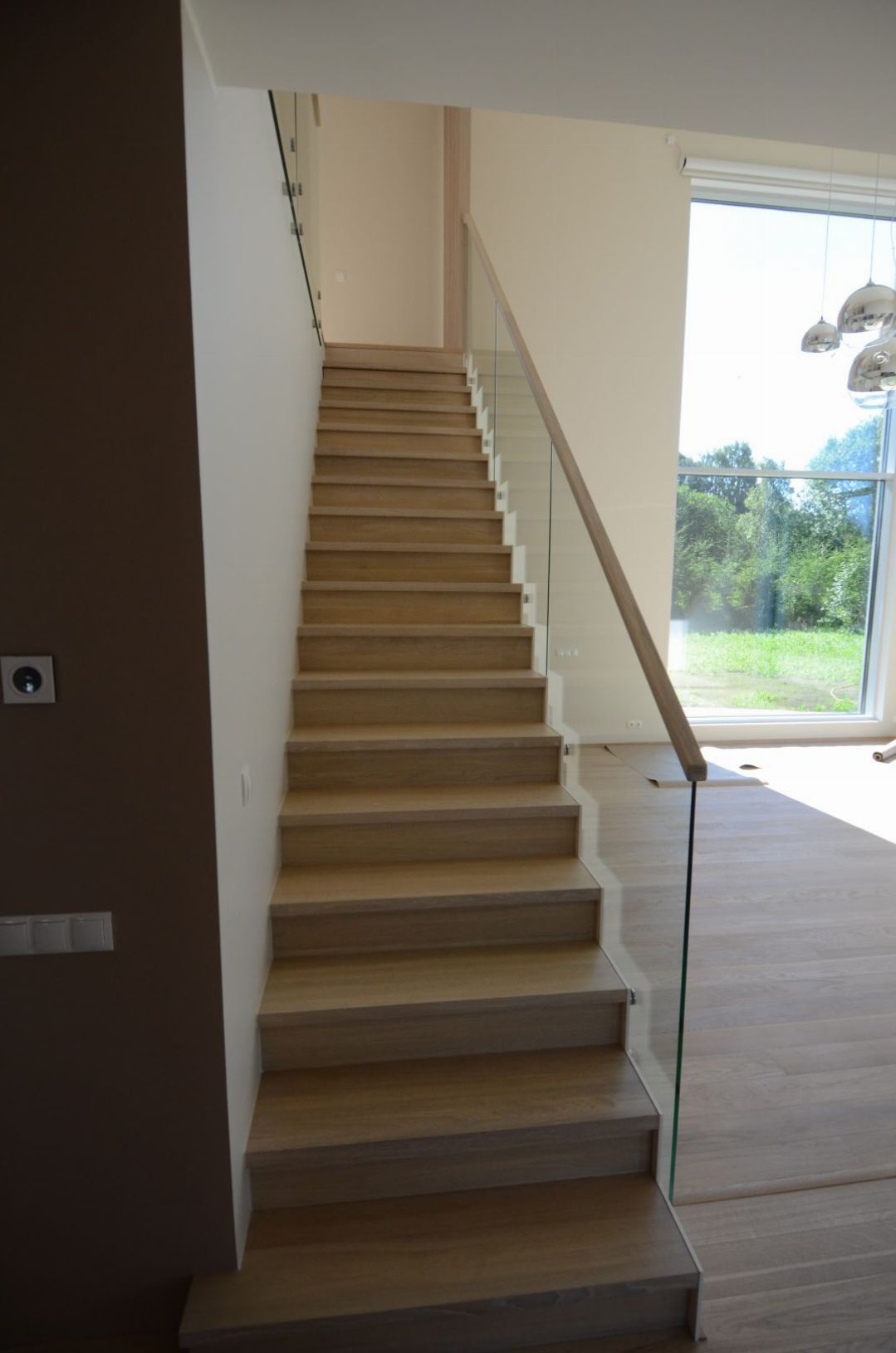 Kandekonstruktsioon 10x150 mm sik-sak teraslehest. Astmed ja varvaslauad tamme liimpuidust. Piirdeks kirga karastatud 12 mm klaas.