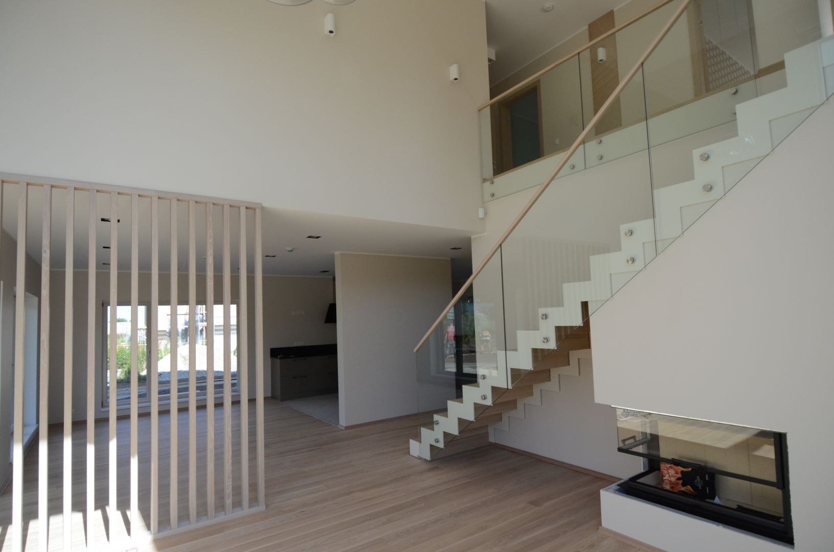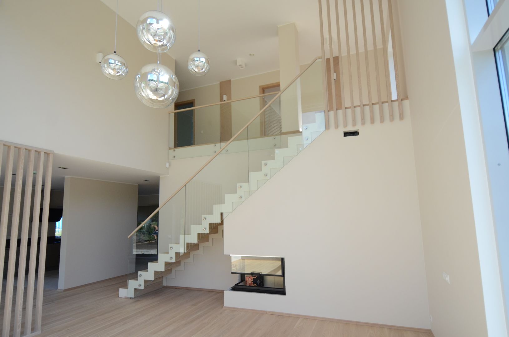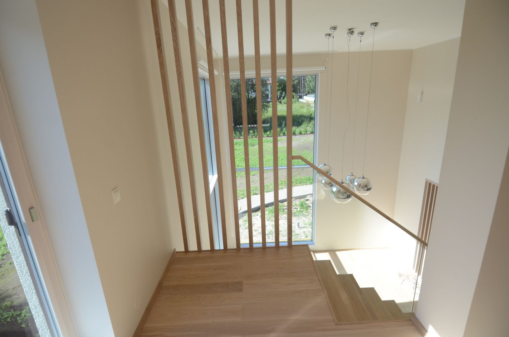 Kandekonstruktsioon 10x150 mm sik-sak teraslehest. Astmed ja varvaslauad tamme liimpuidust. Piirdeks kirgas karastatud 12 mm klaas.