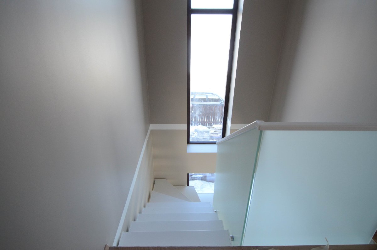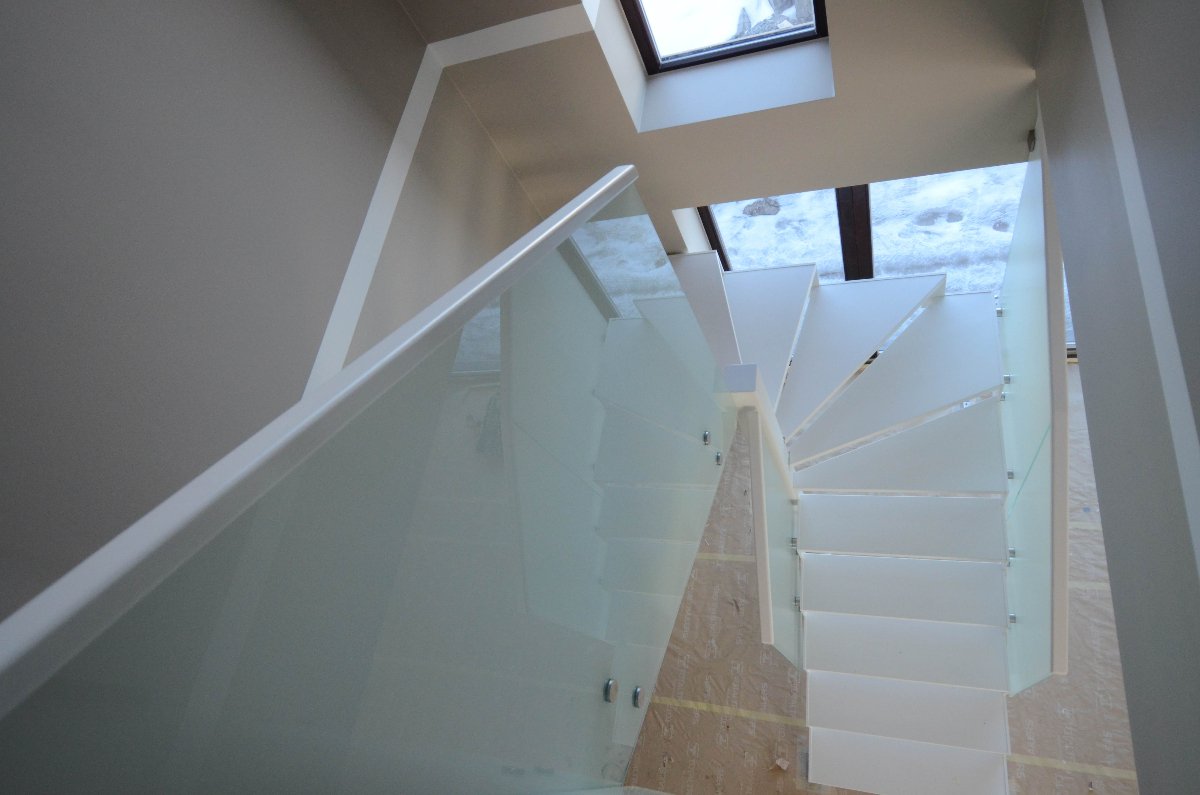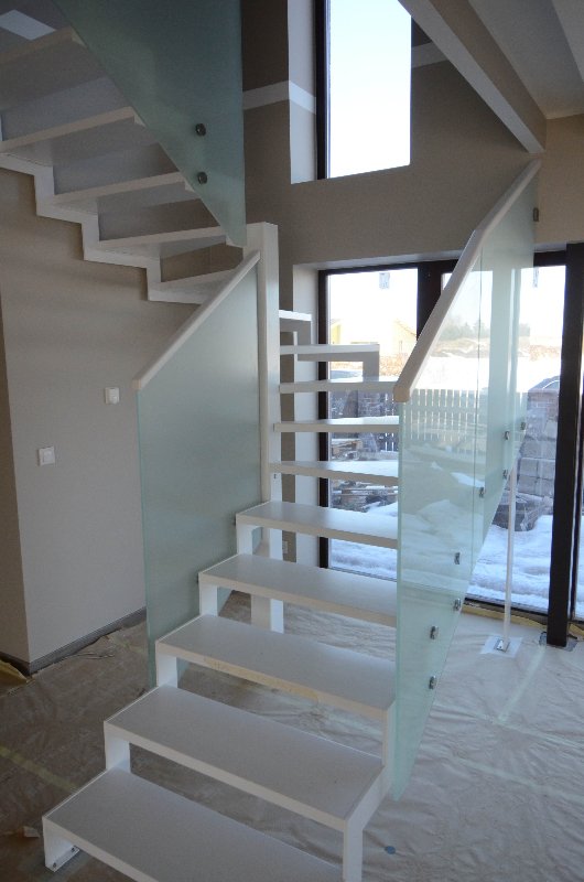 Kandekonstruktsioon 12x 100 mm sik-sak teraslehest, astmed pöögi liimpuidust, värvitud valgeks. Piirdeks 12 mm karastatud mattklaas.