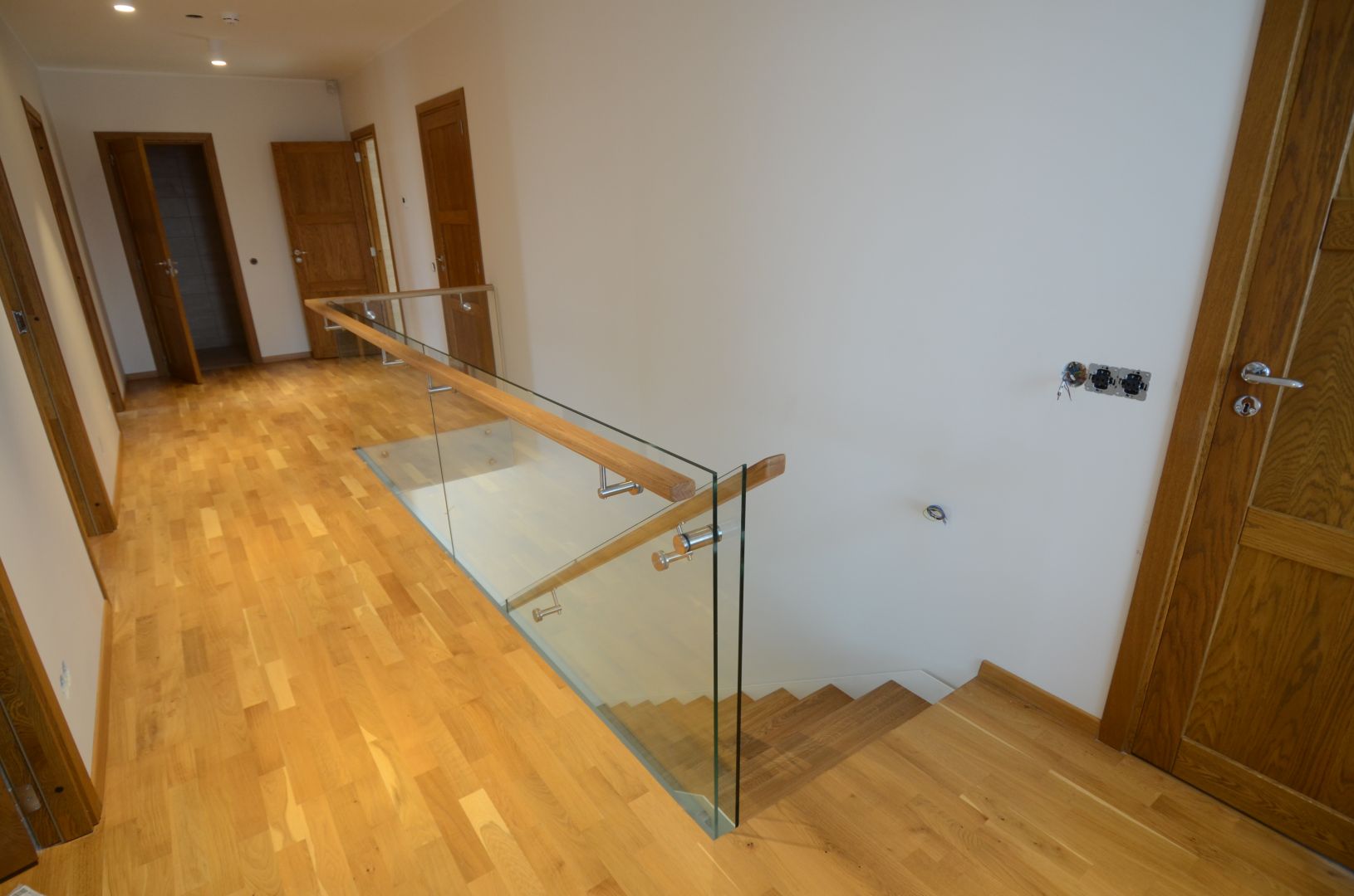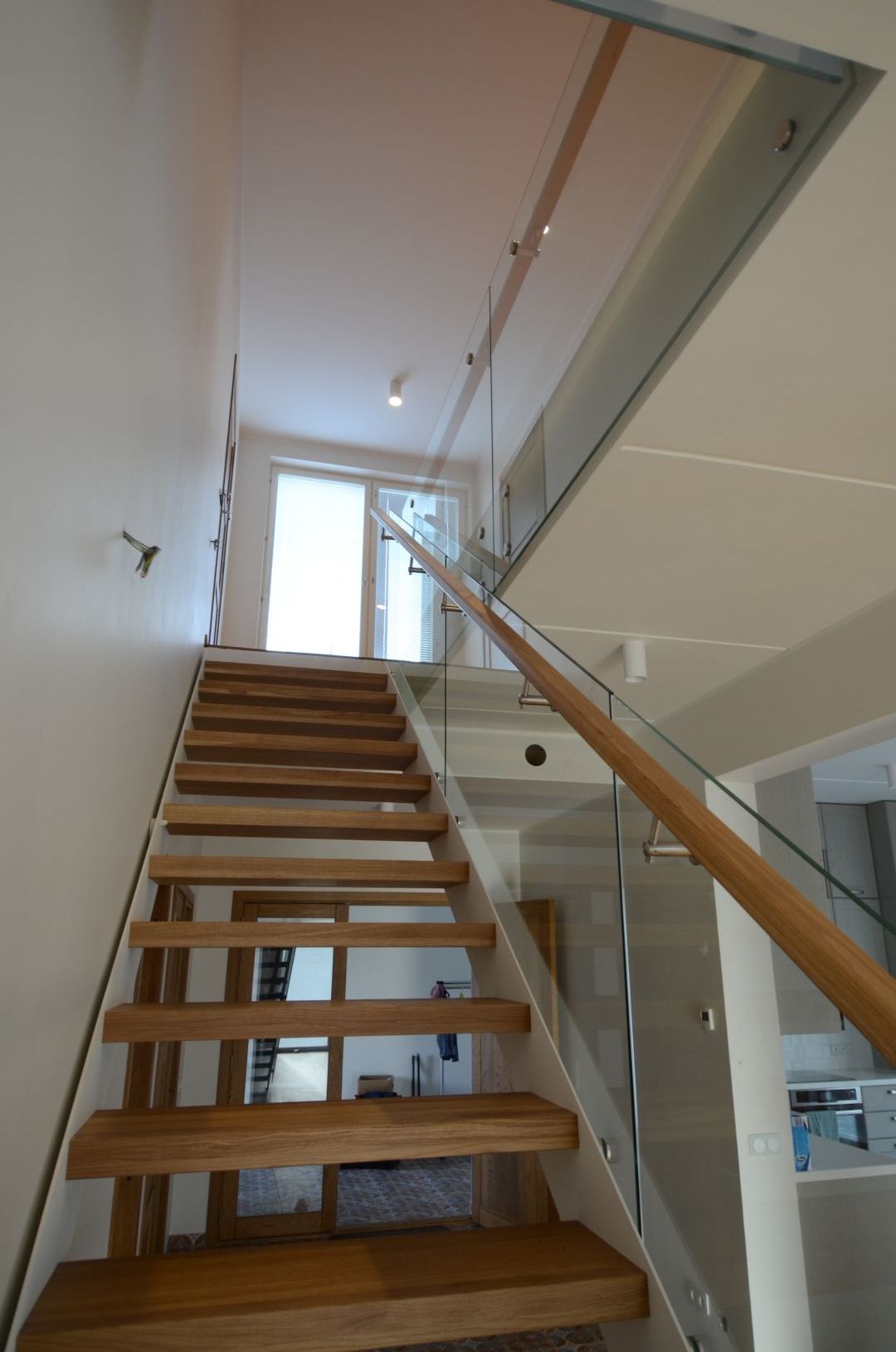 Kandekonstruktsioon 6x260 mm teraslehest, astmed tamme liimpuidust paksusega 40 mm. Piirdeks kirgas karastatud 12mm klaas.