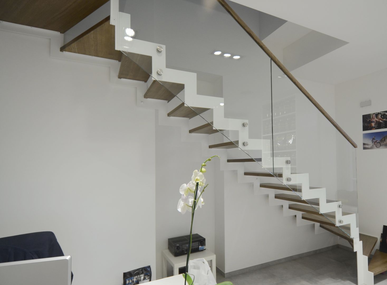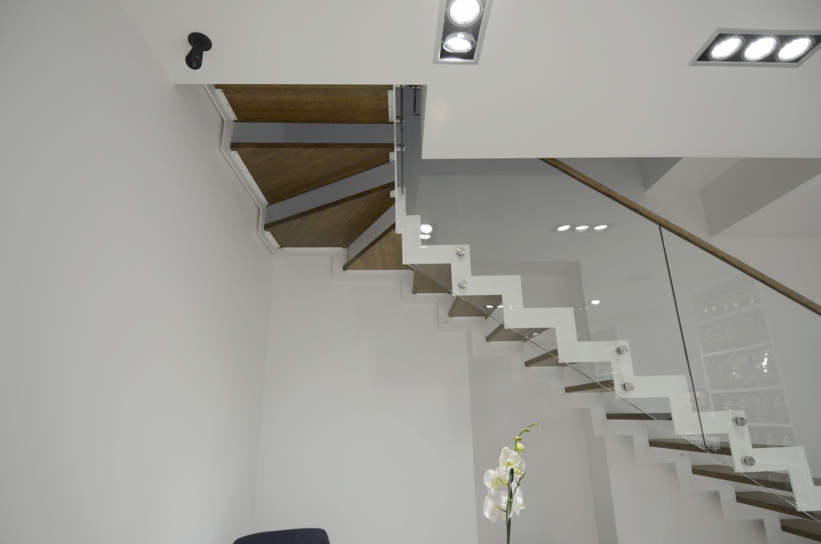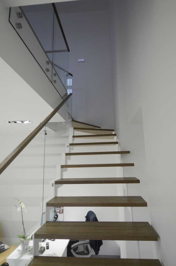 Metalltrepp, kandekonstruktsioon 10x100 mm sk-sak teraslehest, astmed tamme liimpuidust, piirdeks kirgas karastatud 12 klaas.