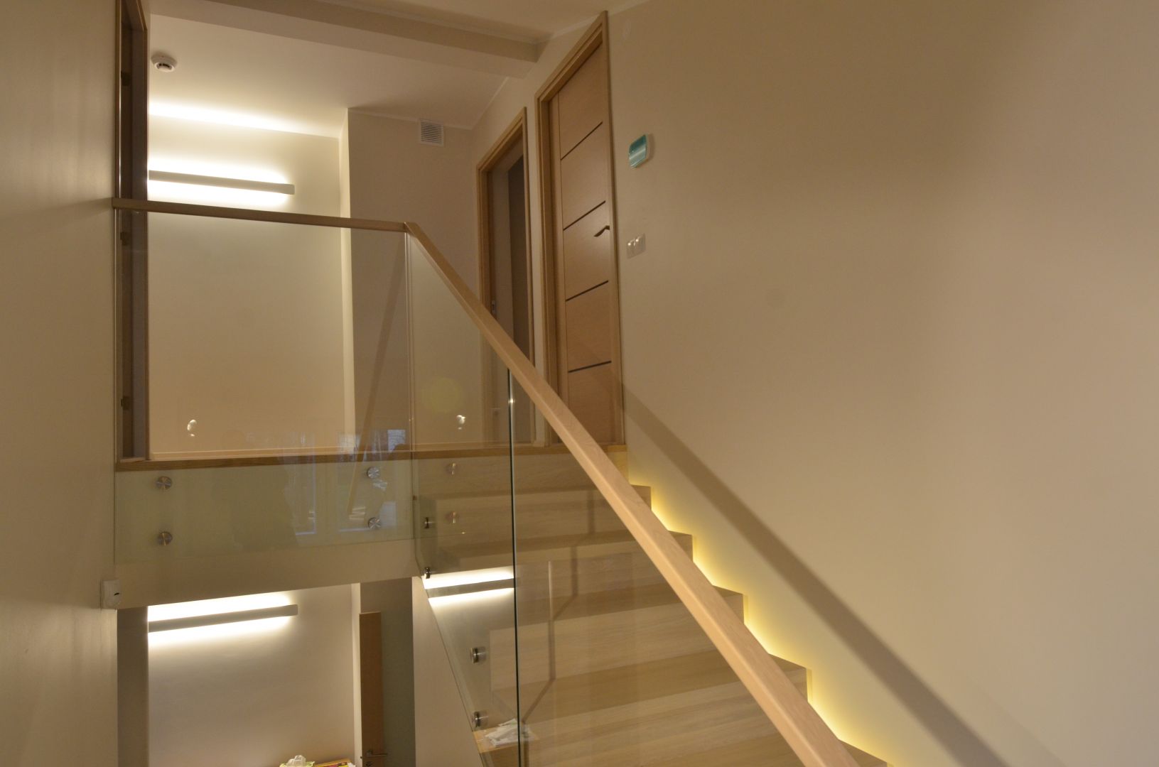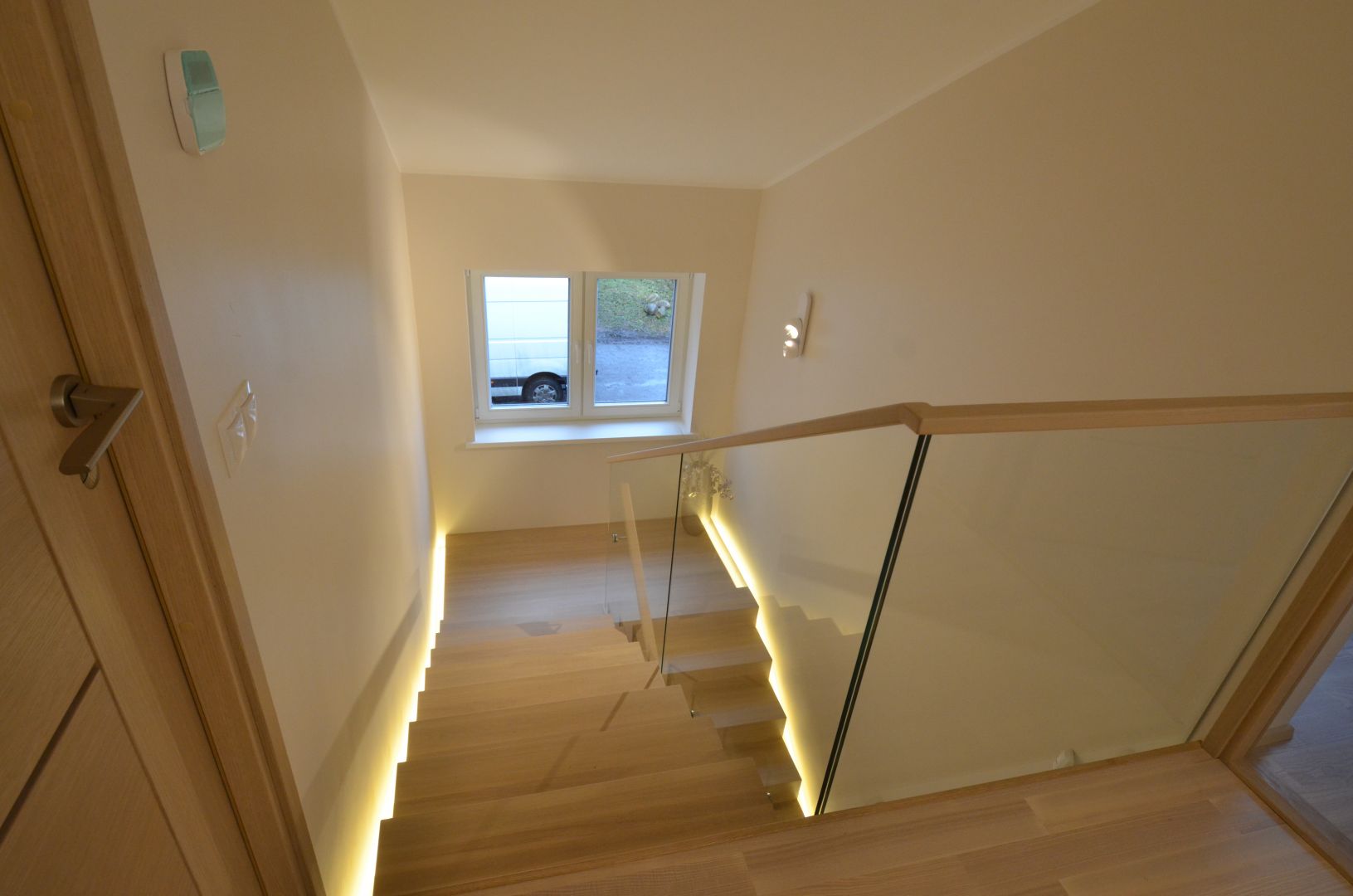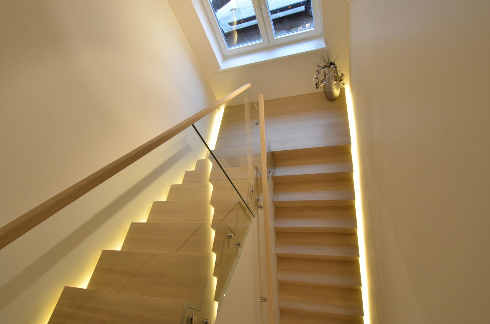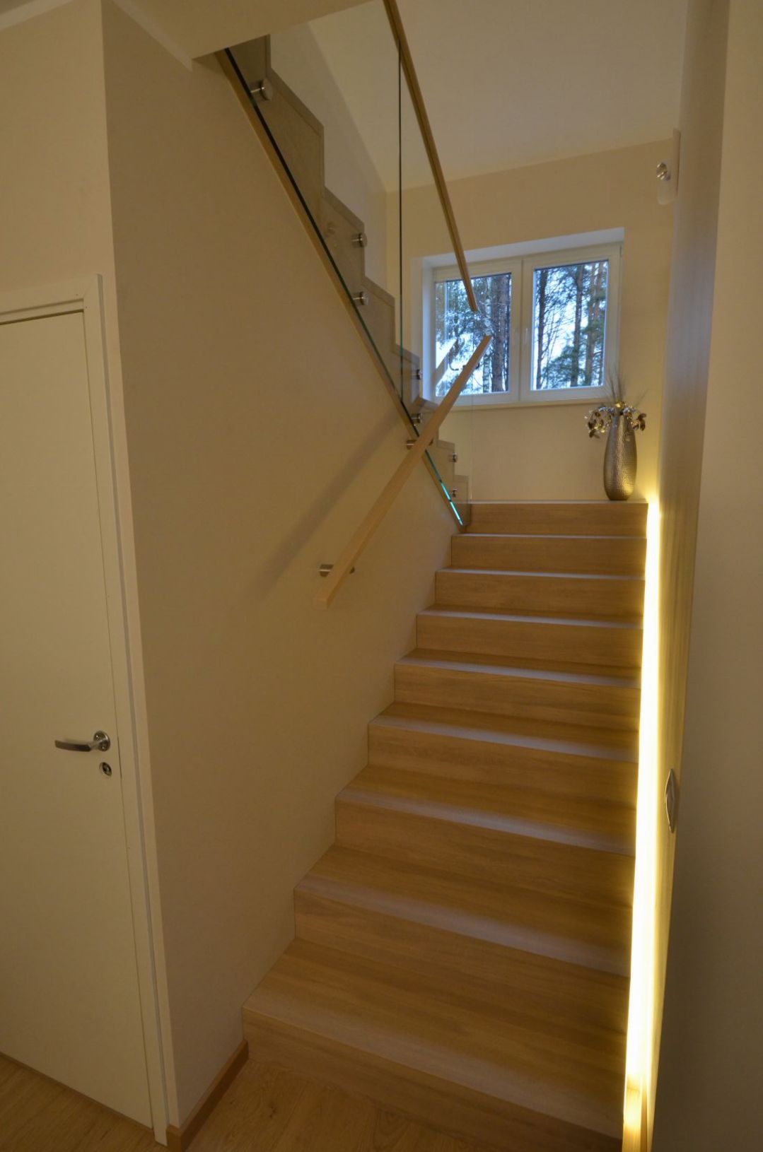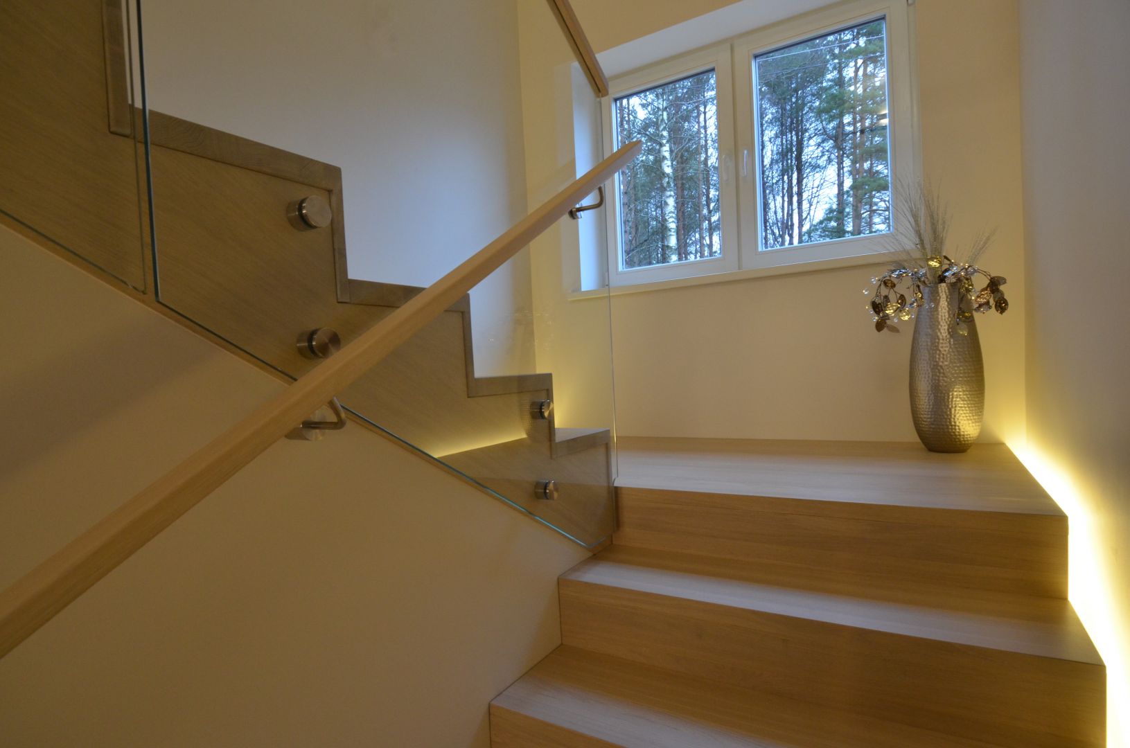Platvormiga u-trepp. Aste ja varvaslaud on omavahel kokku liimitud. Piirdeks 12 mm kirgas karastatud klaas.