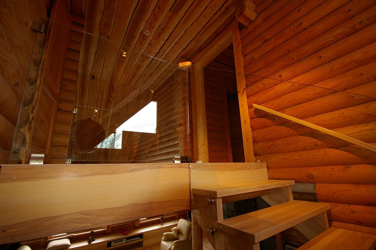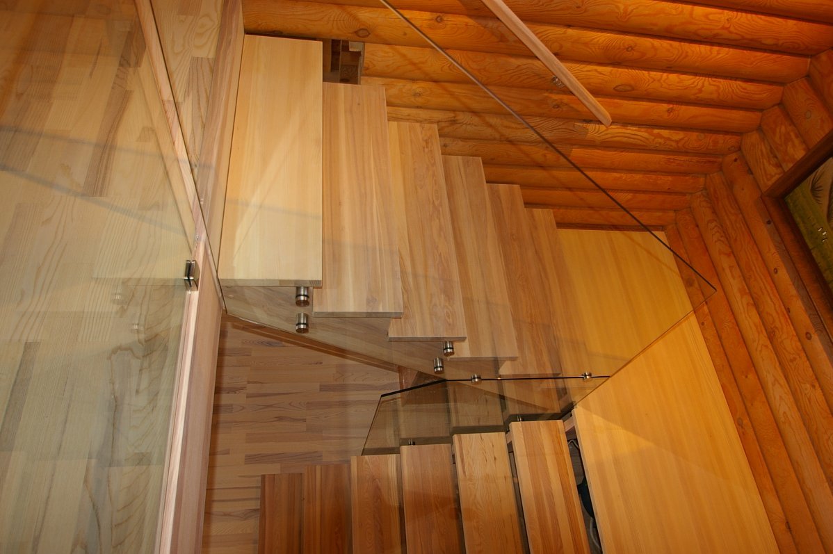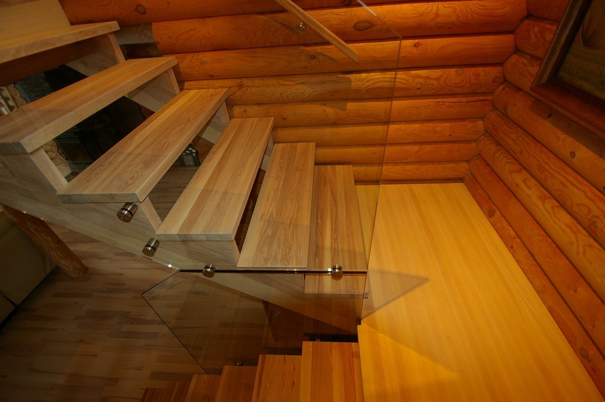 Ristvineerist trepi põsed spoonitud saarespooniga, astmed saare liimpuidust. Viimistlus valge õli. Piirdeks punktkinnitustega kinnitatud 12 mm kirgas karastatud klaas.