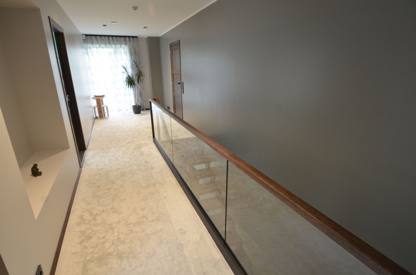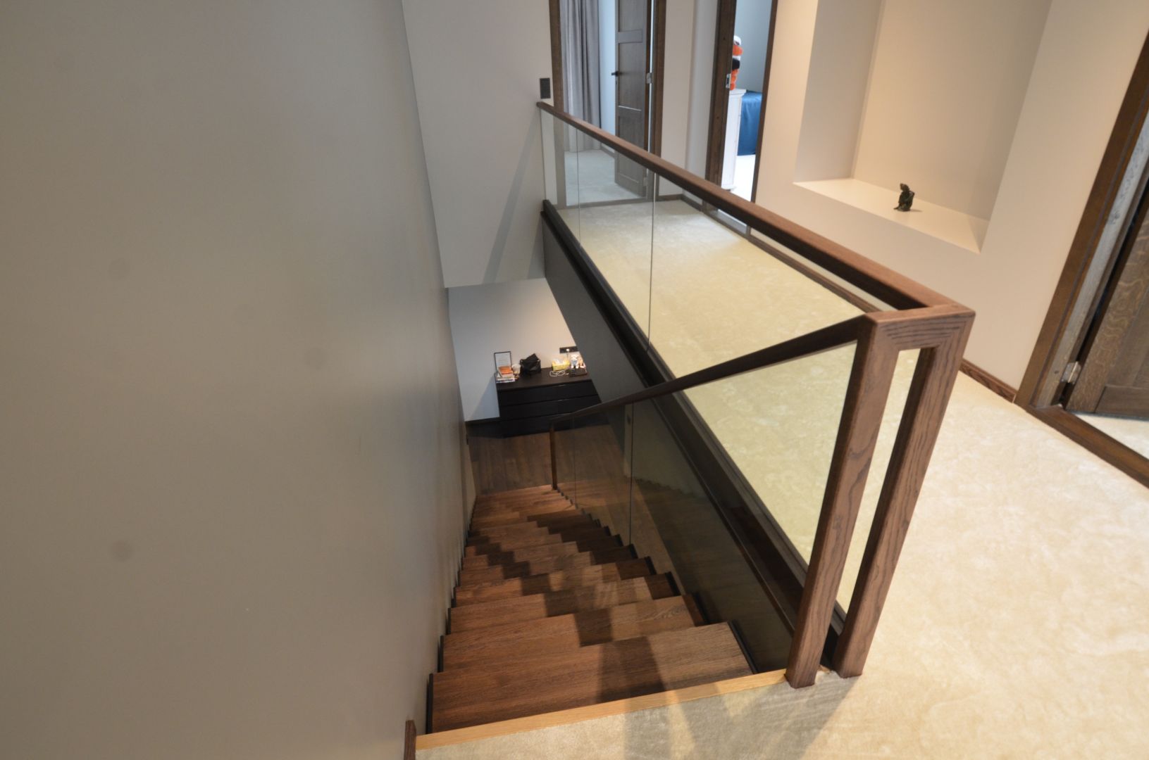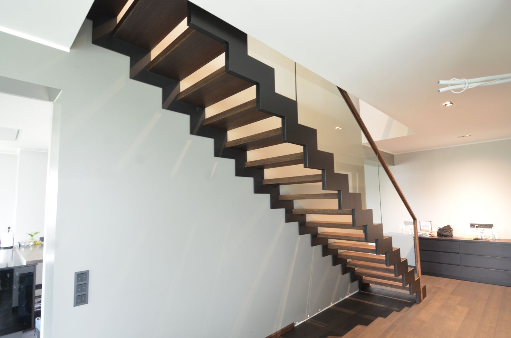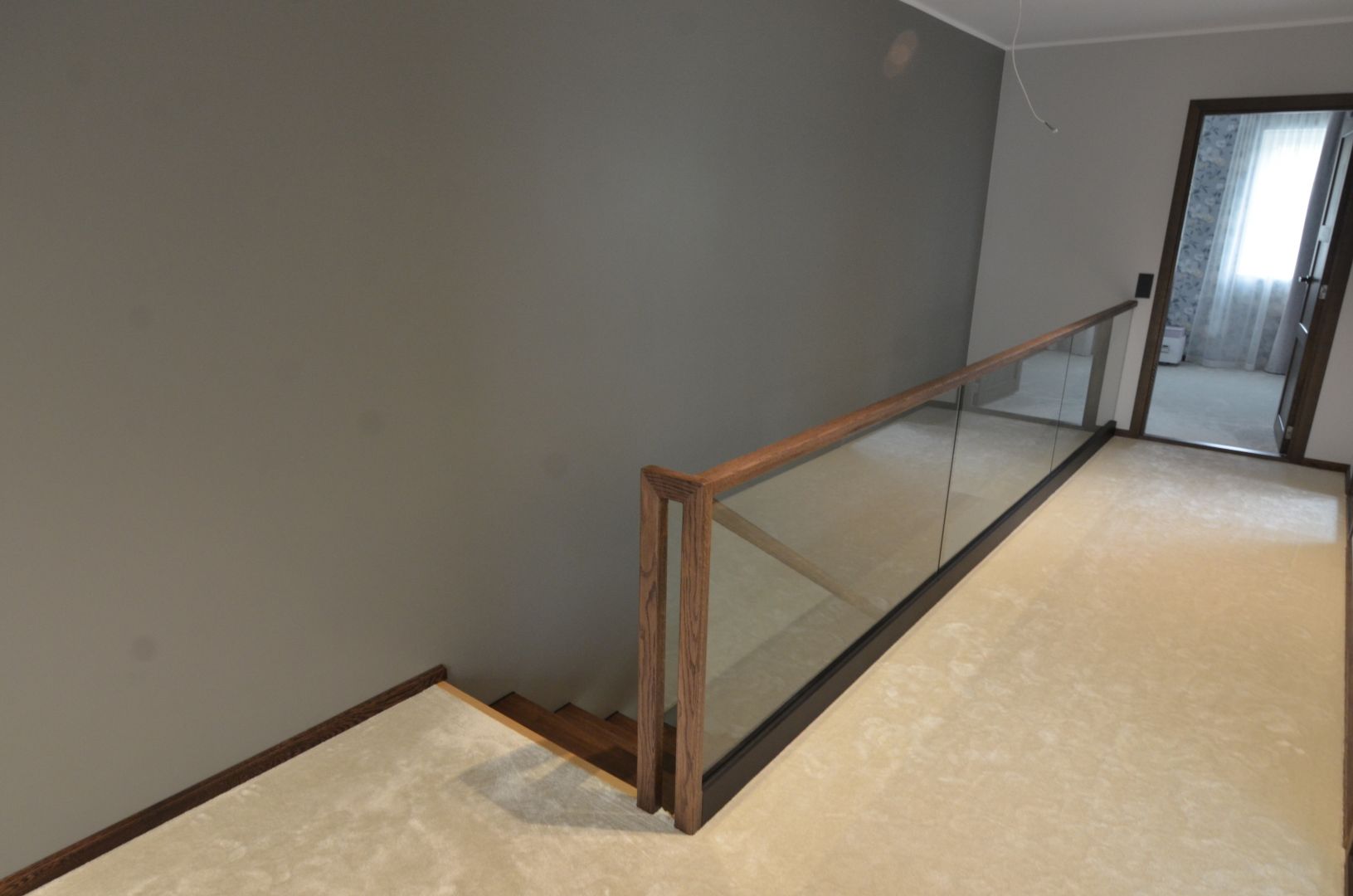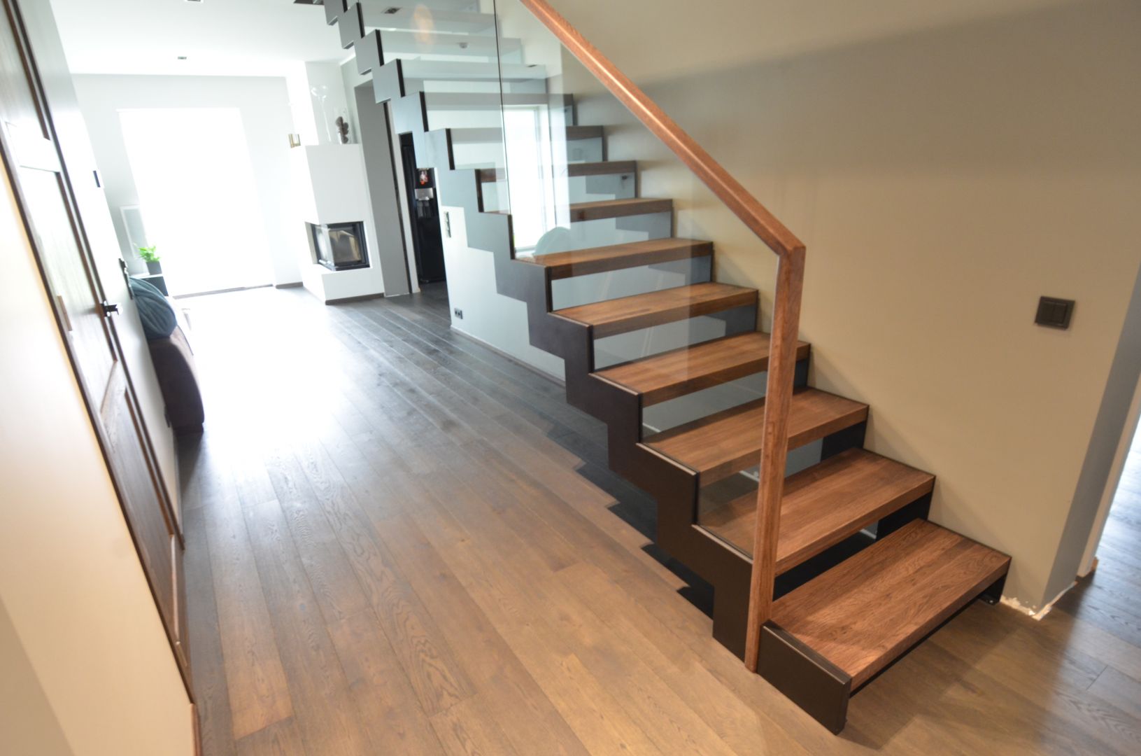 Kandekonstruktsioon 10mm teraslehest, astmed tamme liimpuidust, piirdeks kirgas karastatud klaas, mis on trepil kaetud metalli osas värvitud mdf plaadiga.