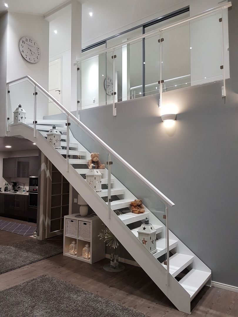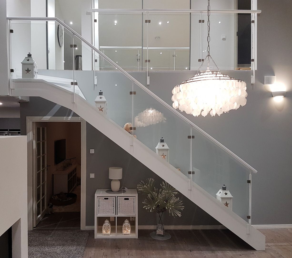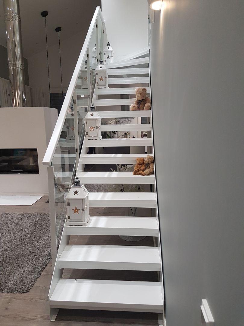 Sirge trepp, kandekonstruktsioon 6 mm paksusest teraslehest. Astmed kase ristvineerist ja värvitud valgeks, piirdeks karastatud ja lamineeritud 4+4 mm klaas.