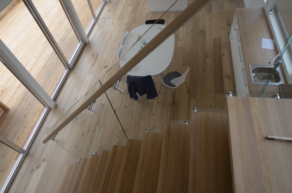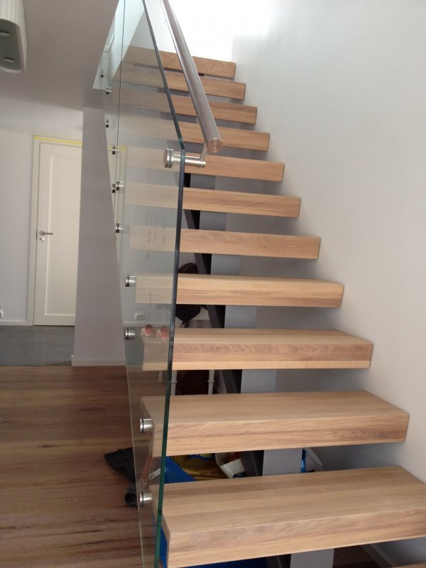 Sirge trepp, tala 100x150 mm astmed tamme liimpuidust. Piirdeks karastatud kirgas 12 mm klaas