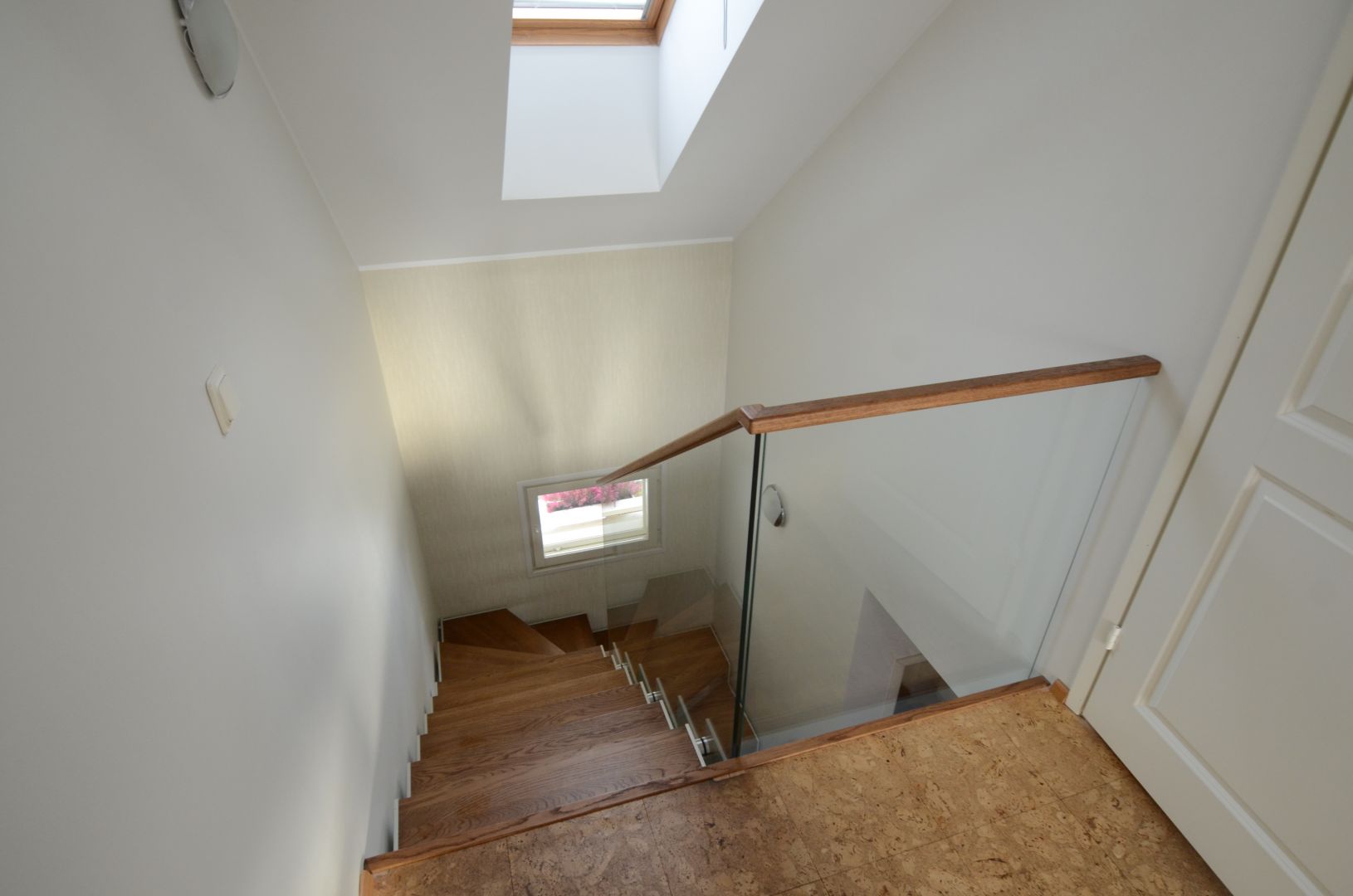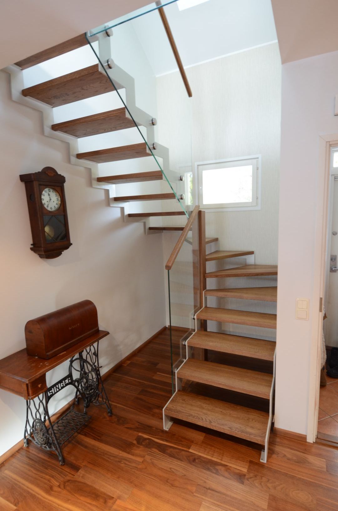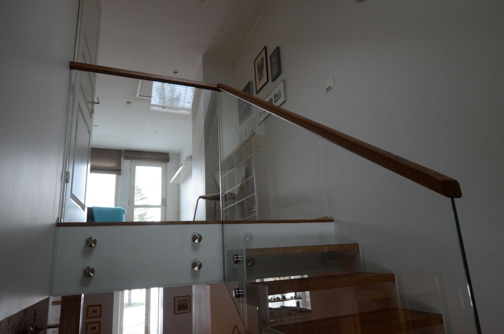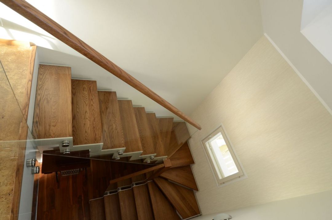 Tamme liimpuidust astmetega u- trepp, kandekonstruktsiooniks 10x100 mm sik-sak terasleht, piirdeks 12 mm kirgas karastatud klaas, peal tammest käsipuu 32x50 mm.