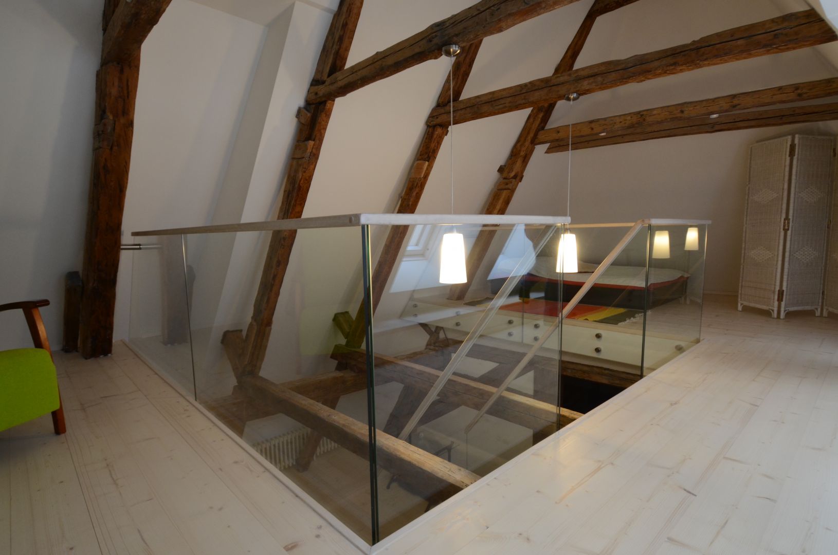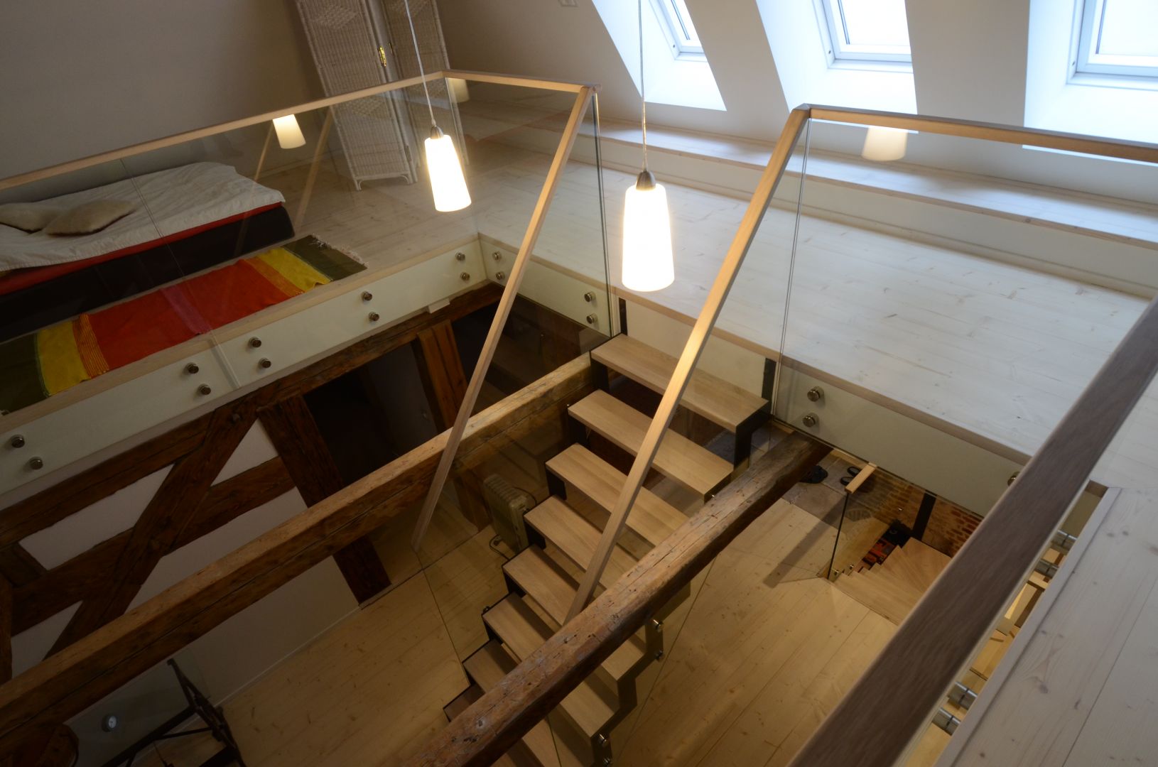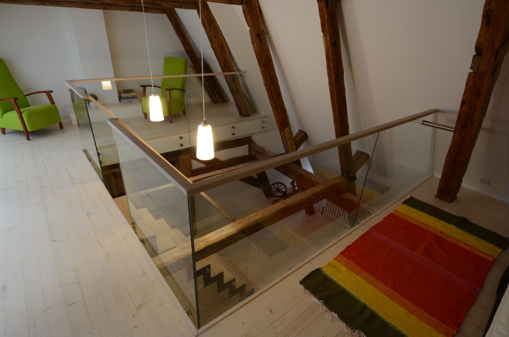 12 mm kirka klaasiga piire. Kinnitatud punktkinnitustega lae serva külge. Trepil tammest astmed ja teraskonstruktsioon