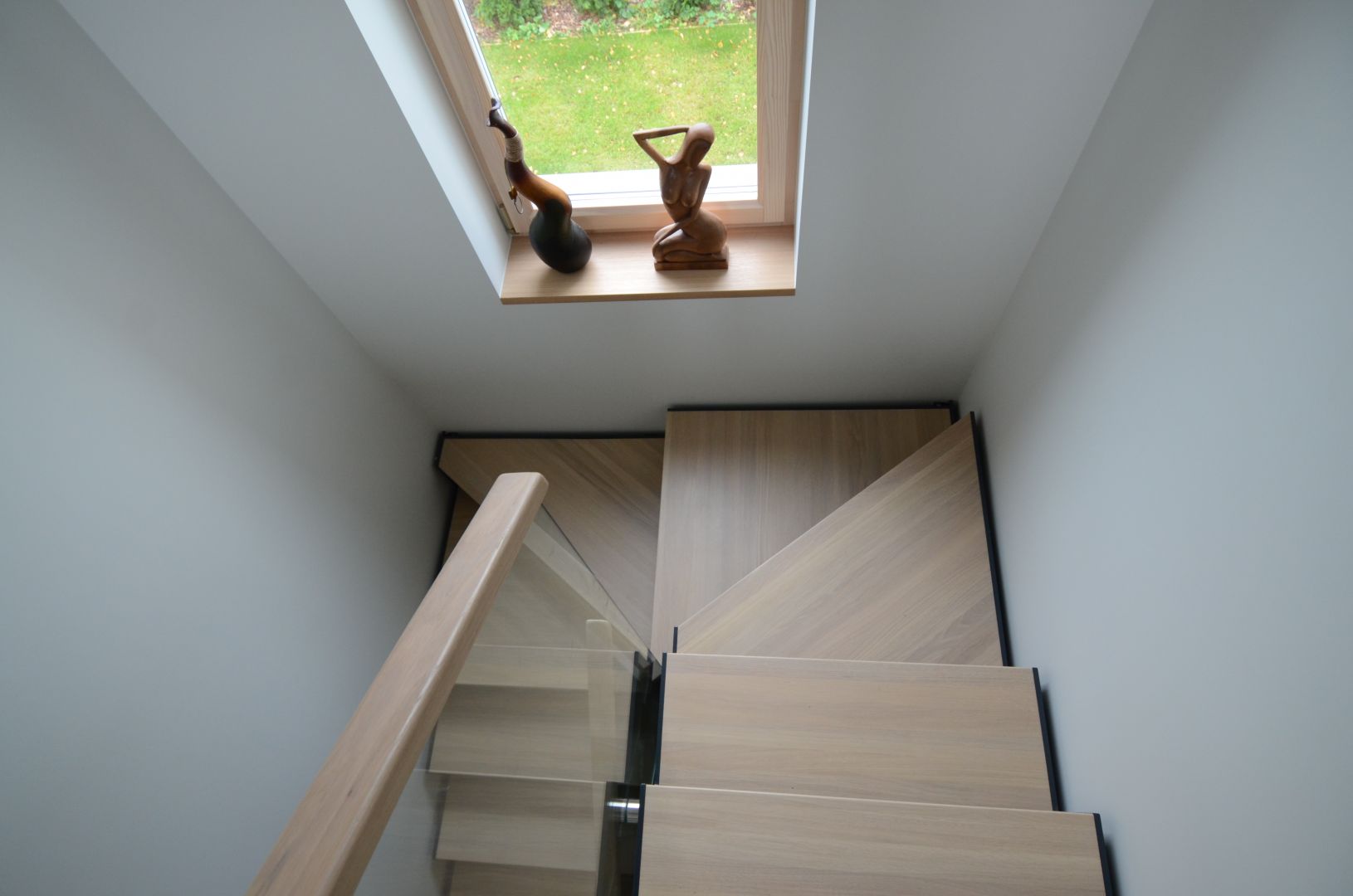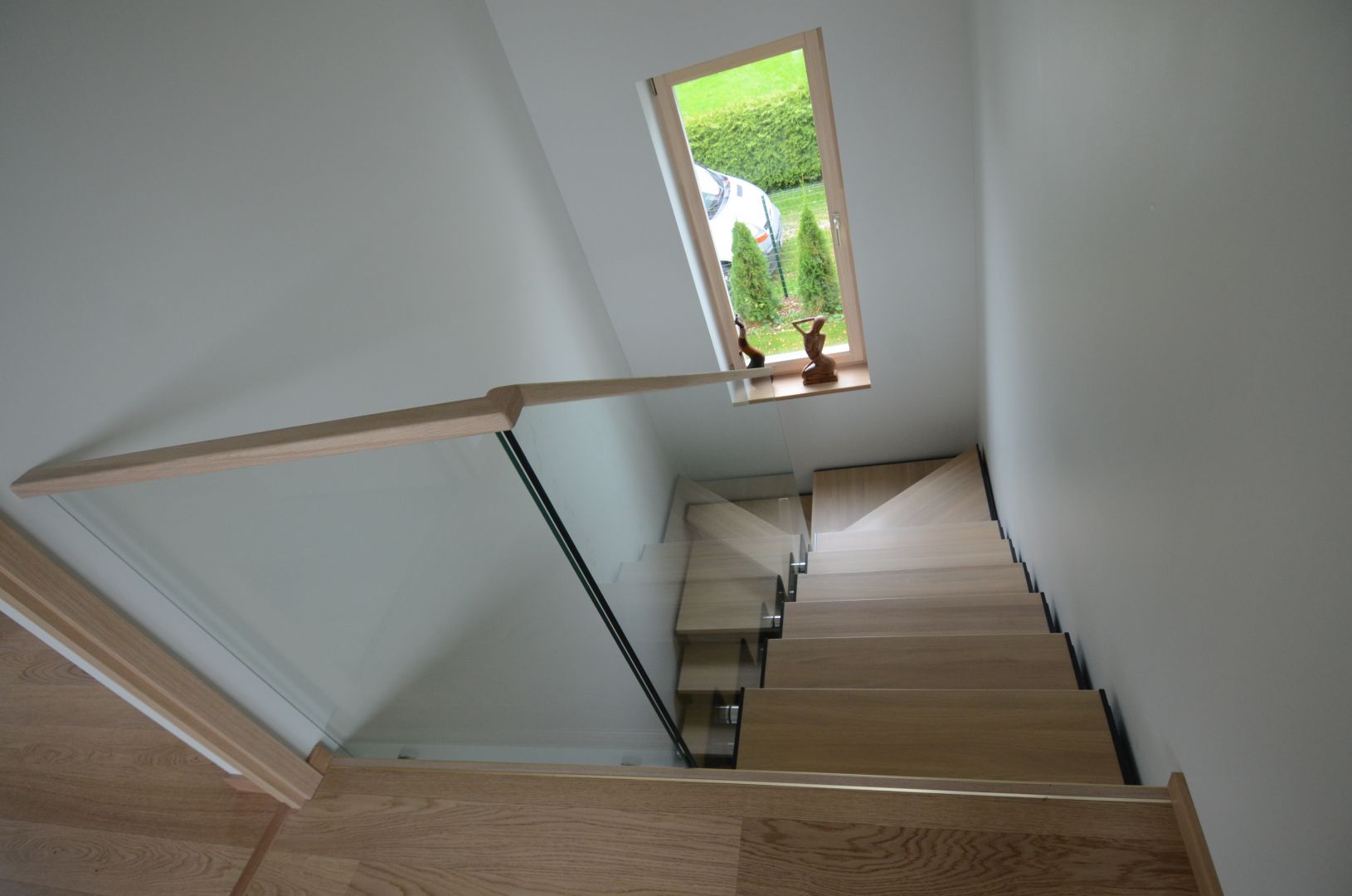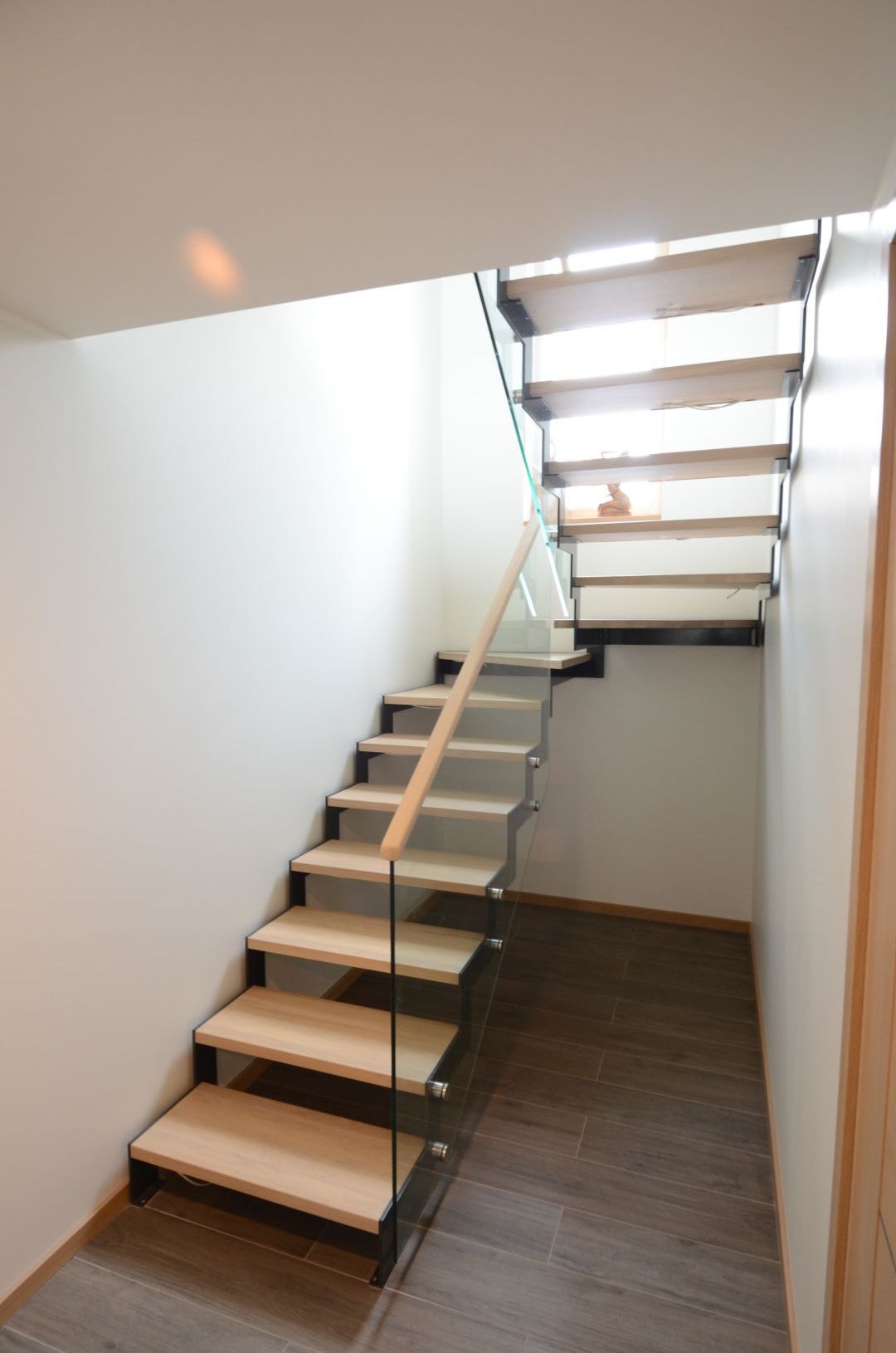 U- trepp. Kandekonstruktsioon 10x100 mm sik-sak teraslehest. Astmed tamme liimpuidust, paksusega 40 mm. Piirdeks kirgas karastatud 12 mm klaas, mis on punktkinnitustega kinnitatud teraslehe külge. klaasil peal tammest käsipuu.