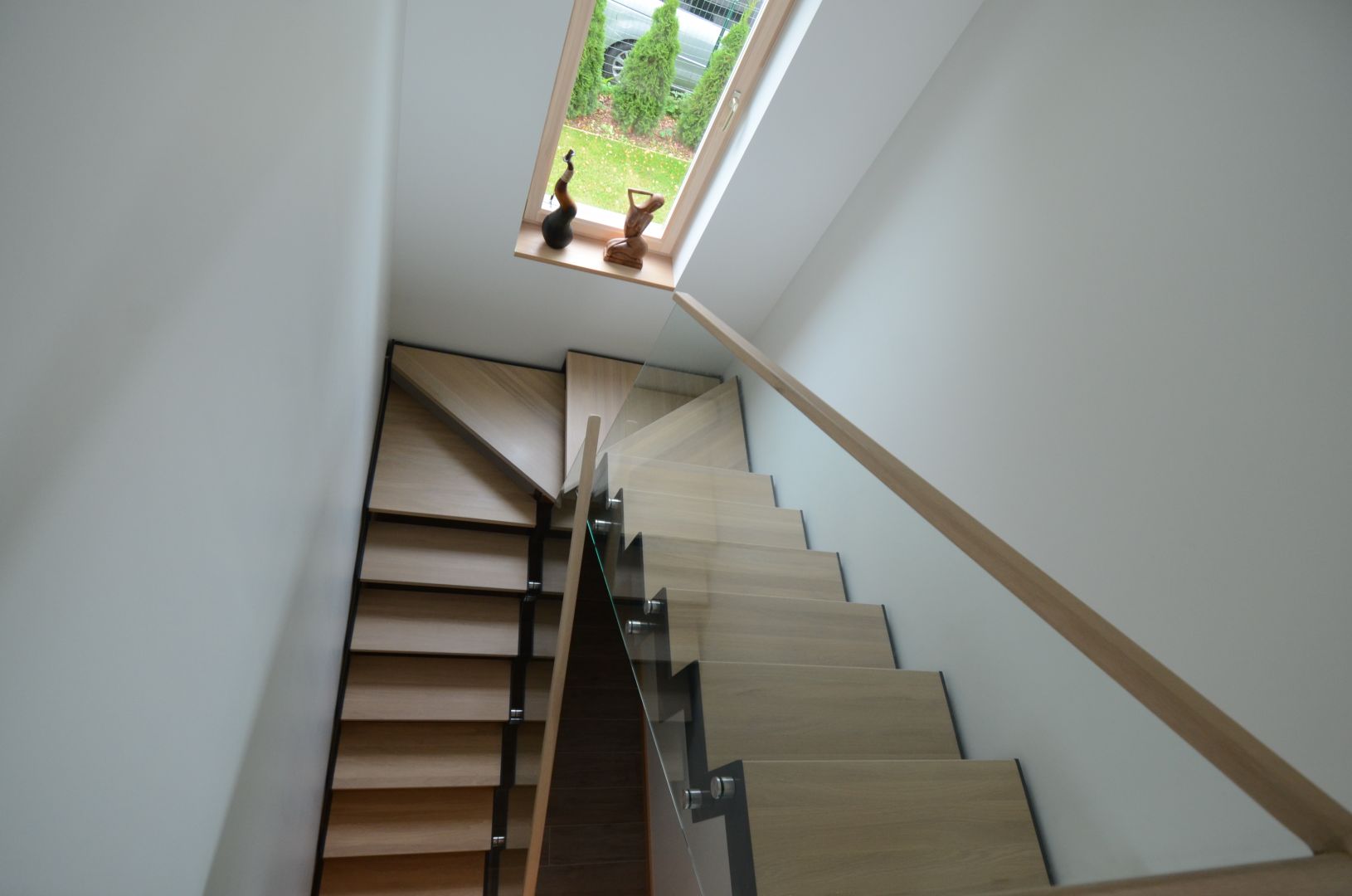 U- trepp. Kandekonstruktsioon 10x100 mm sik-sak teraslehest. Astmed tamme liimpuidust, paksusega 40 mm. Piirdeks kirgas karastatud 12 mm klaas, mis on punktkinnitustega kinnitatud teraslehe külge.