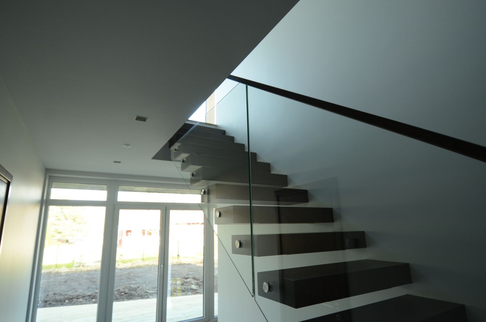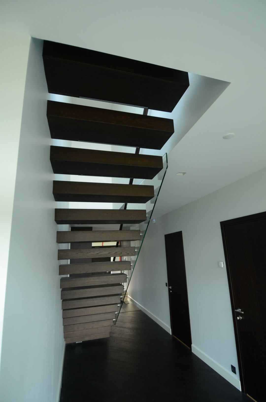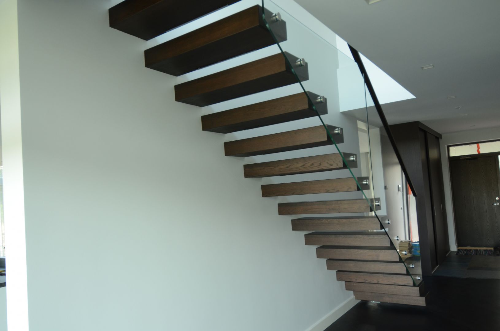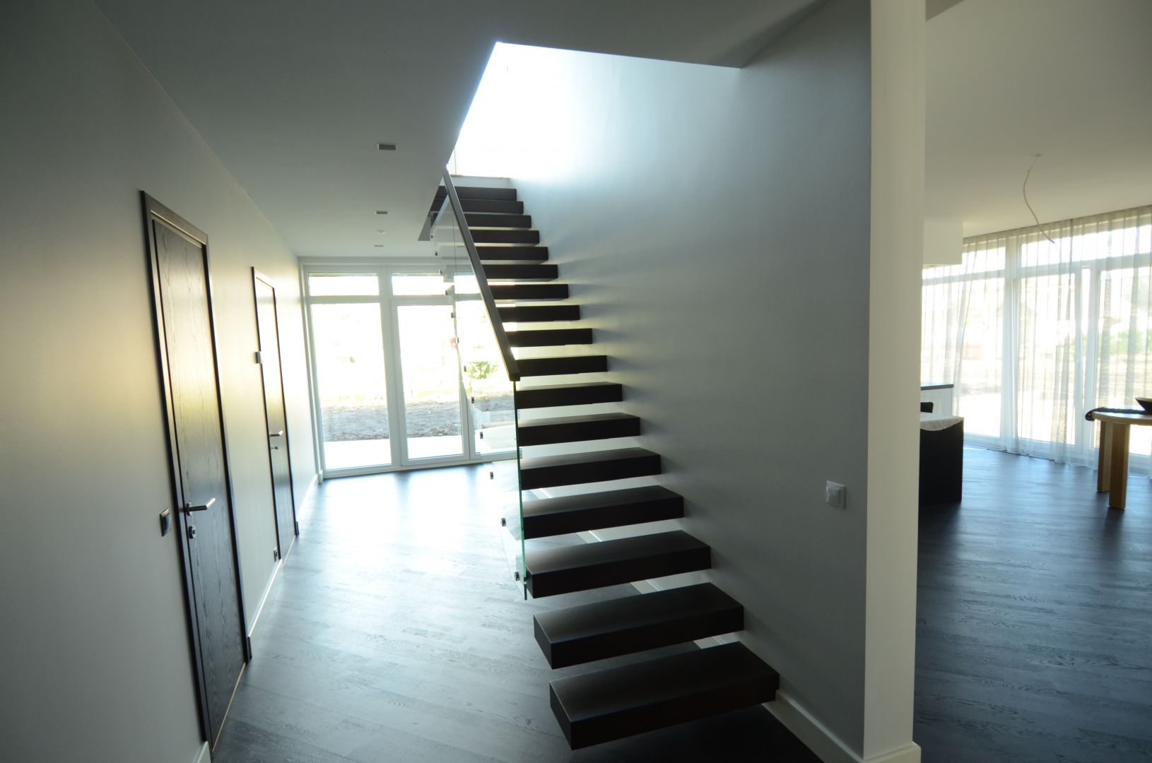 Konsooltrepp. Konsoolid seina sisse süvistatud. Astmed tamme liimpuidust paksusega 113 mm. Piirdeks kirgas karastatud 12 mm klaas.