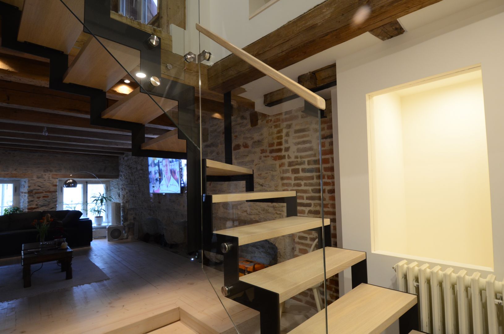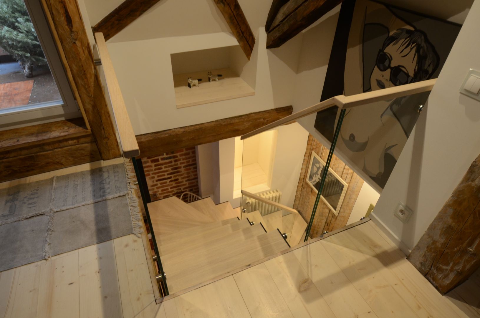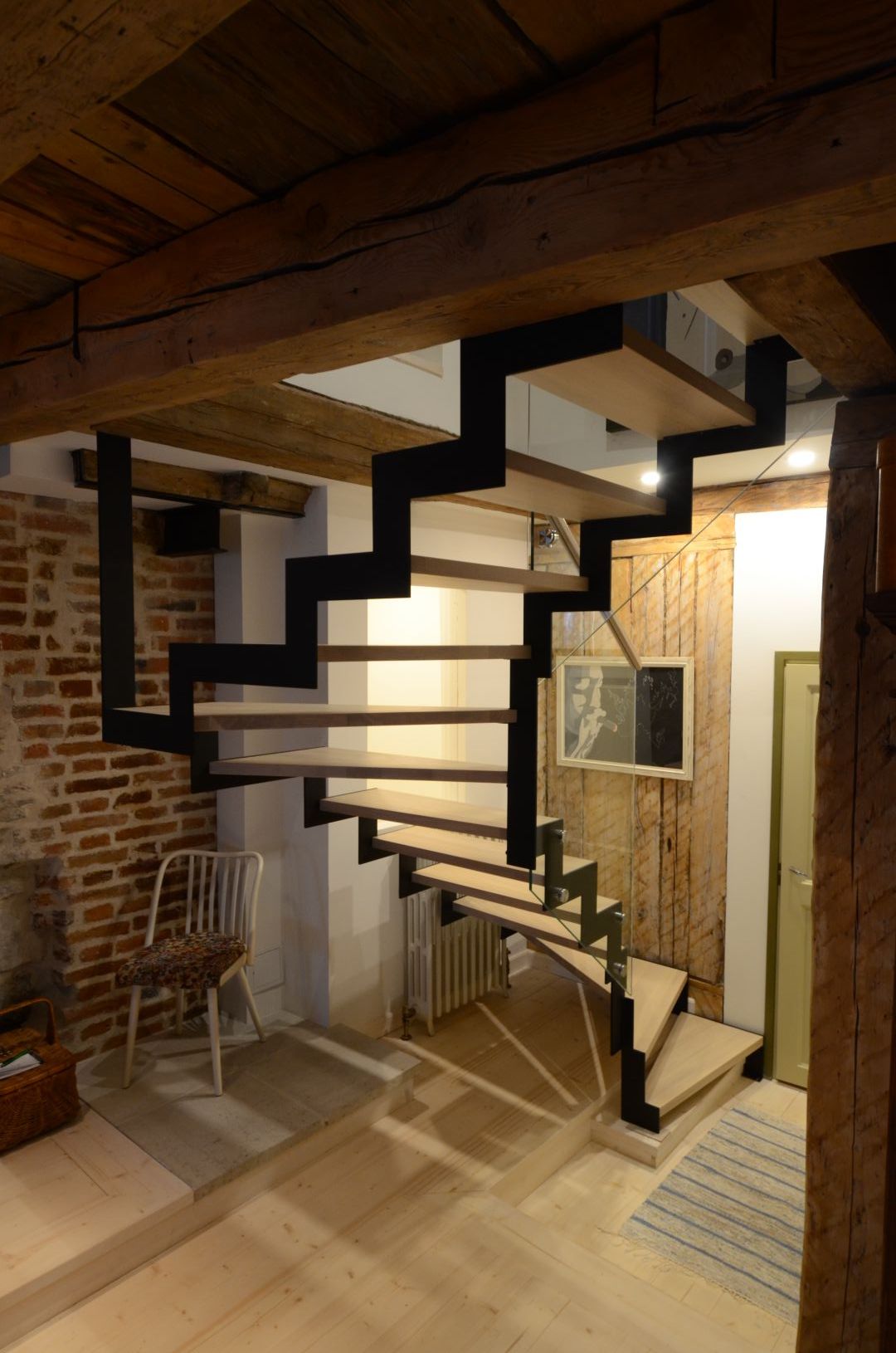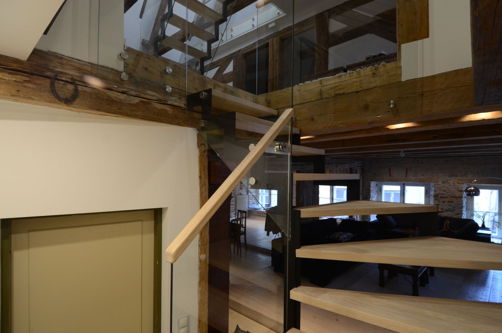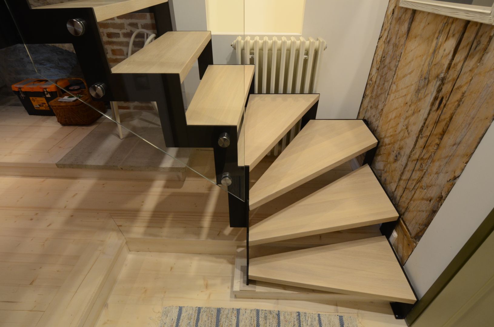 Kandekonstruktsioon 10x100 mm sik-sak teraslehest, astmed tamme liimpuidust. Piirdeks kirgas 12 mm karastatud klaas.