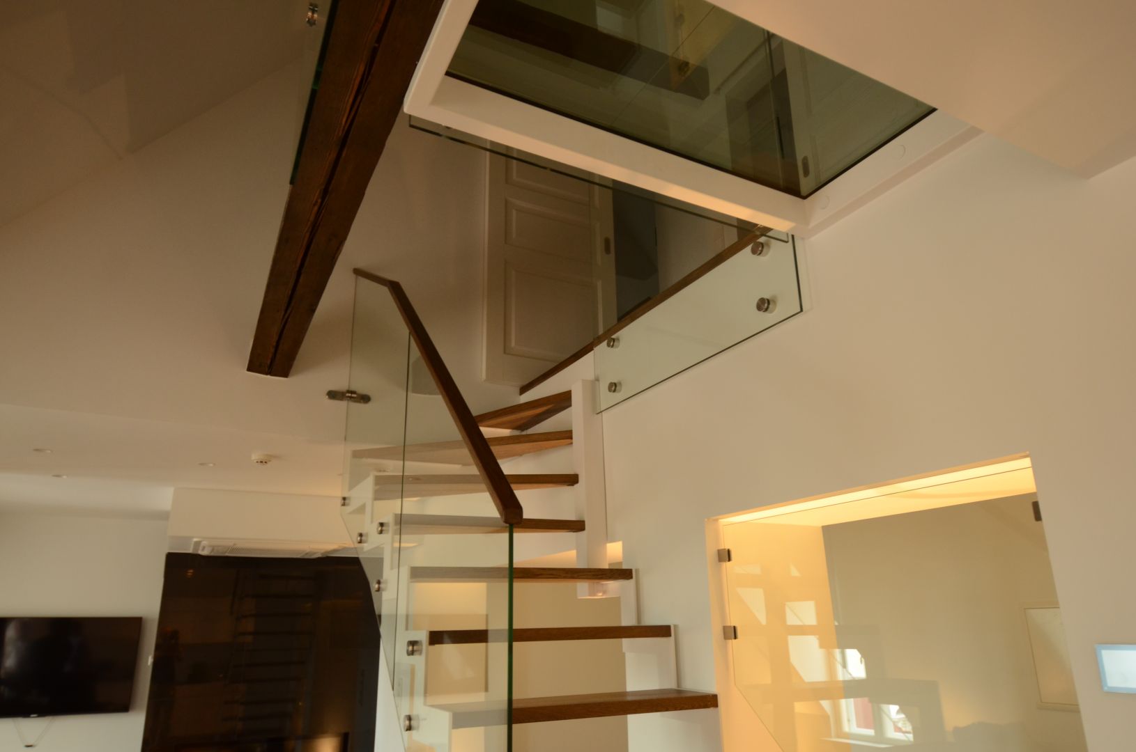 Kandekonstruktsioon 10x100 mm sik-sak teraslehest, astmed tamme liimpuidust. Piirdeks kirgas karastatud 12 mm kirgas klaas.
