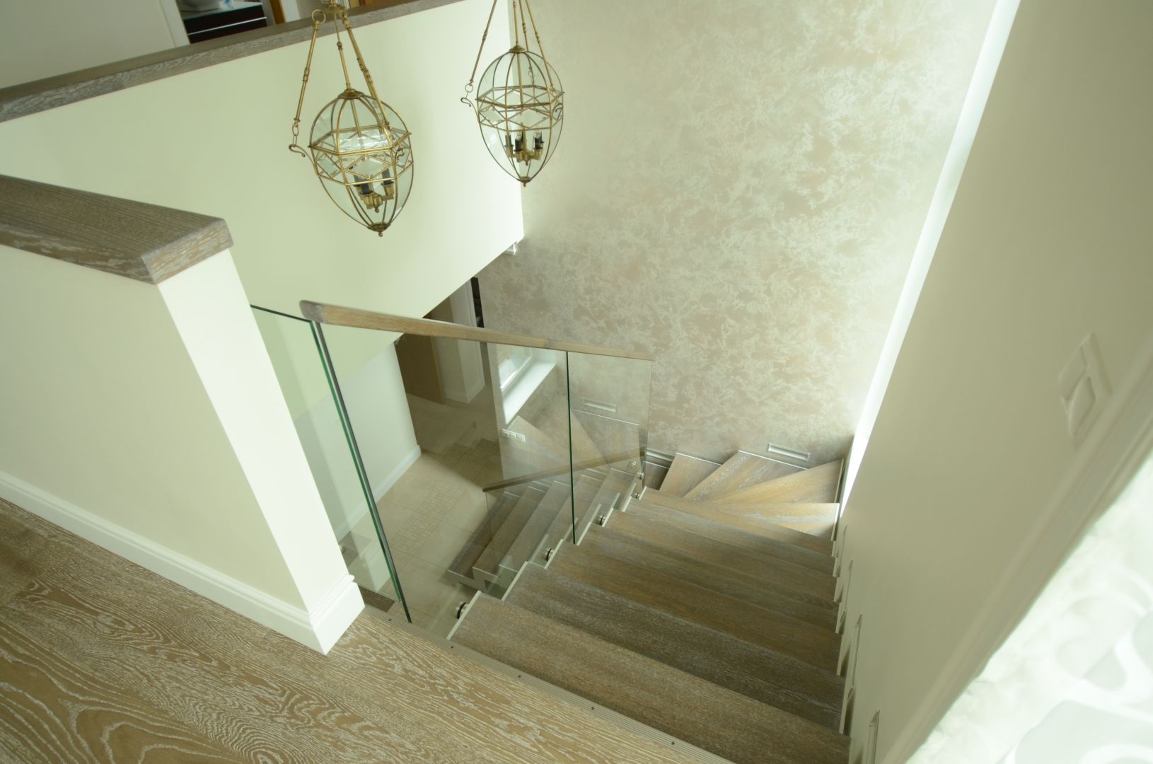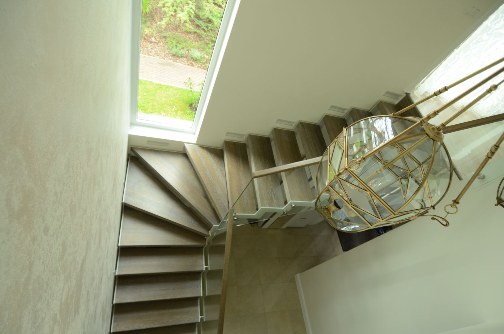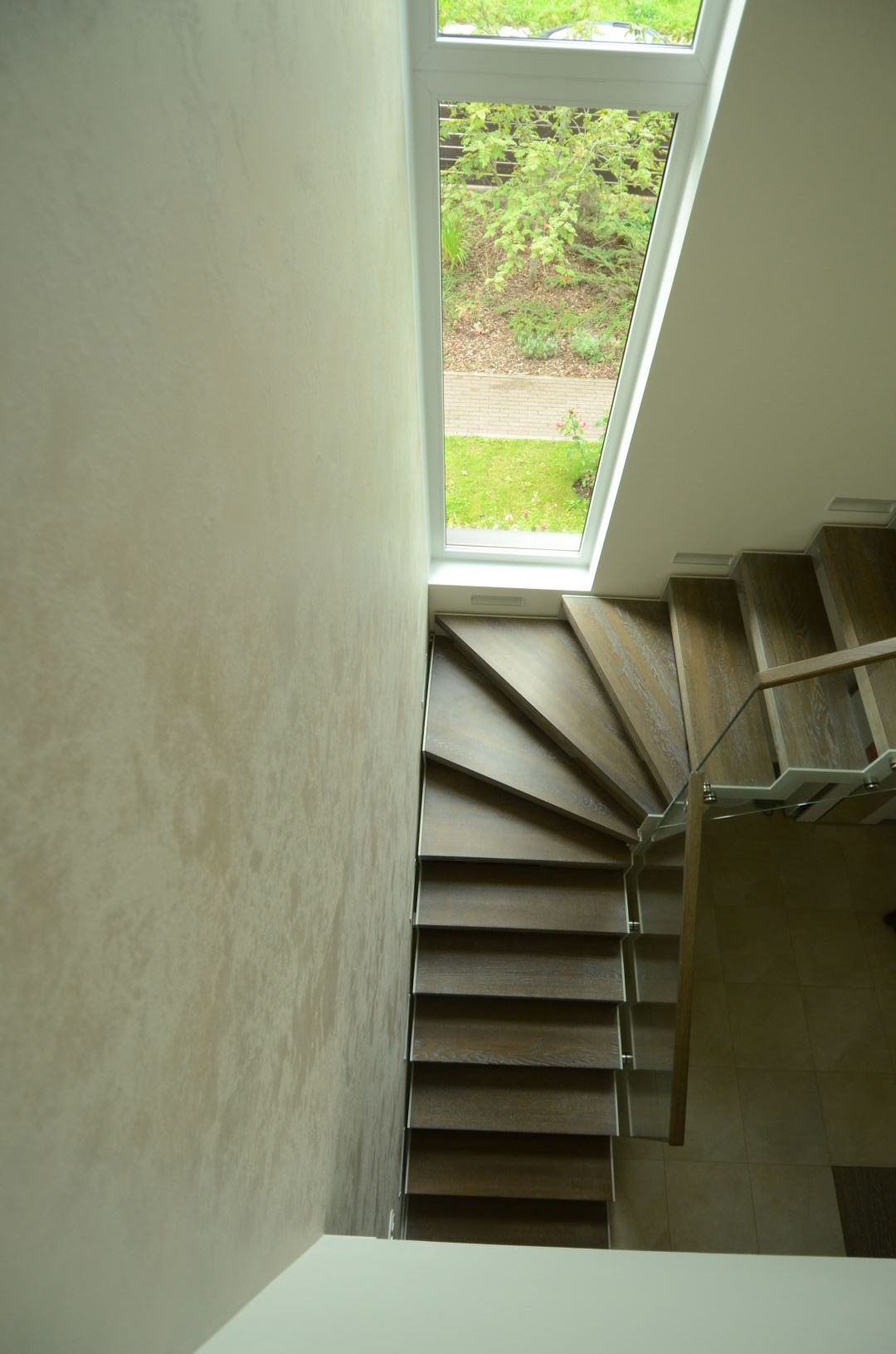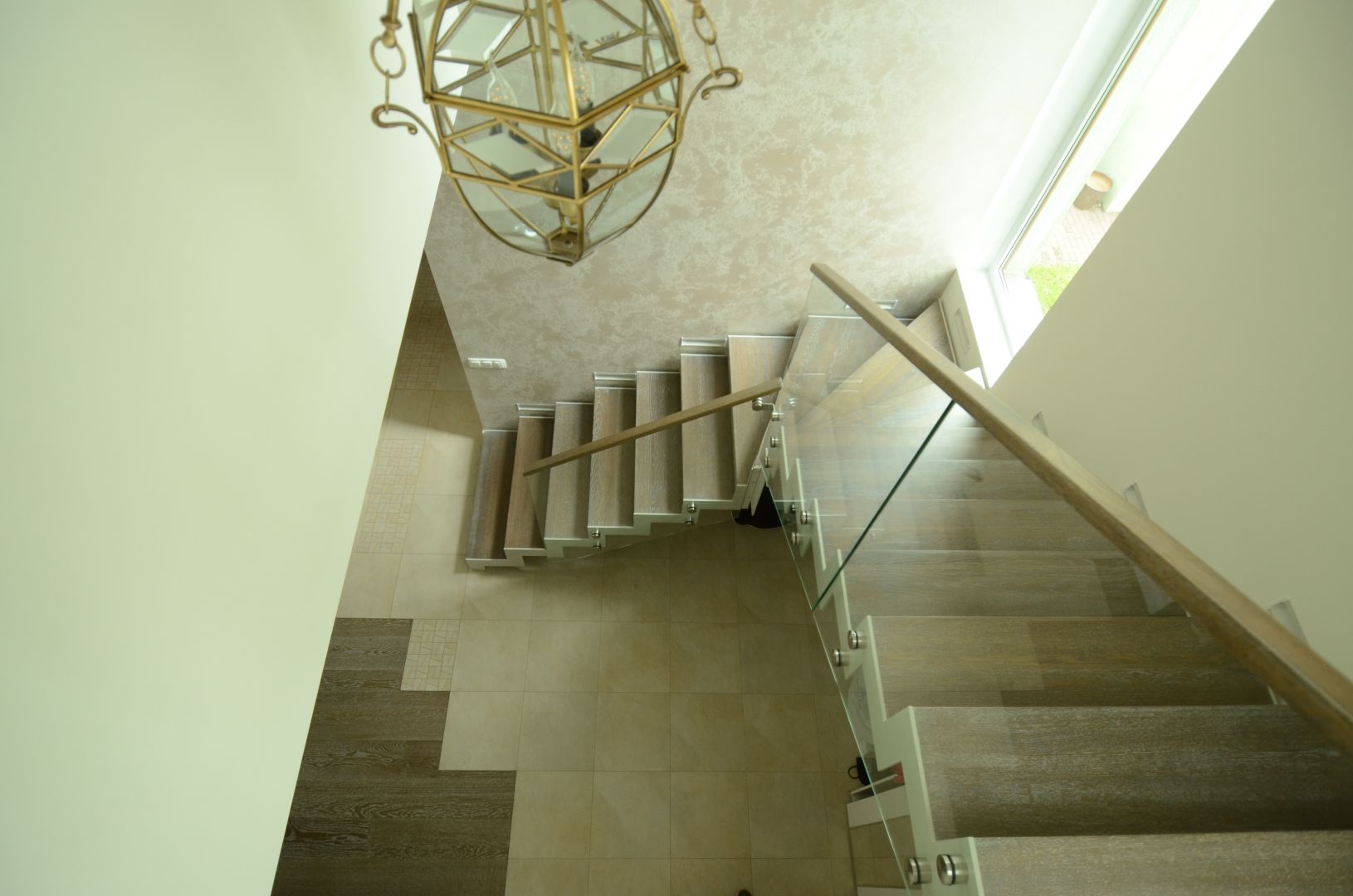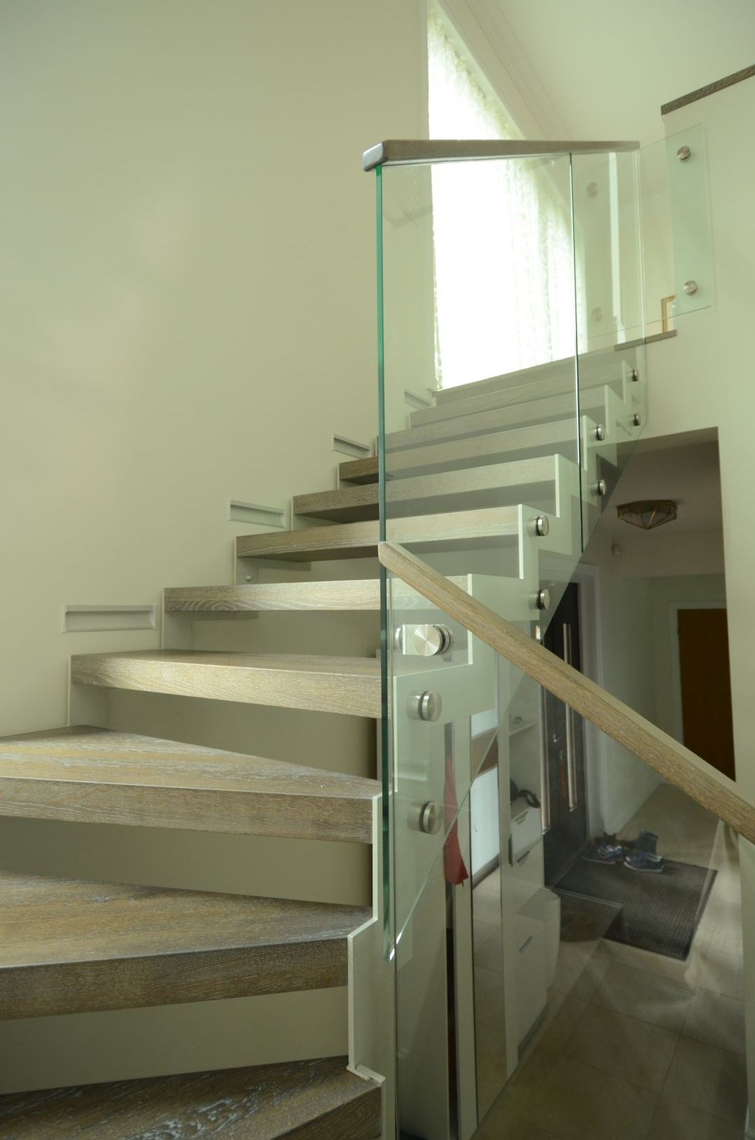L-trepp. Kandekonstruktsioon 10x100 mm sik-sak teraslehest. Astmed tamme liimpuidust, paksusega 60 mm. Piirdeks kirgas karastatud 12 mm klaas.