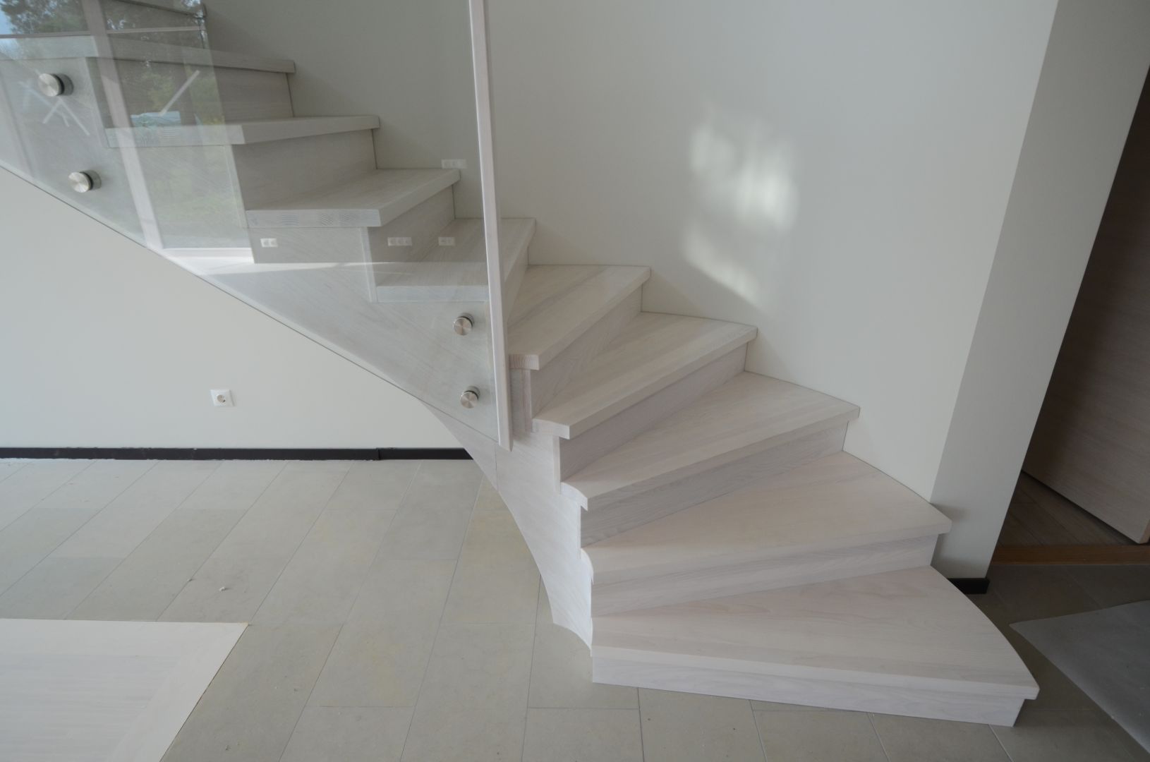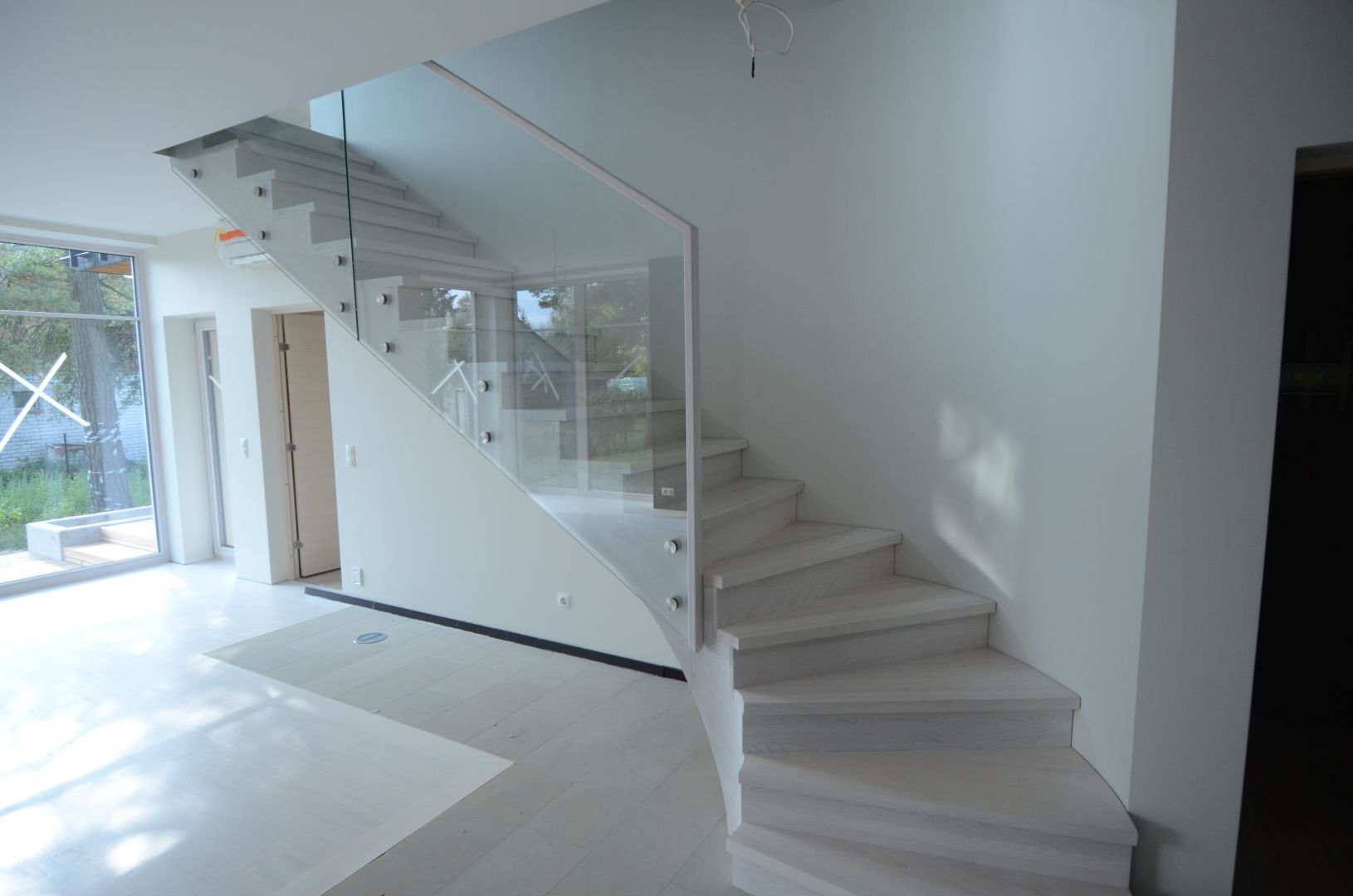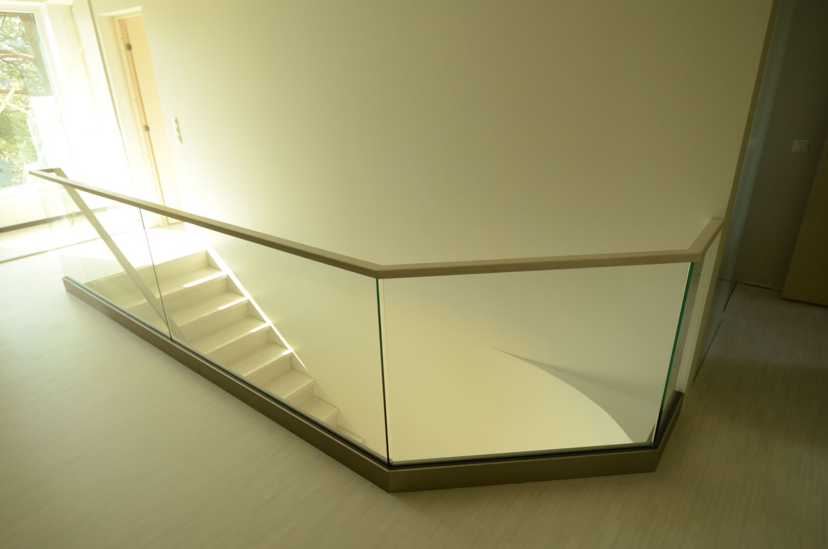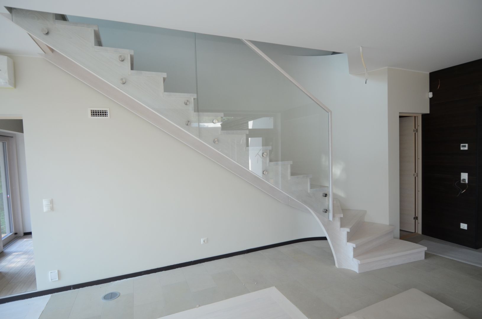 Ristvineerist põsepuud, kaetud saarespooniga. Piirdeks kirgas 12 mm karastatud klaas. Viimistlus valge õli.