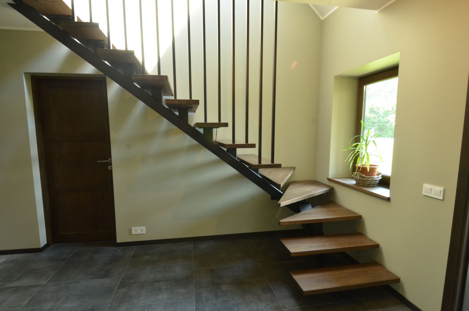 Ühetala metalltrepp, tala 100x150 mm. Astmed tamme liimpuidust. piireteks 20x40 mm nelikanttorust postid.