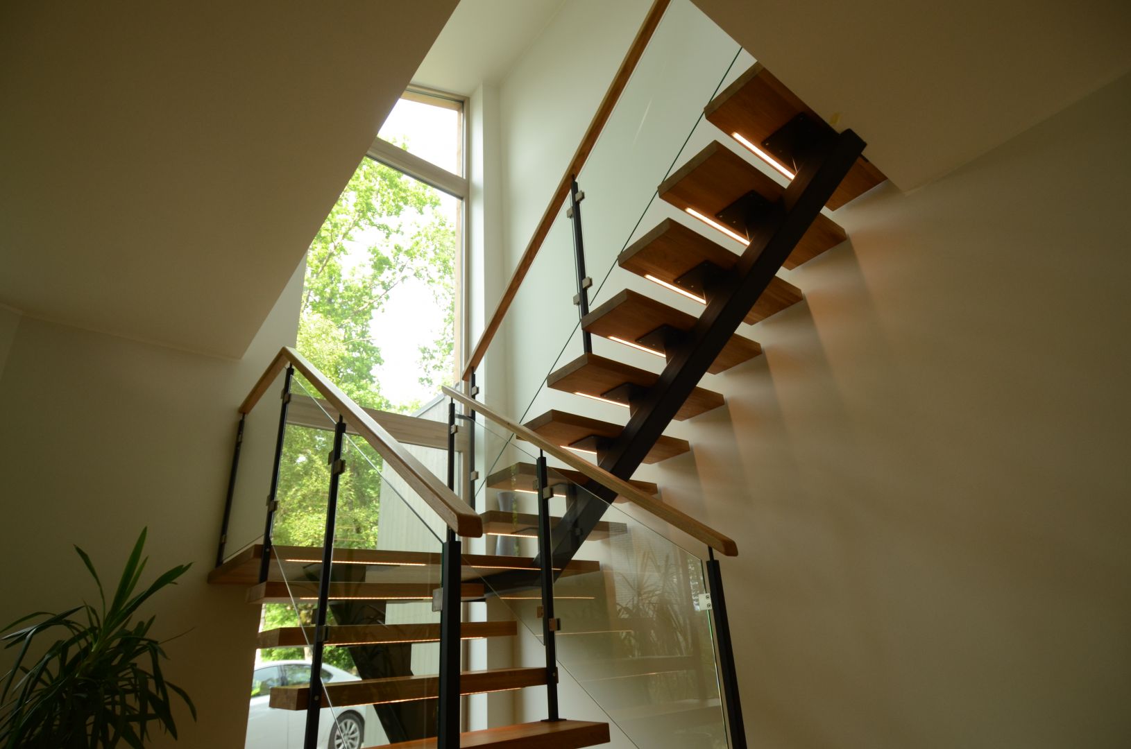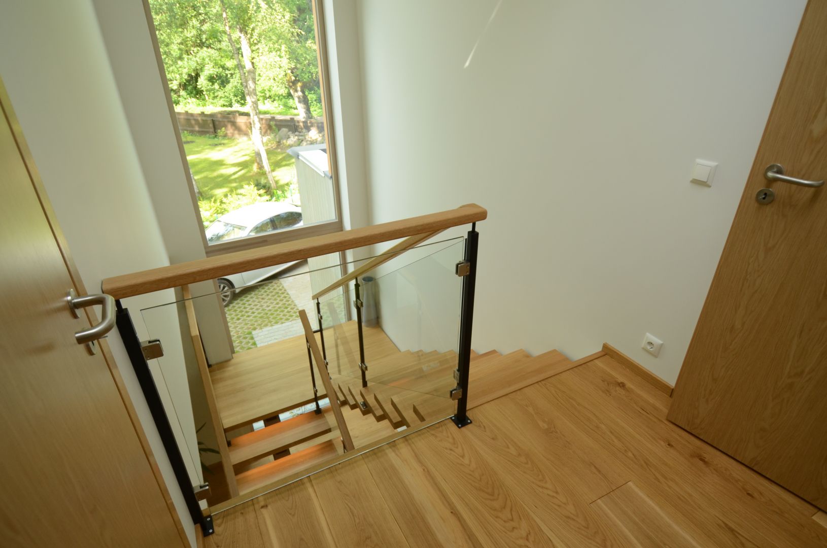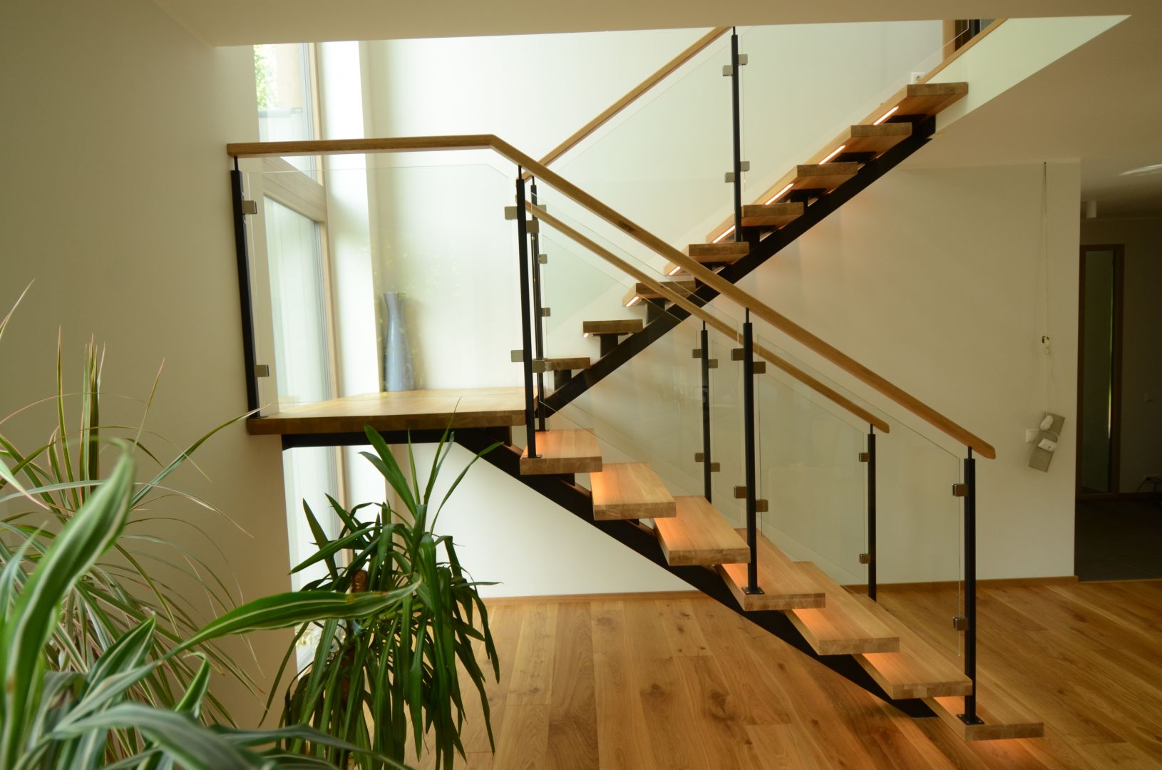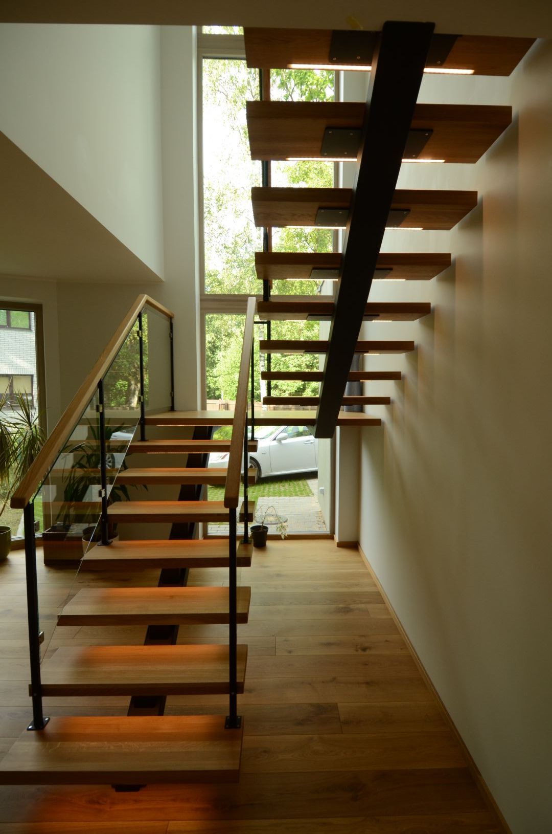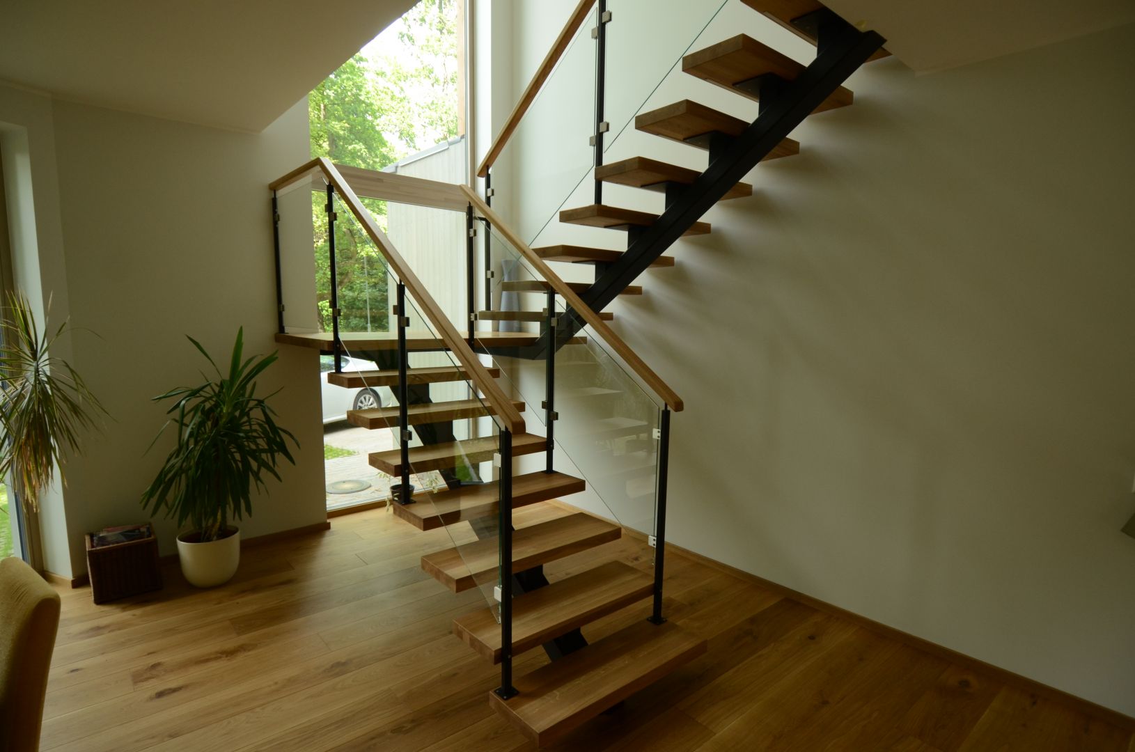 Ühetala trepp. Tala 100x150 mm nelikanttorust. Astmed tamme liimpuidust paksusega 57 mm. Piirdeks kirgas 8 mm karastatud klaas.