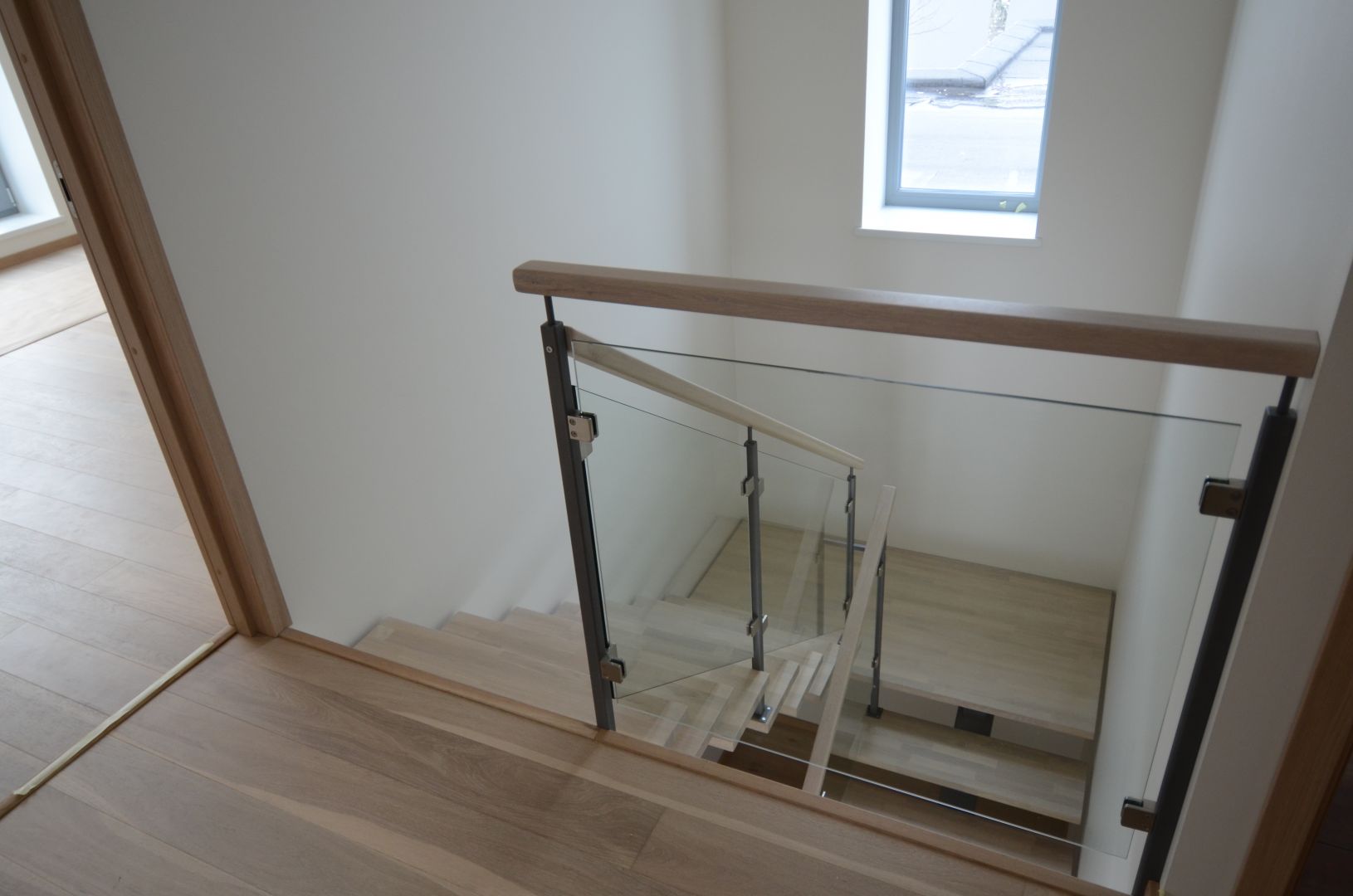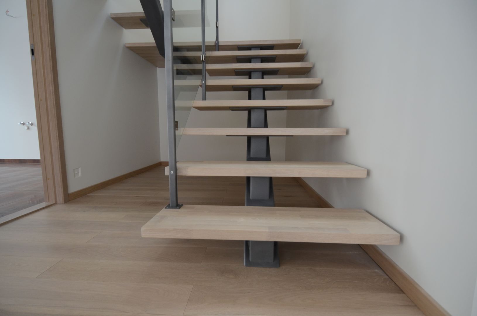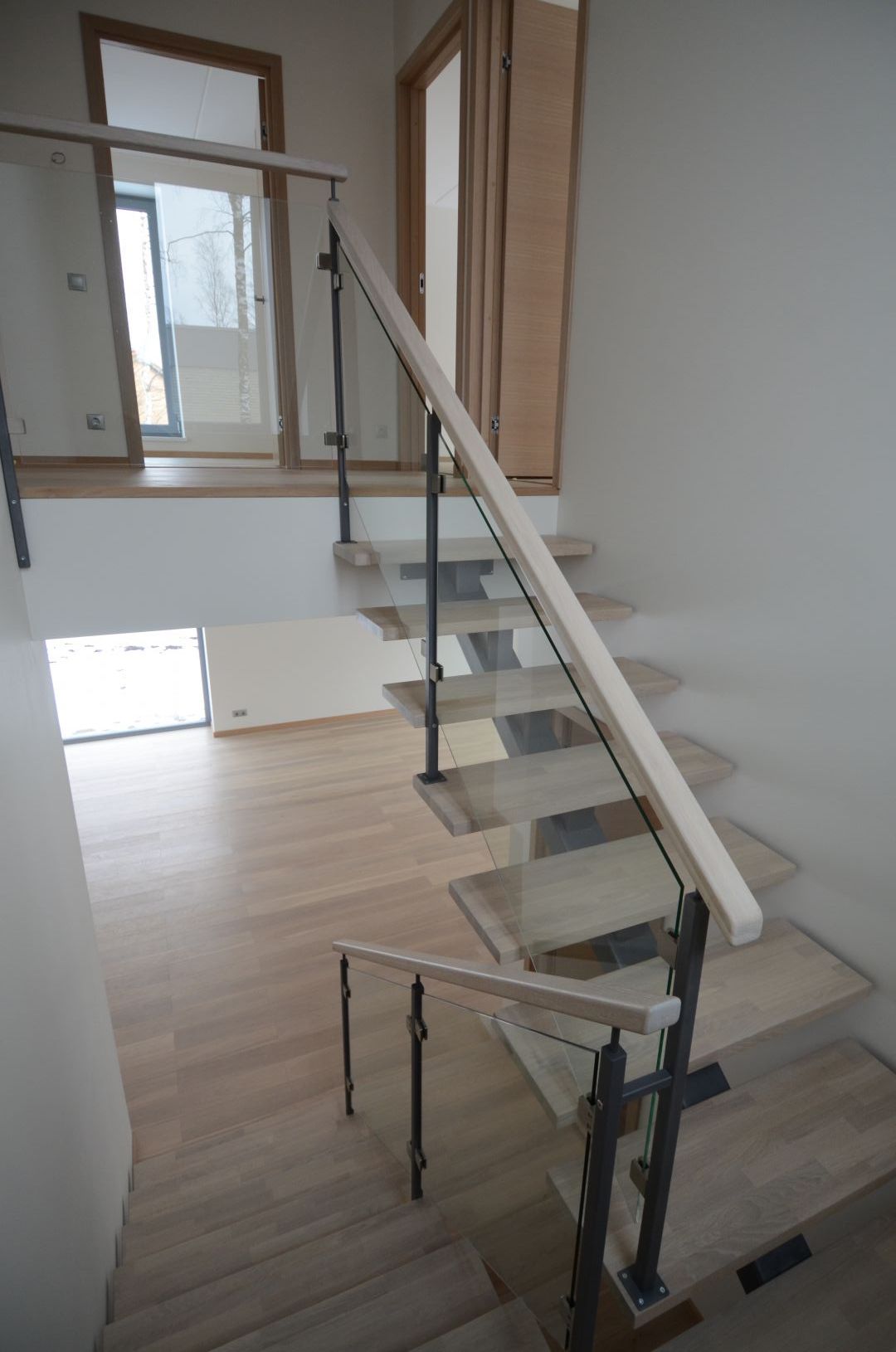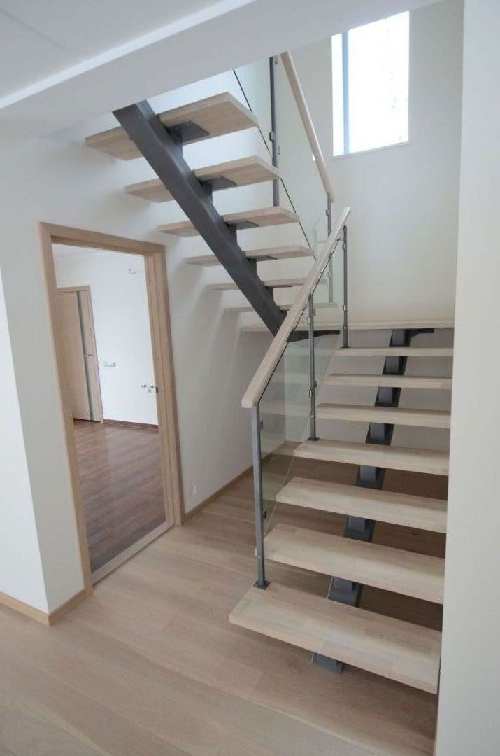 Ühetala metalltrepp, tala 100x150mm. Astmed tamme liimpuidust, piirdeks 8 mm karastatud kirgas klaas.