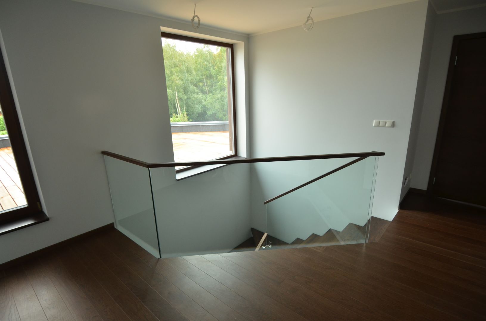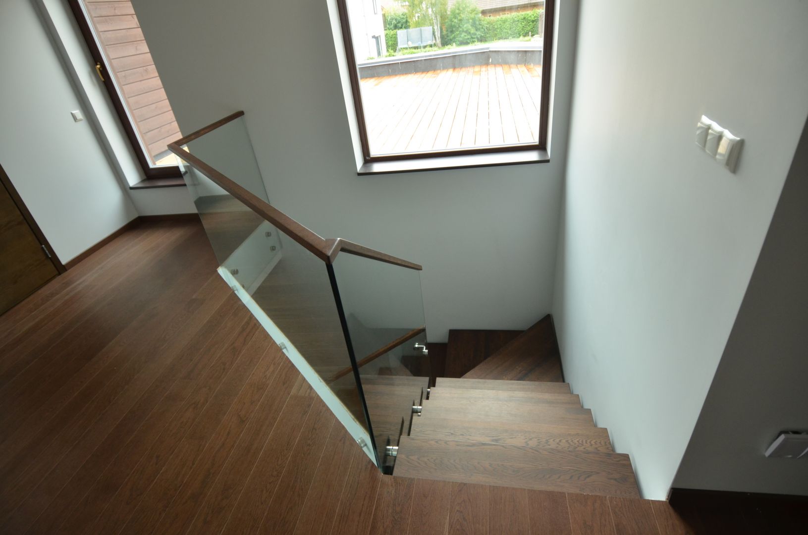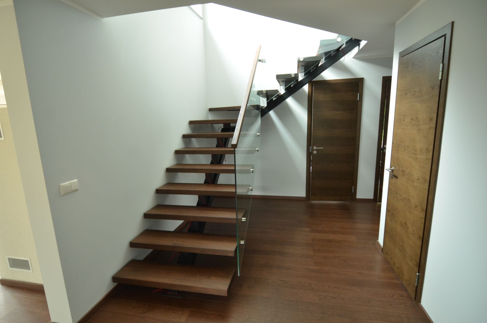 Ühetala metalltrepp, tala 100x150mm nelikanntorust, astmed tamme liimpuidust paksusega 57 mm. Piireteks 12 mm kirgas karastatud klaas.