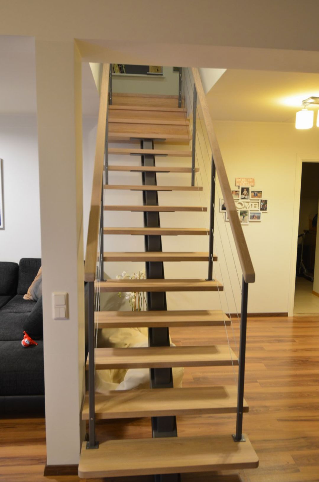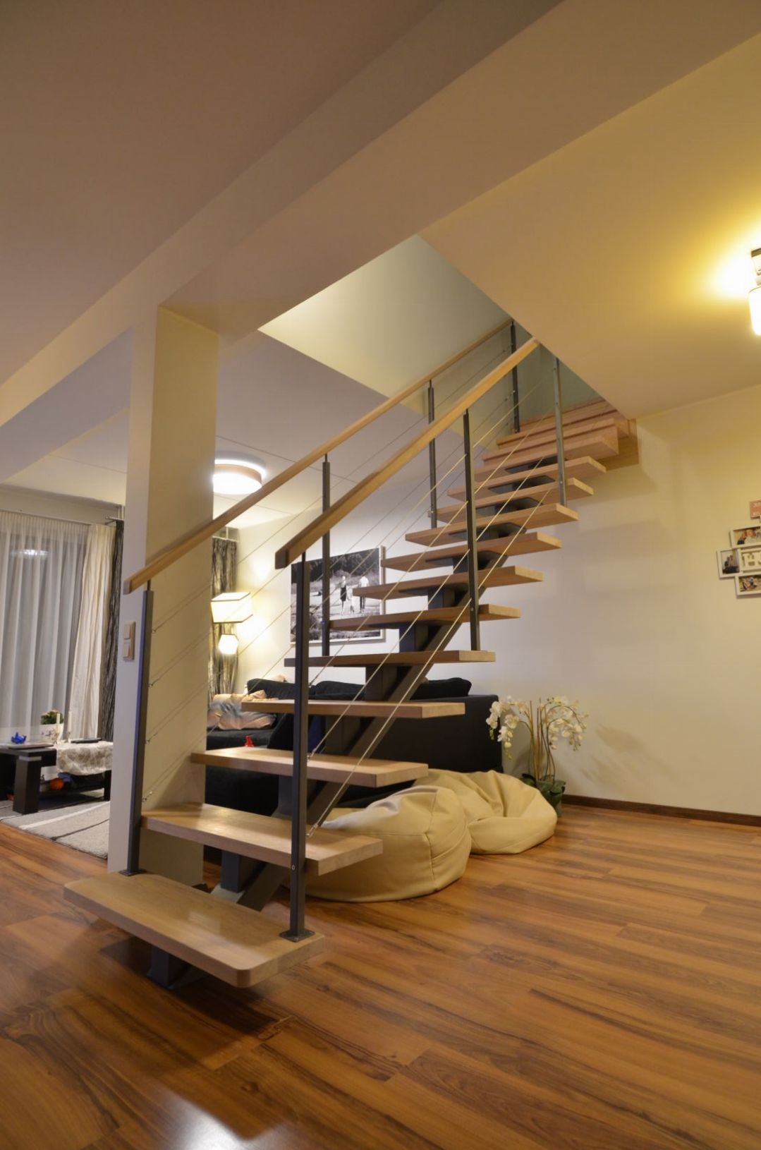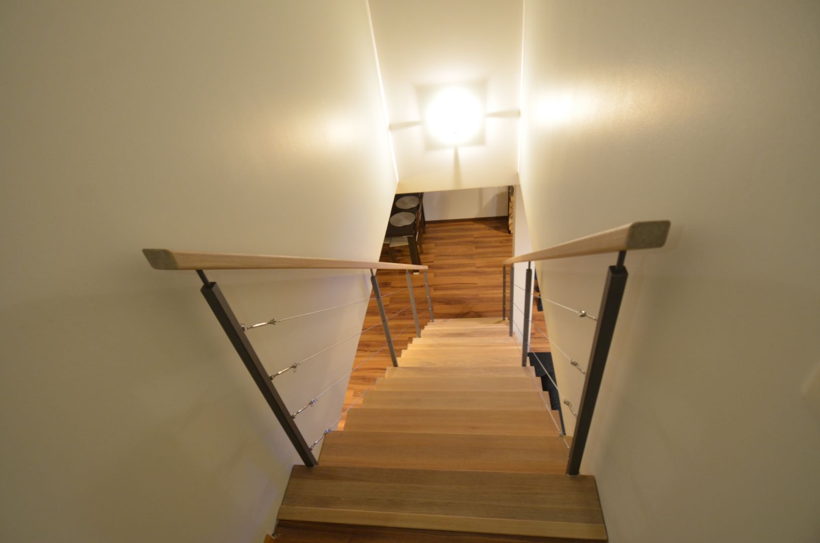 Ühetala trepp. Tala 100x150 mm, astmed tamme liimpuidust. Piireteks 30x30 mm postide vahel trossid, peal tammest käsipuu.