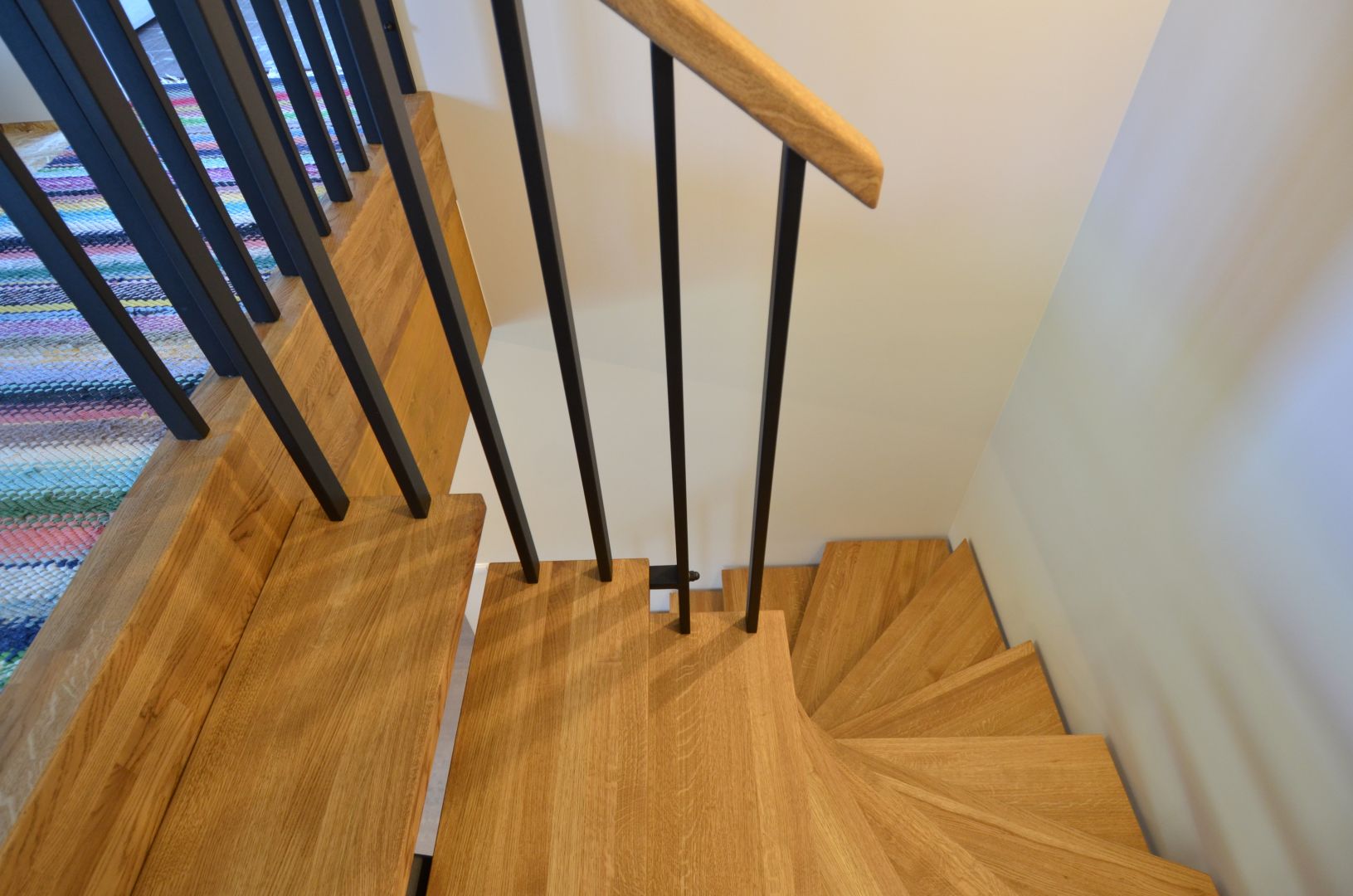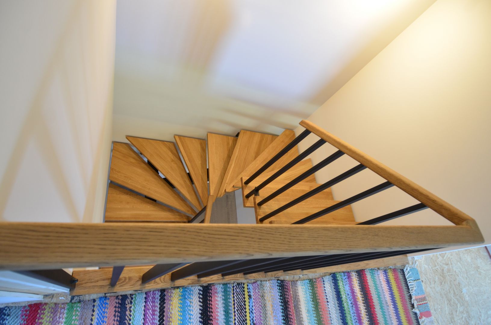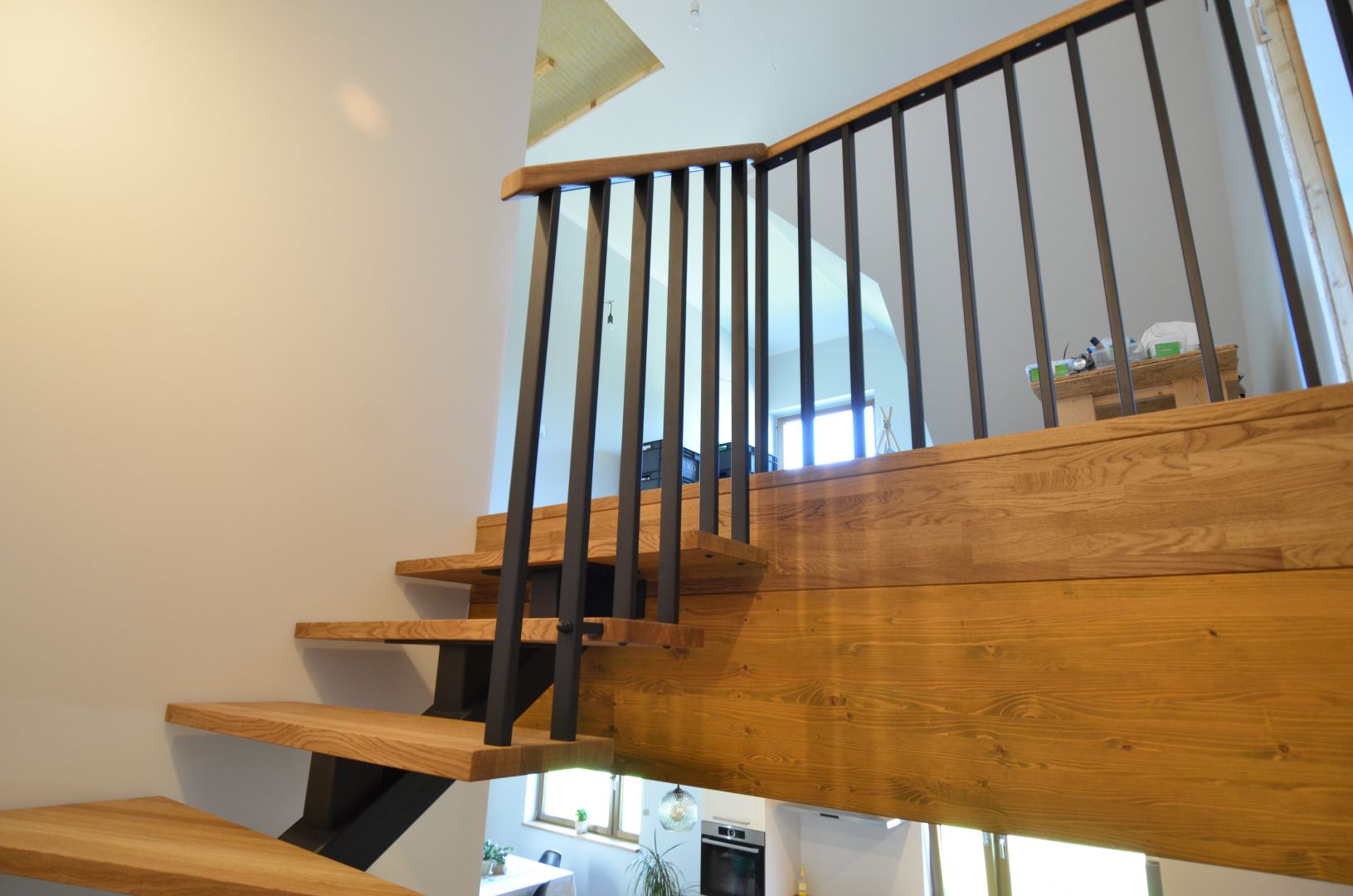 Ühetala trepp, tala 100x150 mm, astmed tamme liimpuidust. Piireteks 20x40 nelikanttorust postid.