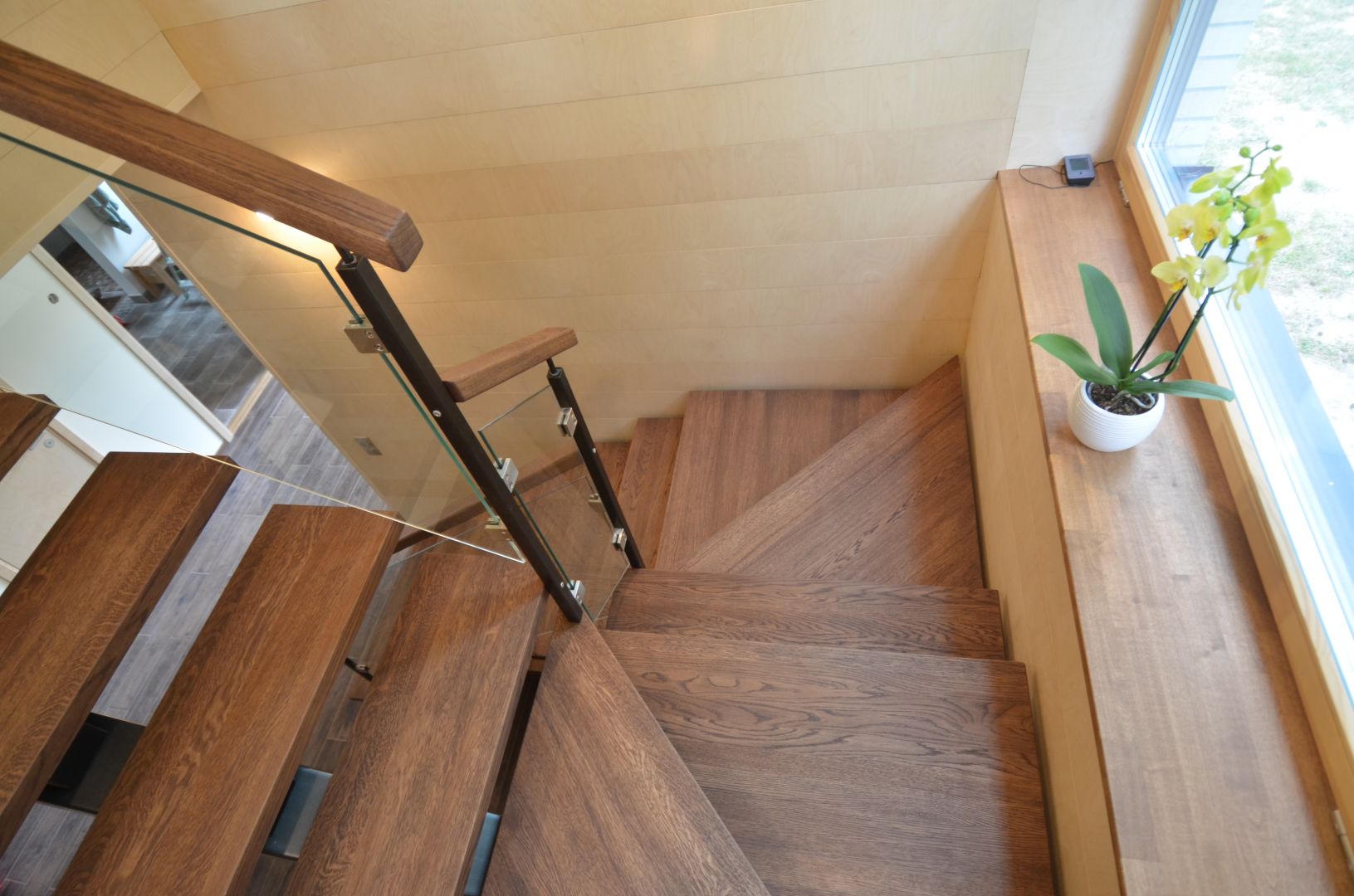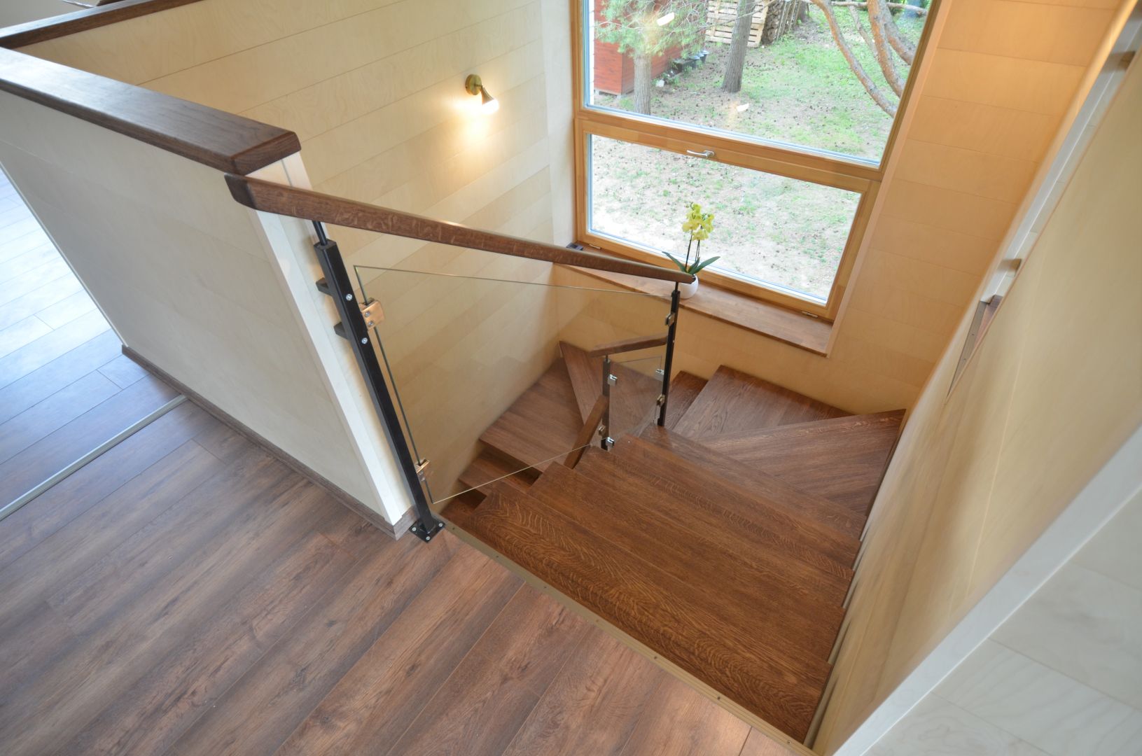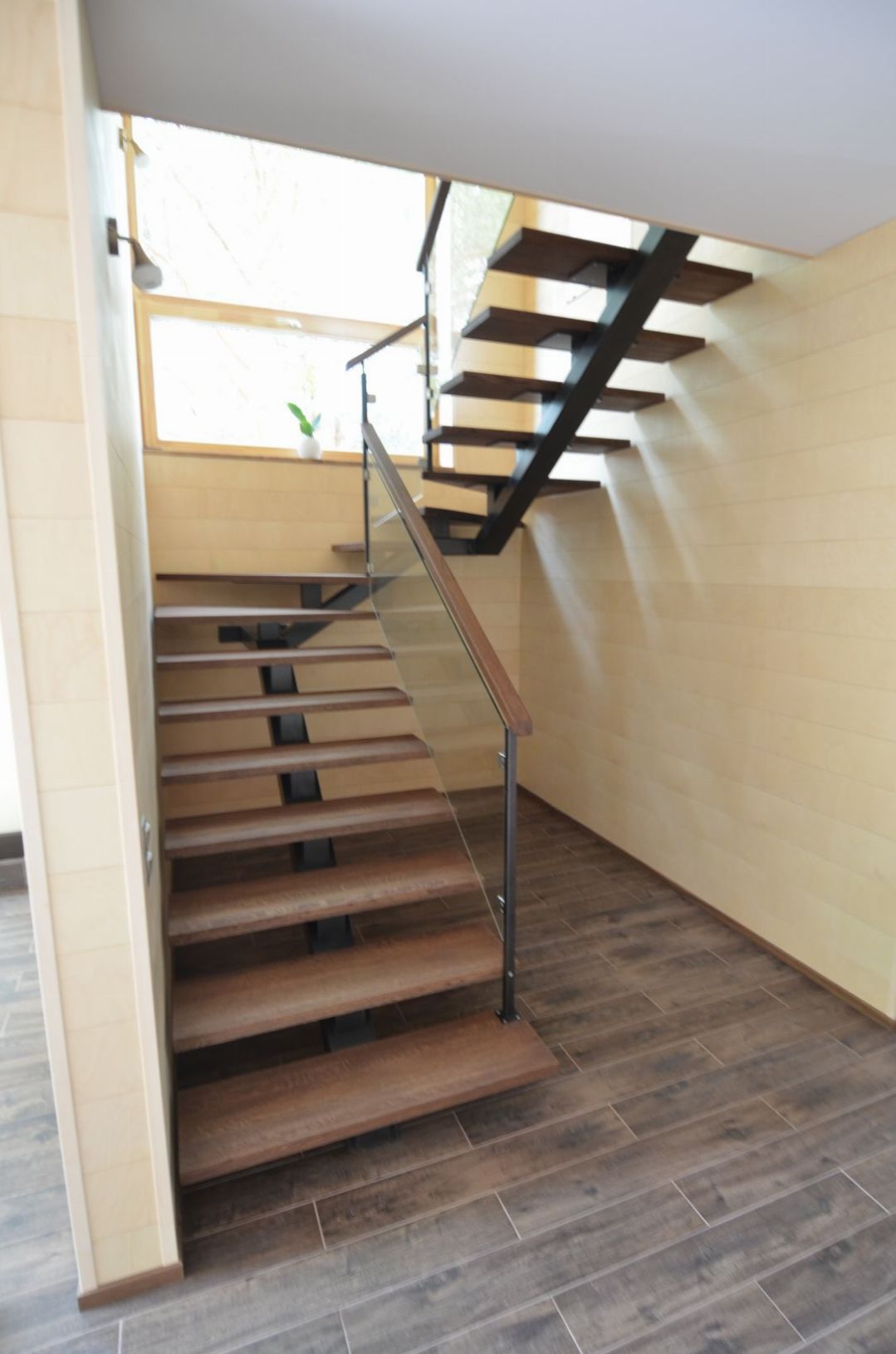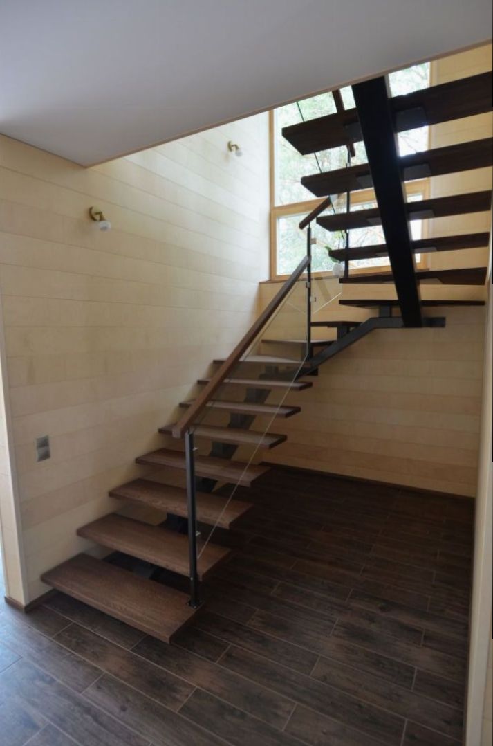 Ühetala U-trepp, tala 100x150 mm. Astmed tamme liimpuidust paksusega 40 mm. Piireteks kirgas karastatud 8 mm klaas, mis on 30x30 mm nelikanttorust postide vahe.