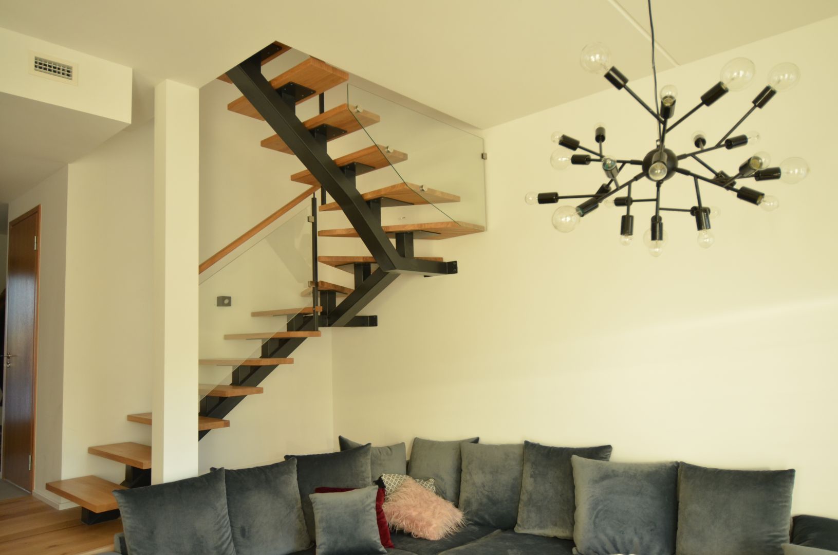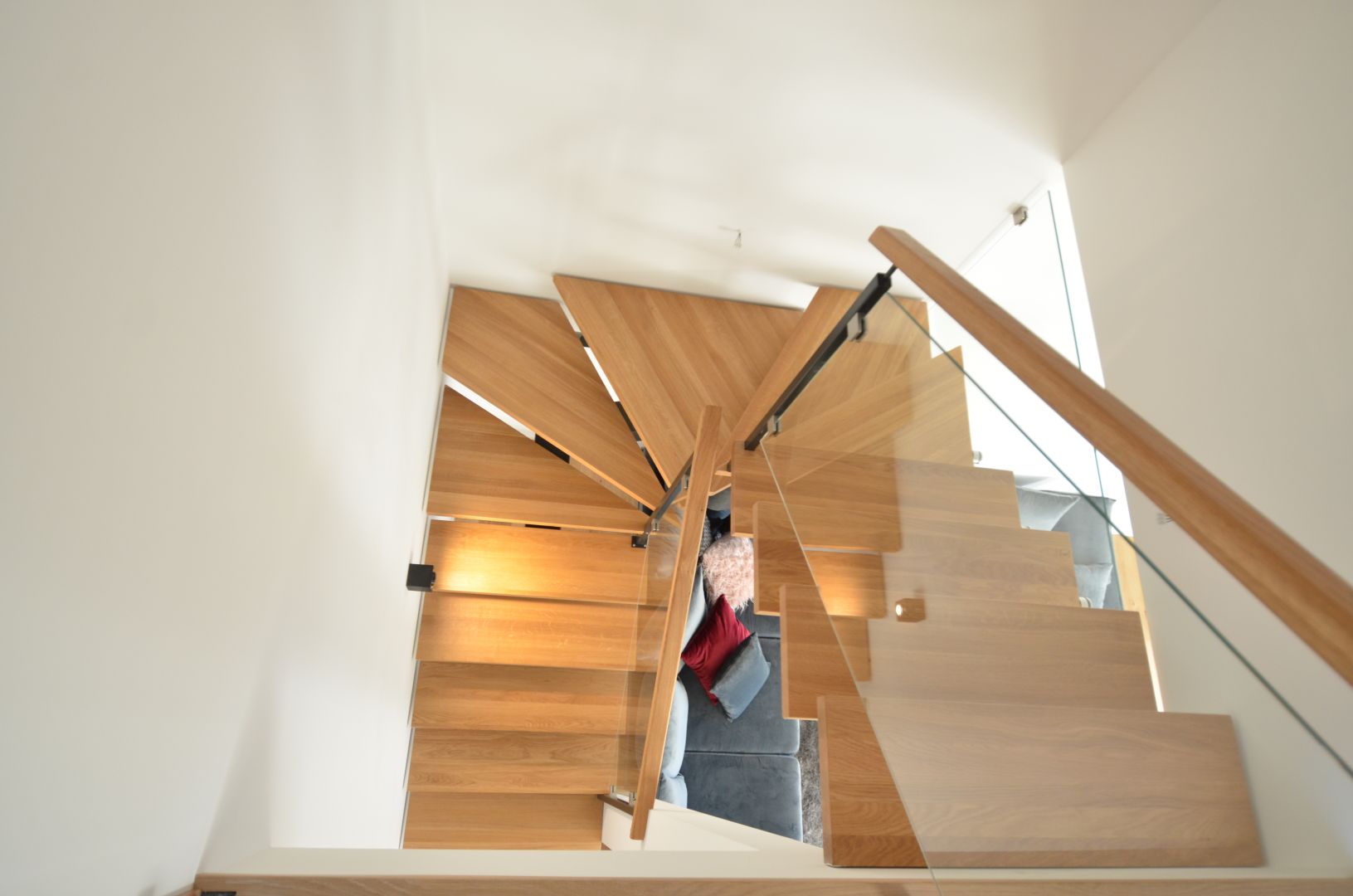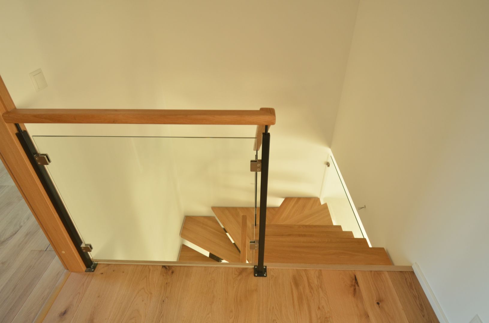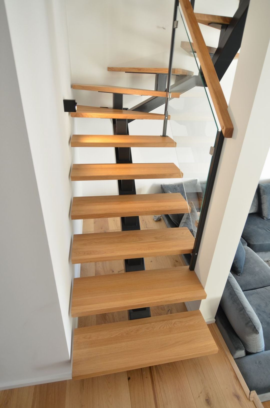 Ühetala u-trepp tamme liimpuidust astmetega. piireteks 30x30 mm nelikantpostide vahel 8 mm kirgas karastatud klaas.
