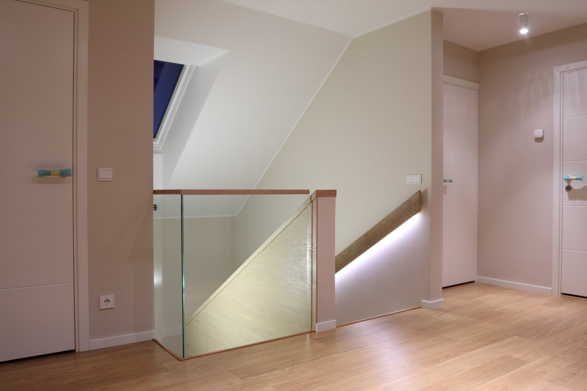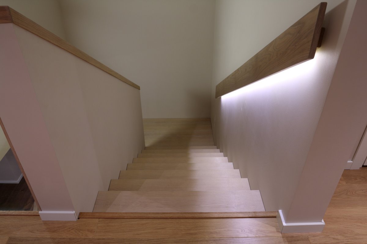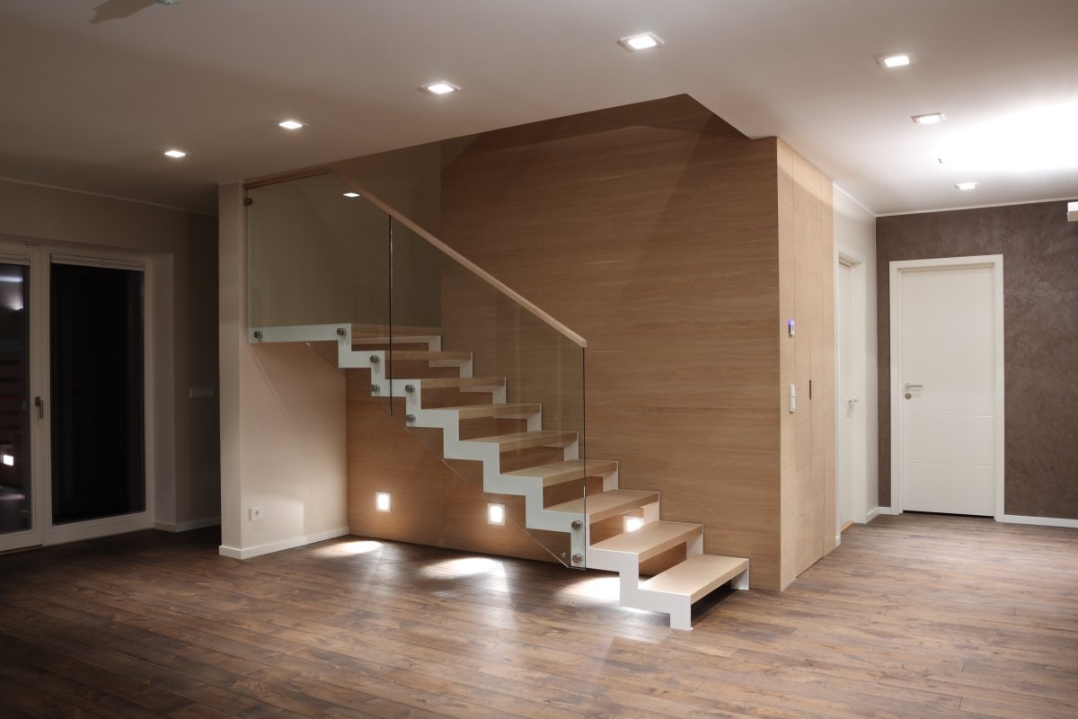 Kandekonstruktsioon 12x100 mm sik-sak lehtmetall. Astmed tamme liimpuidust, õlitatud valge õliga, piirdeks kirgas 12mm kirgas karastatud klaas, peale liimitud tammest käsipuu