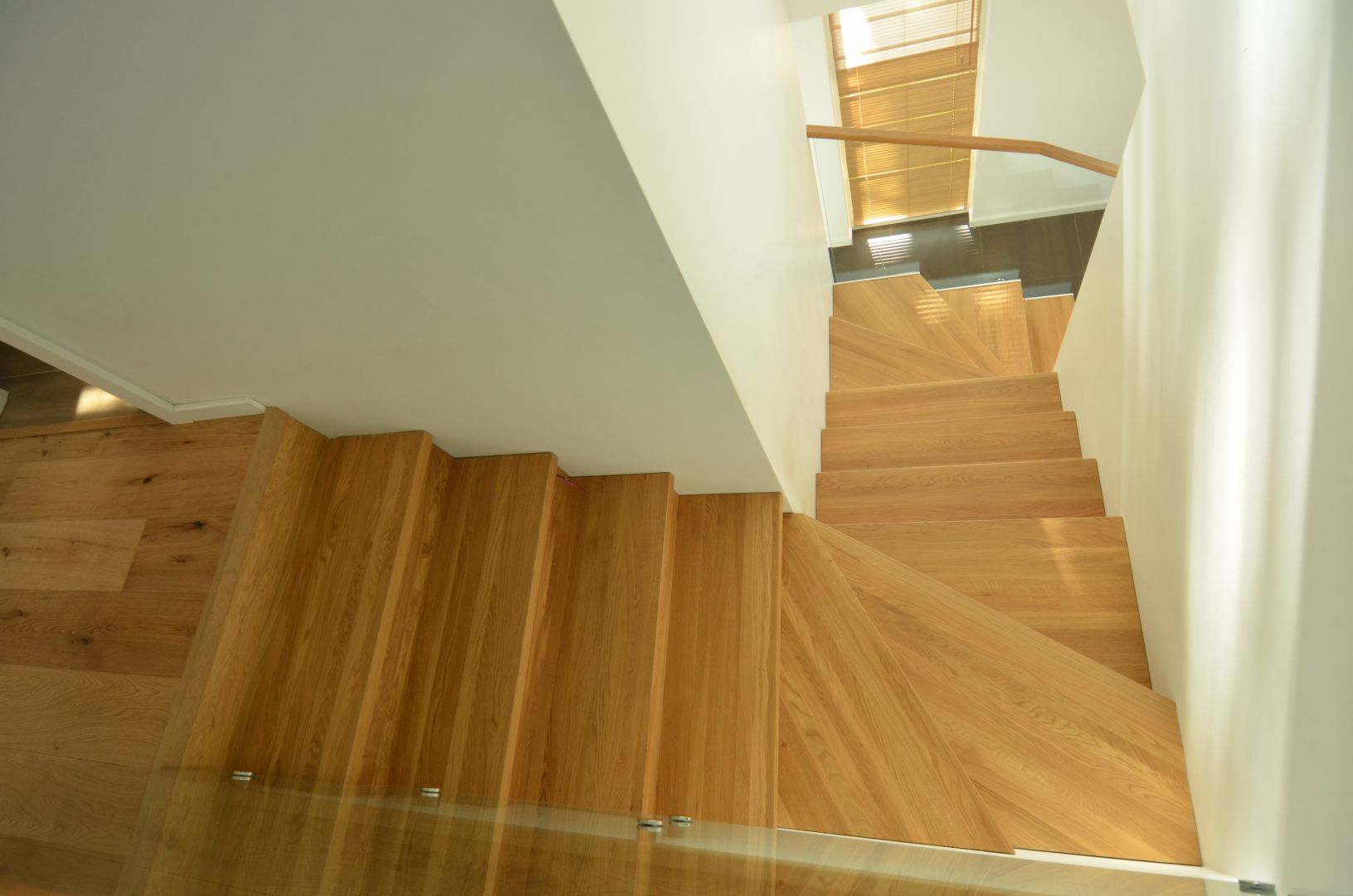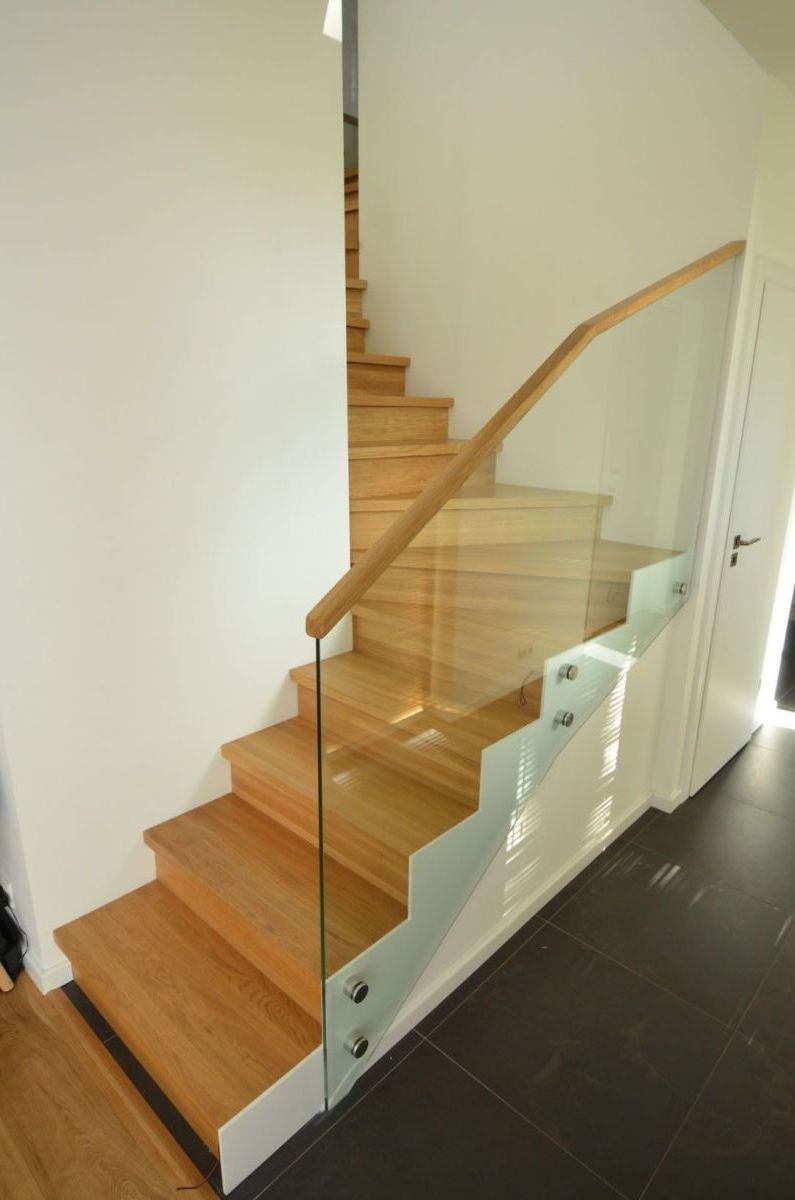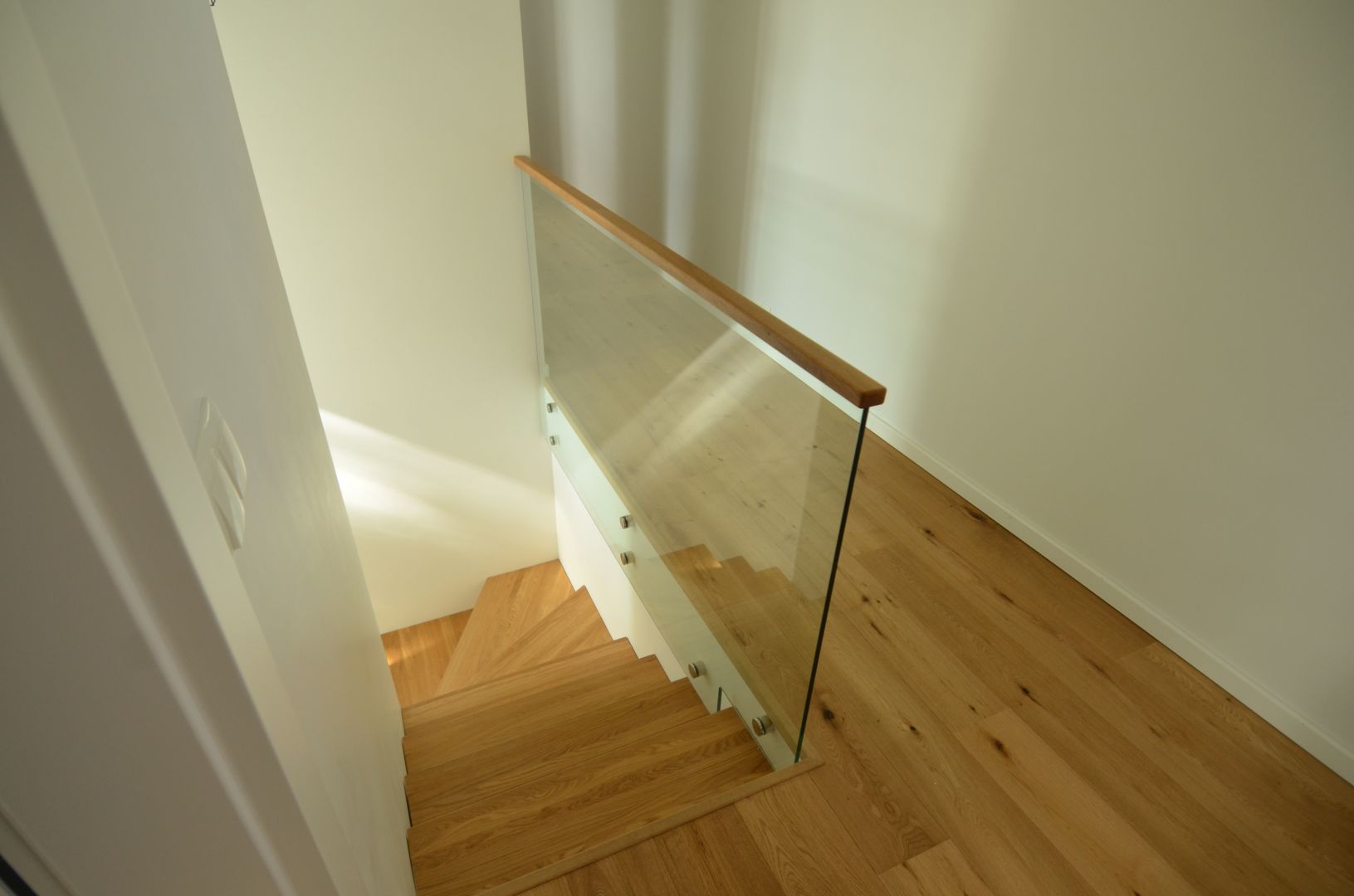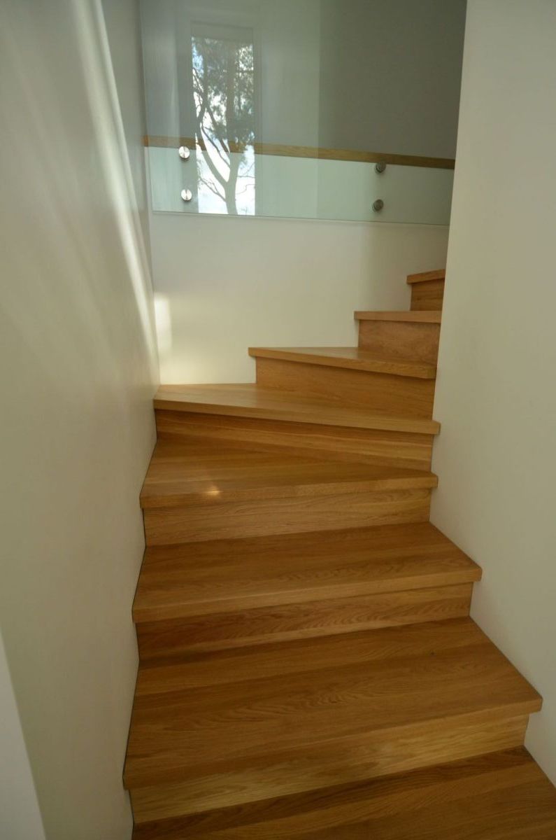 Kinnine varvaslaudadega trepp. Astmed ja varvaslauad tamme liimpuidust piirdeks kirgas karastatud 12 mm klaas, mis on punktkinnitustega vahelae ja trepi metalli külge kinnitatud.