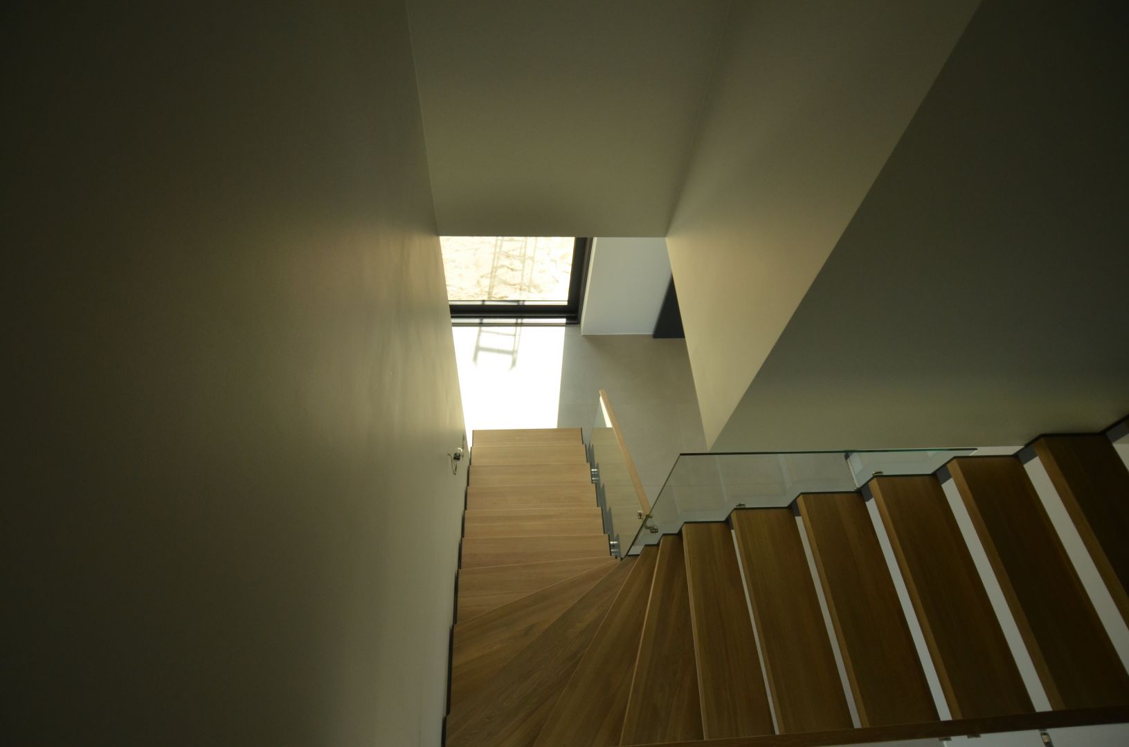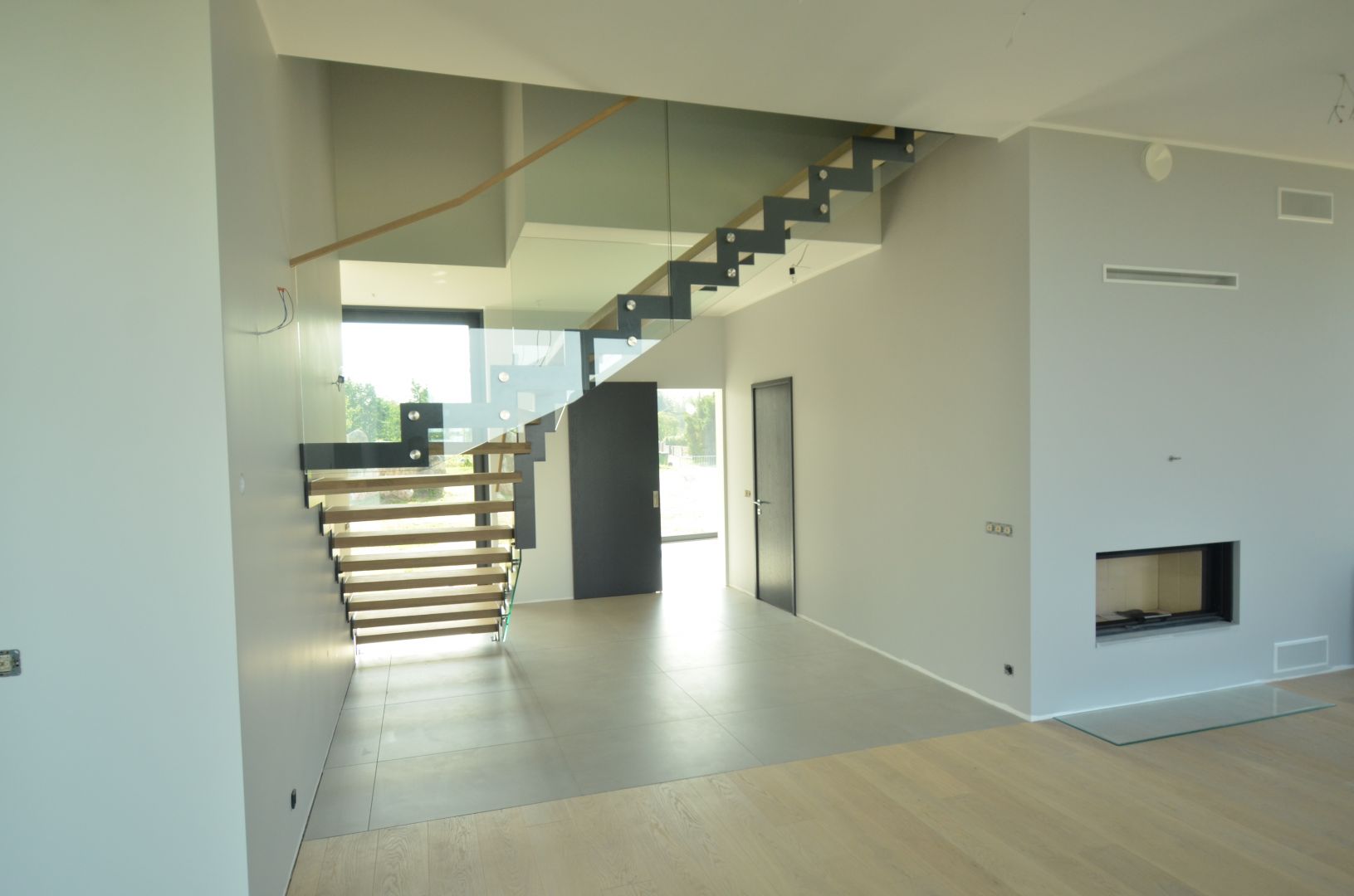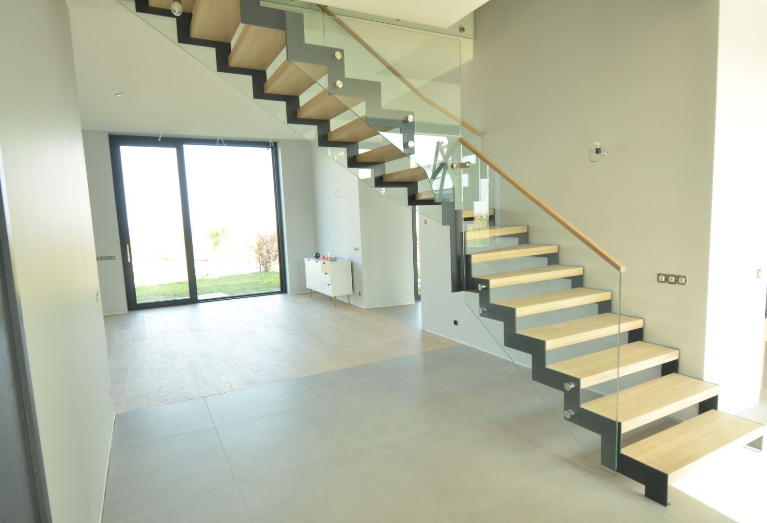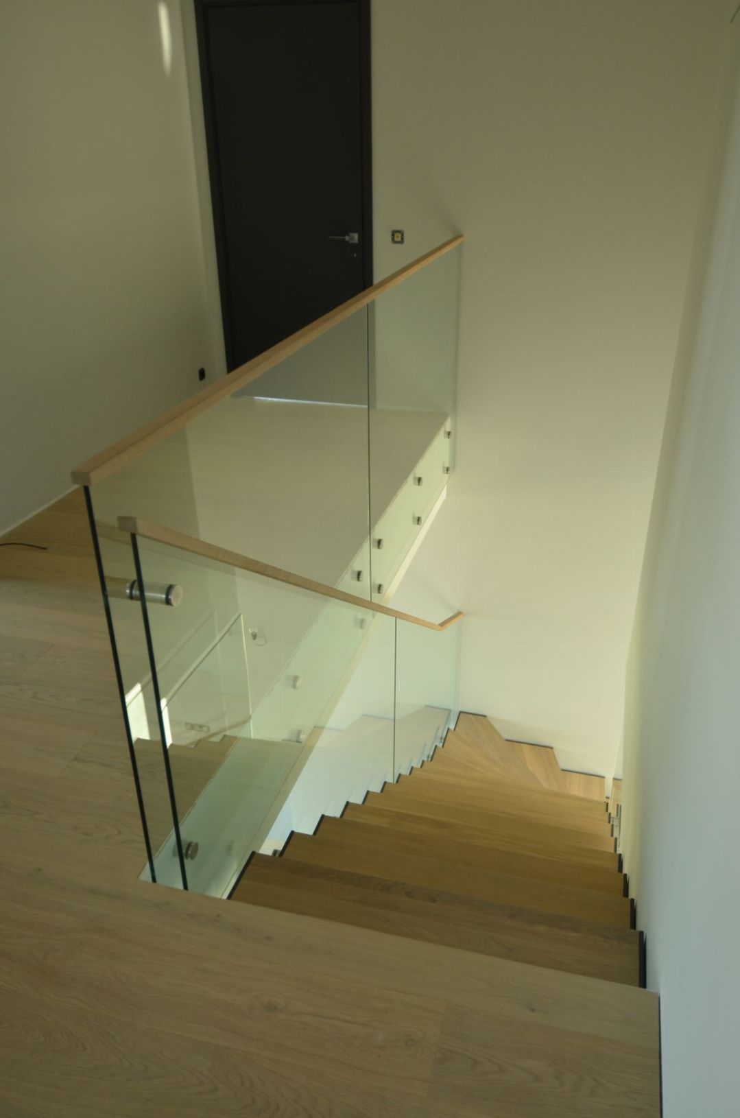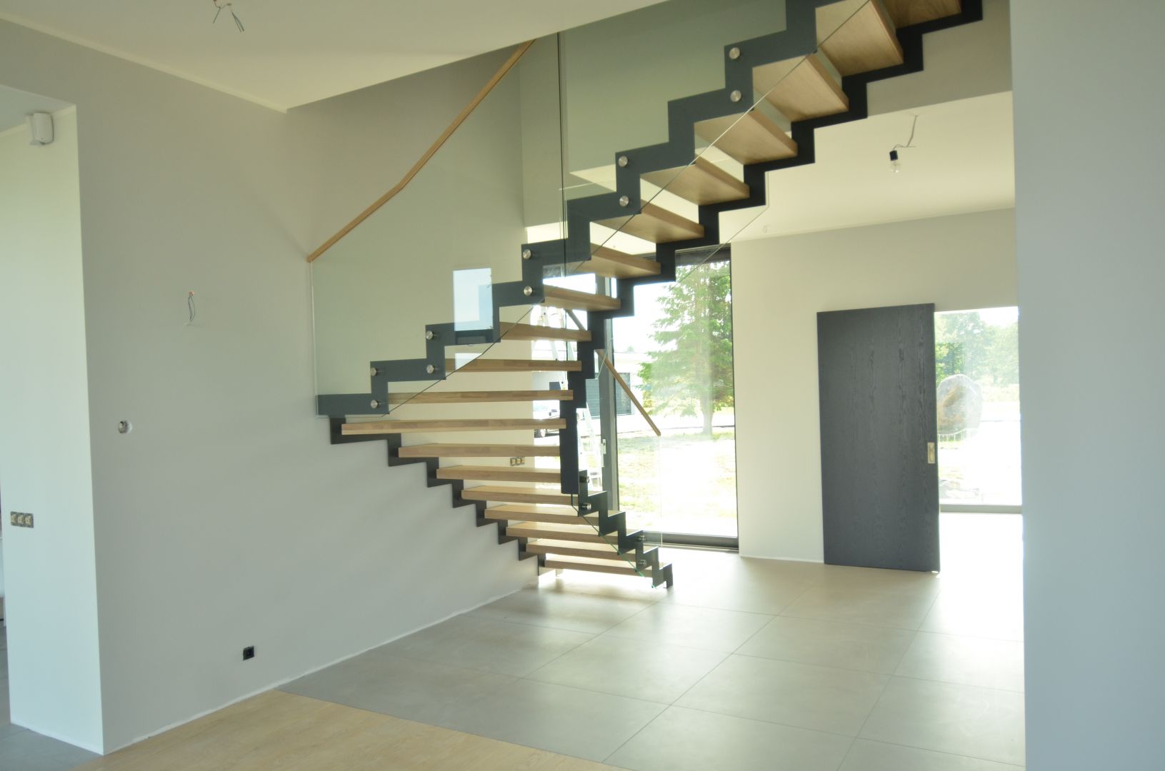 L-trepp. Kandekonstruktsioon 10x120 mm teraslehest. Astmed 65 mm paksused karpastmed. Piireteks kirgas 12 mm karastatud klaas.