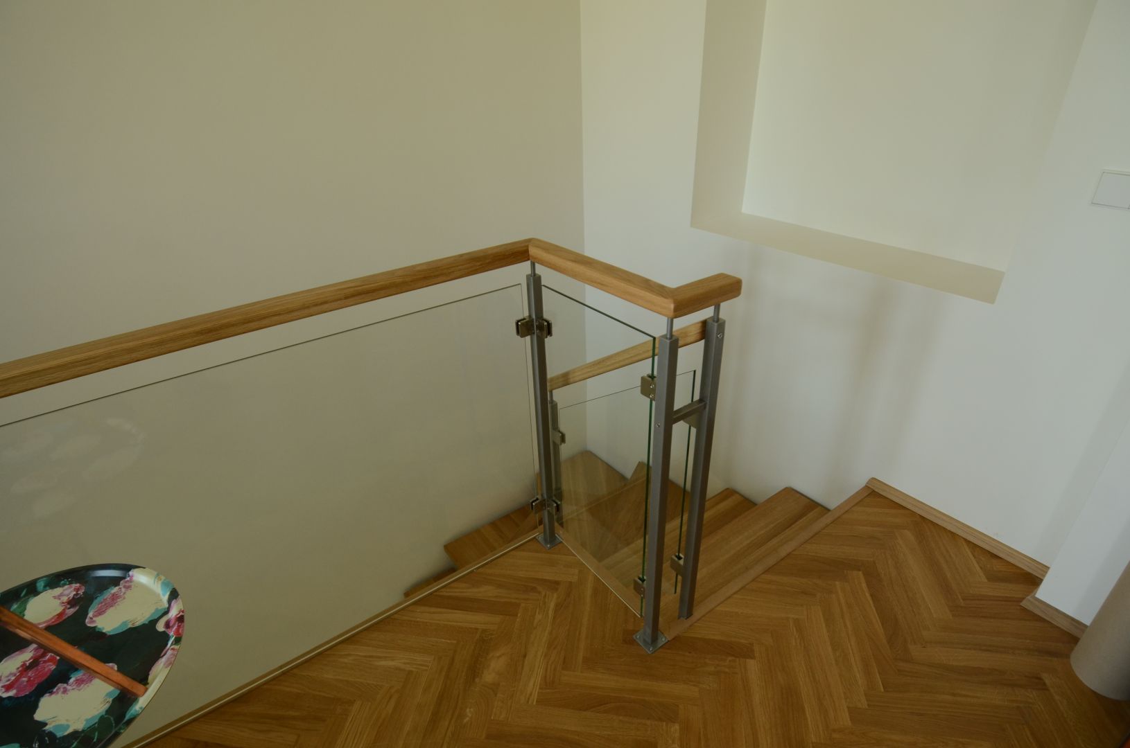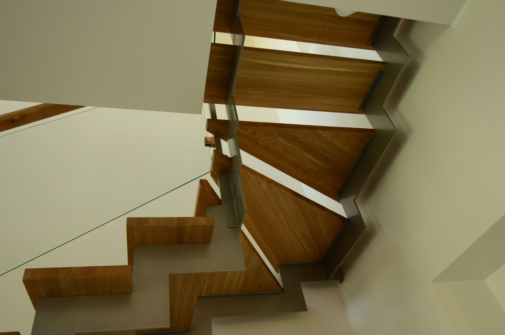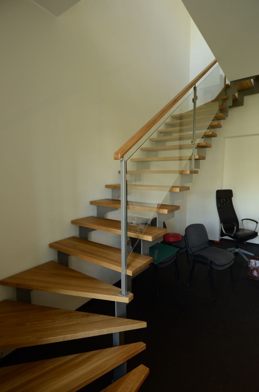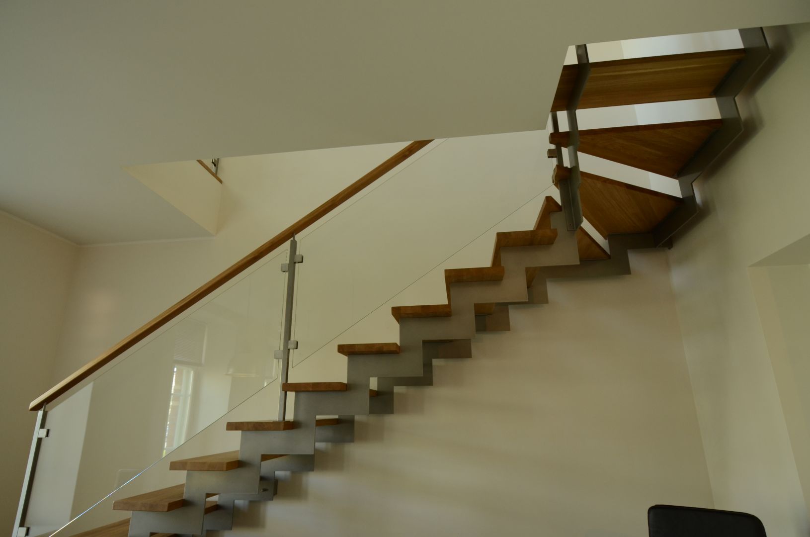 Metalltrepp, kandekonstruktsioon 10x120 mm sik-sak teraslehest astmed tamme liimpuidust. Piireteks 8 mm karastatud klaas.