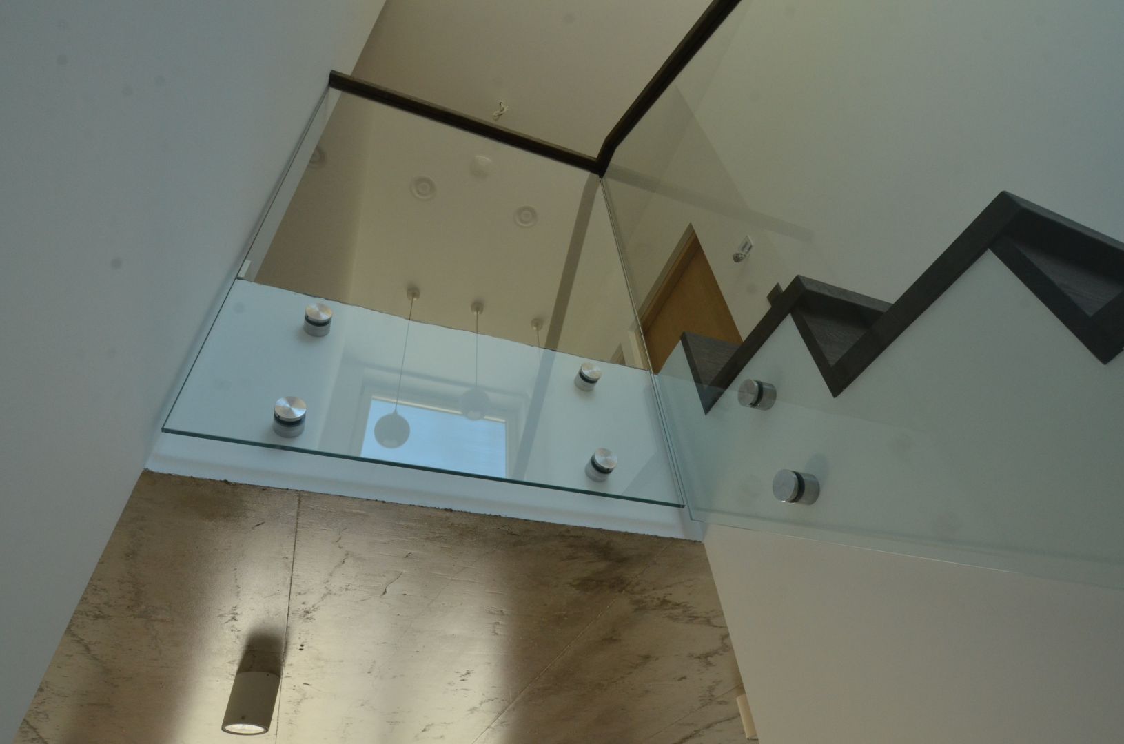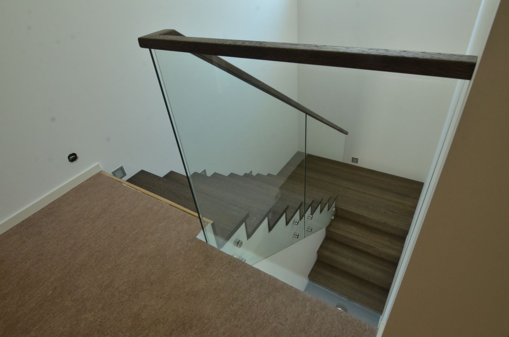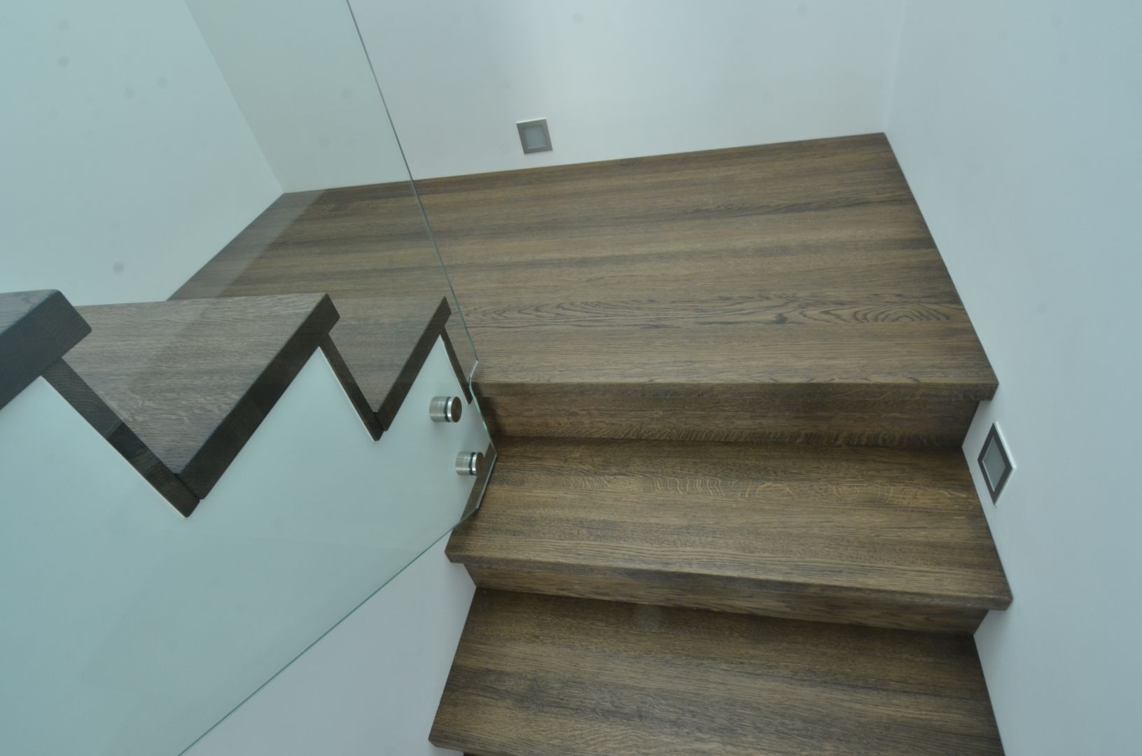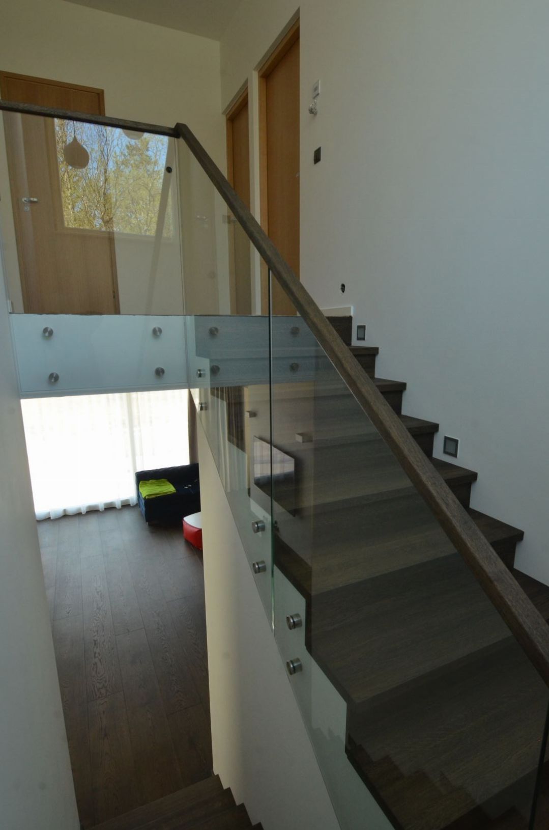 Kinnine trepp tammest astmetega. Piireteks 12 mm kirgas karastatud klaas, mis on punktkinnitustega seina külge kinnitatud.