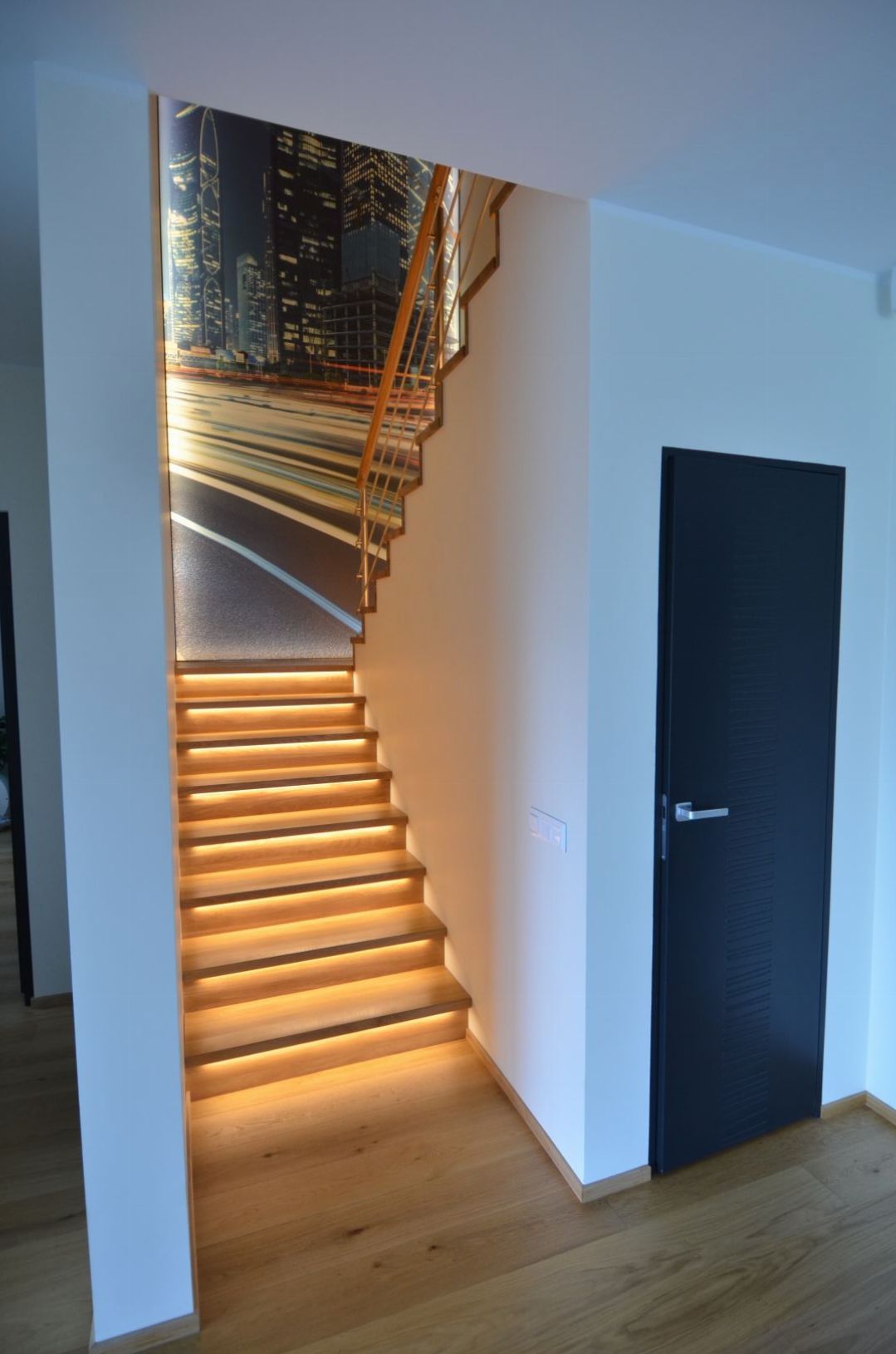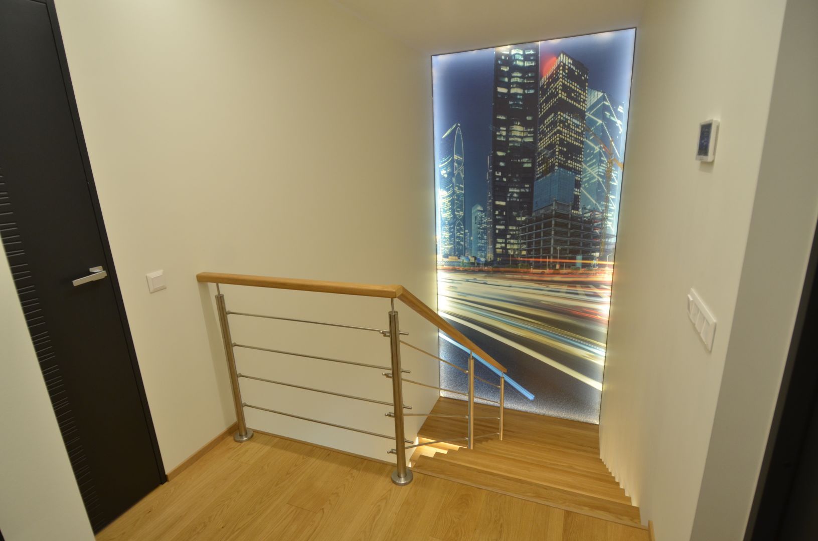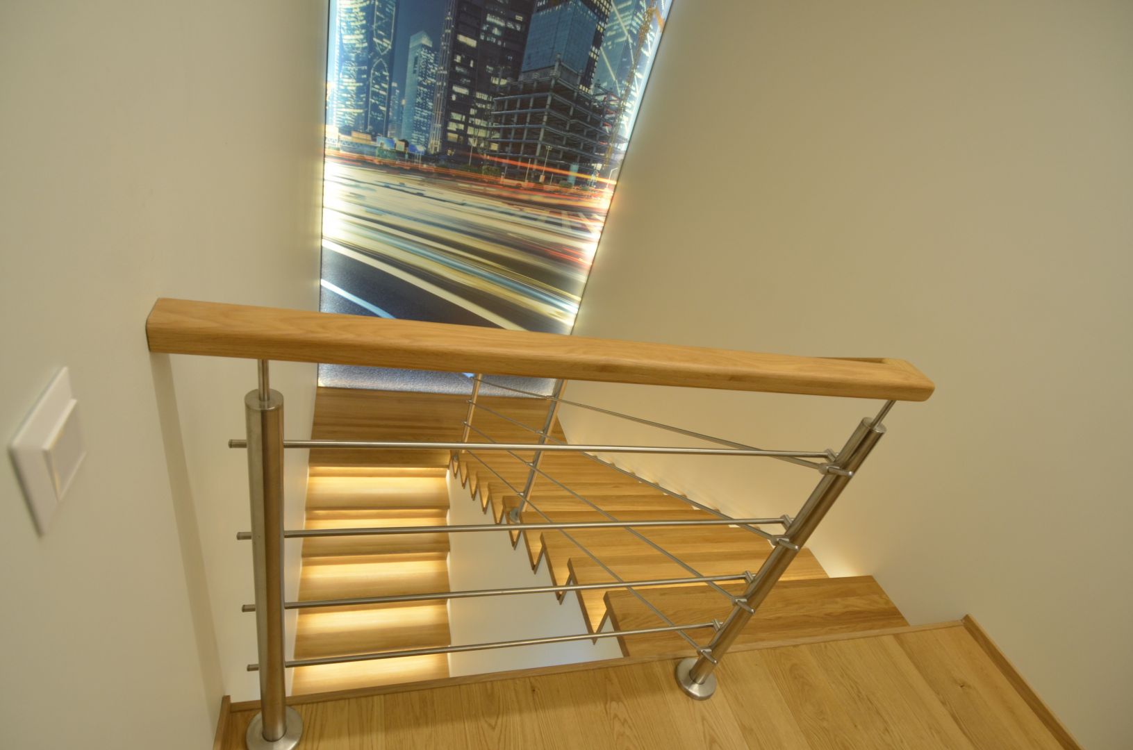Platvormiga kinnine trepp. Kandekonstruktsioon teraslehest, astmed ja varvaslauad tamme liimpuidust. Piireteks harjatud rst torud.
