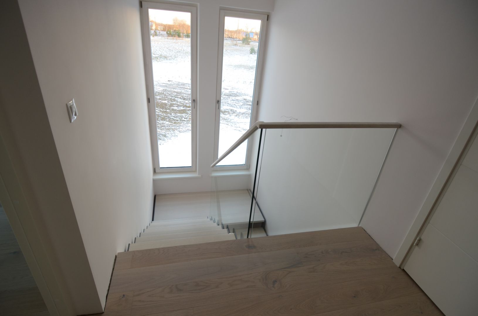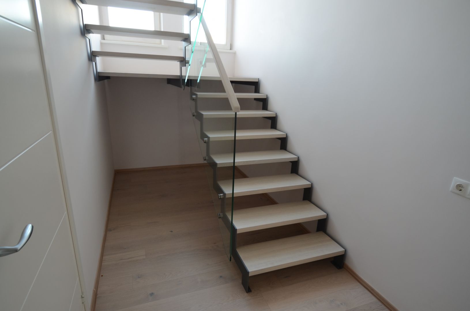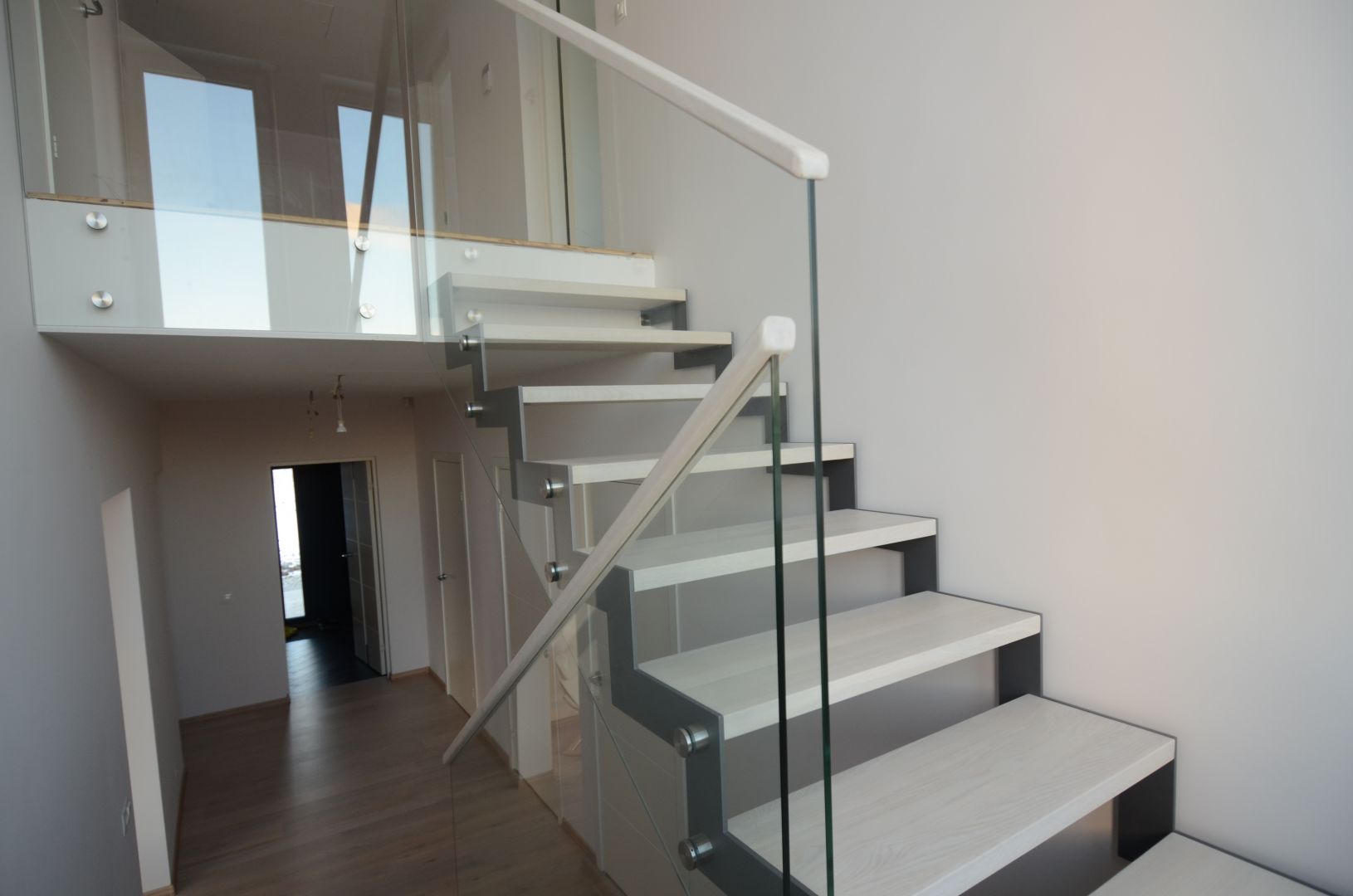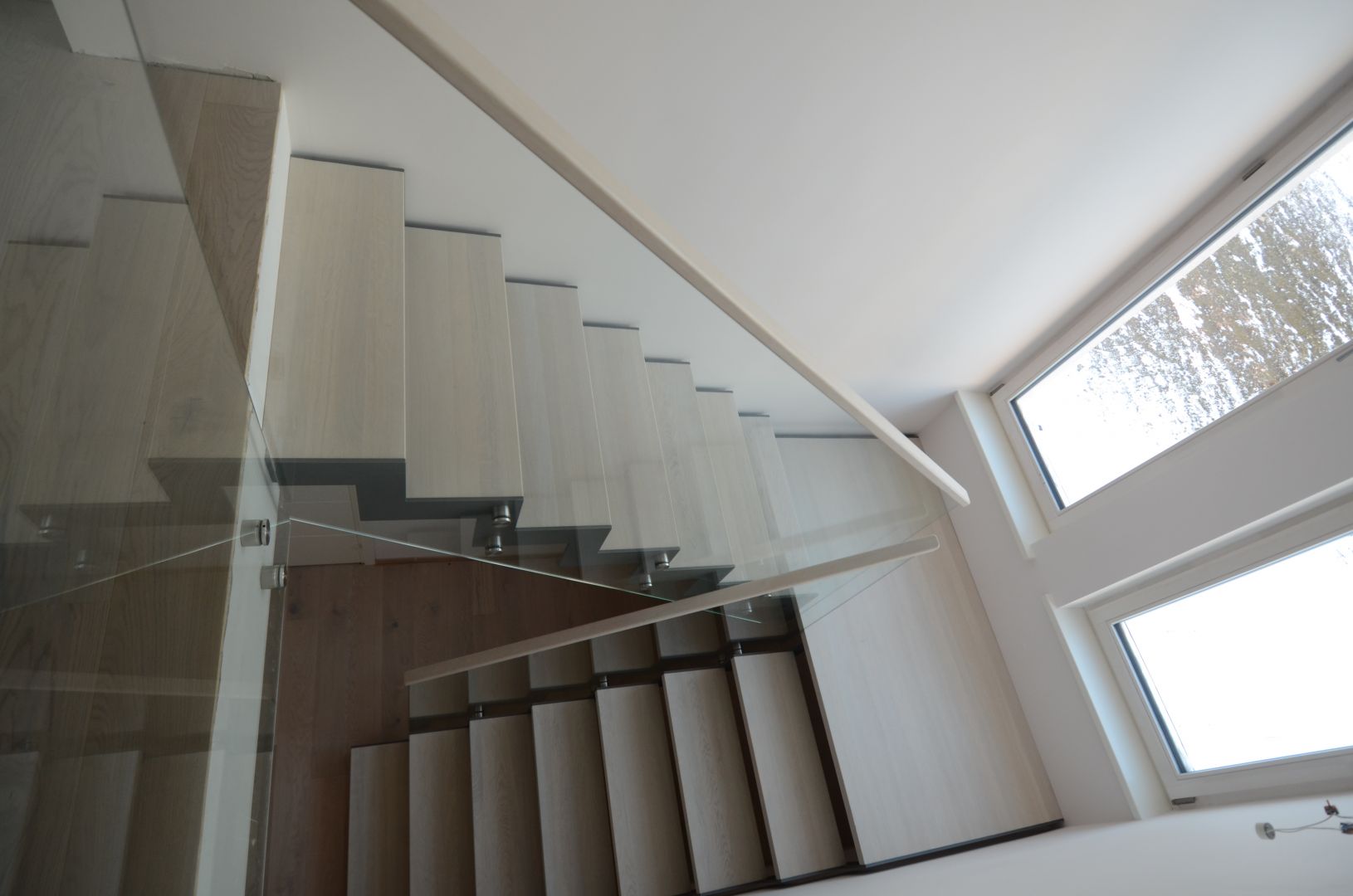 Platvormiga trepp. Kandekonstruktsioon 10x100 mm sik-sak teraslehest, astmed tamme liimpuidust. Piirdeks kirgas 12 mm karastatud klaas, peal tammest käsipuu.
