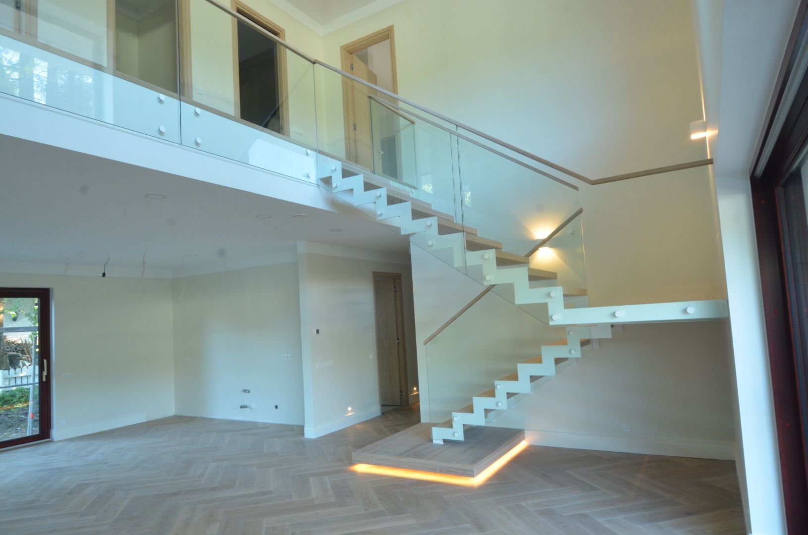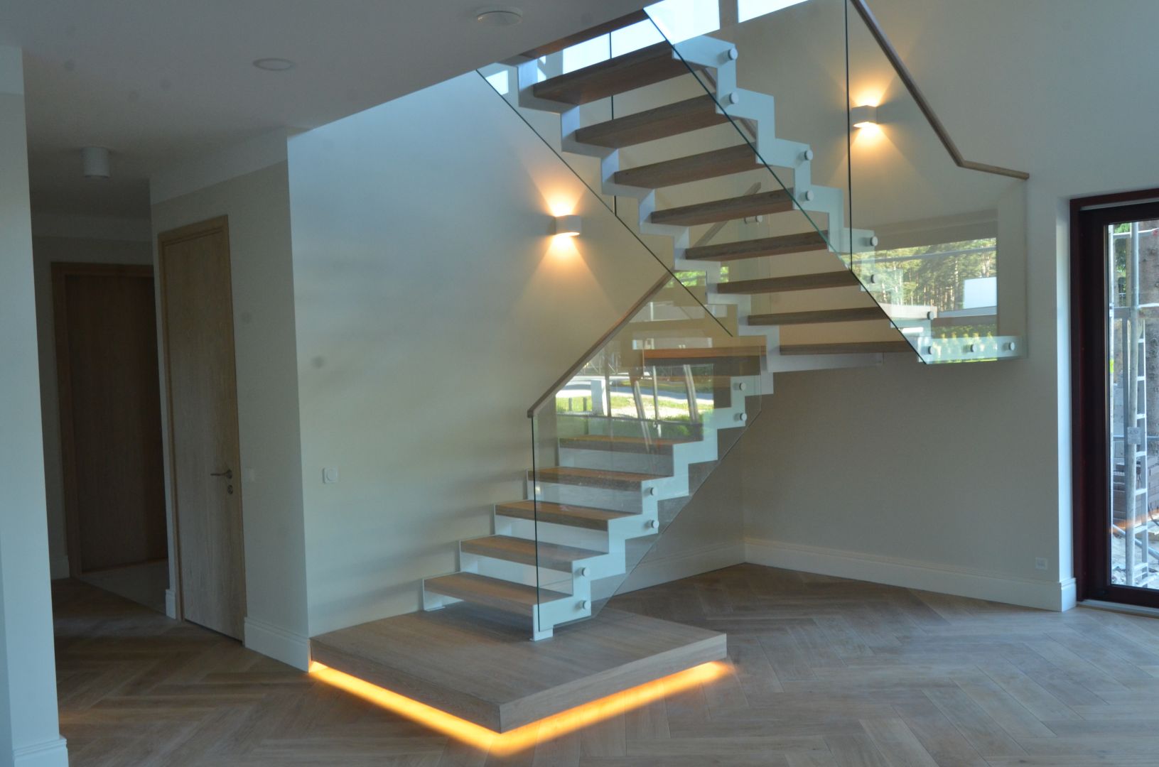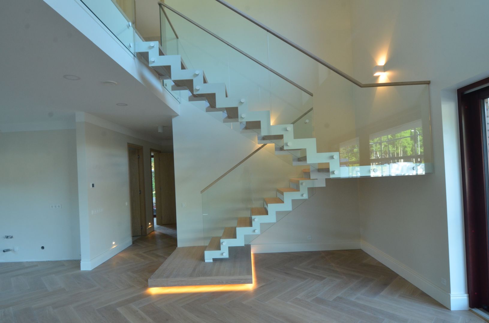 Platvormiga trepp. Kandekonstruktsioon 10x120 mm sik-sak teraslehest. Piireteks kirgas karastatud 12 mm klaas.