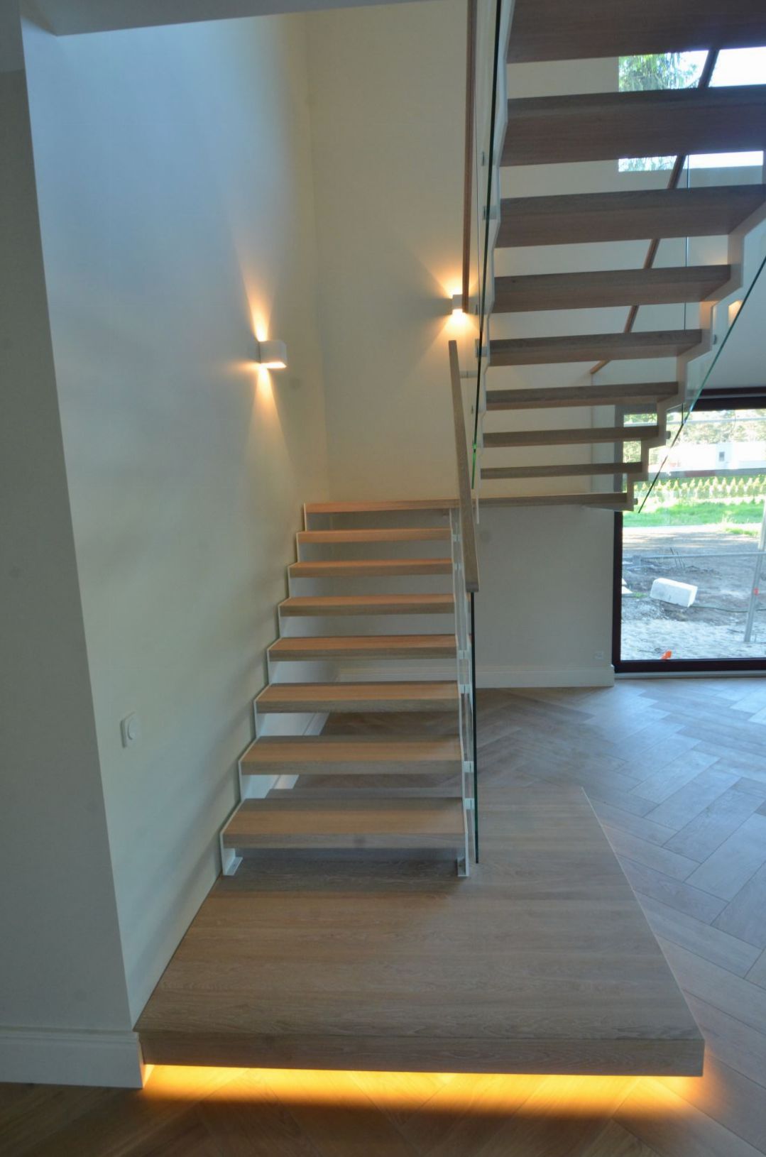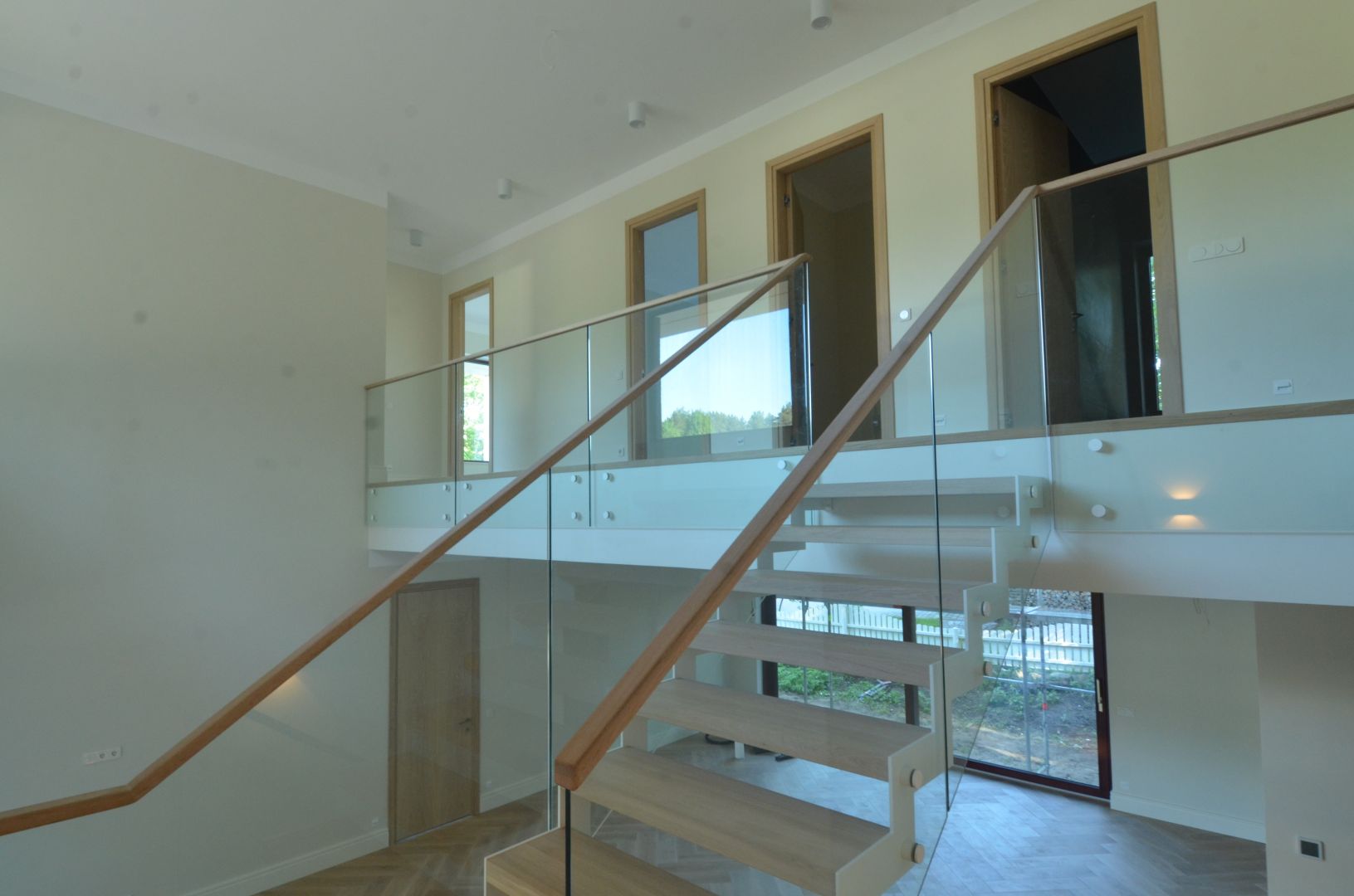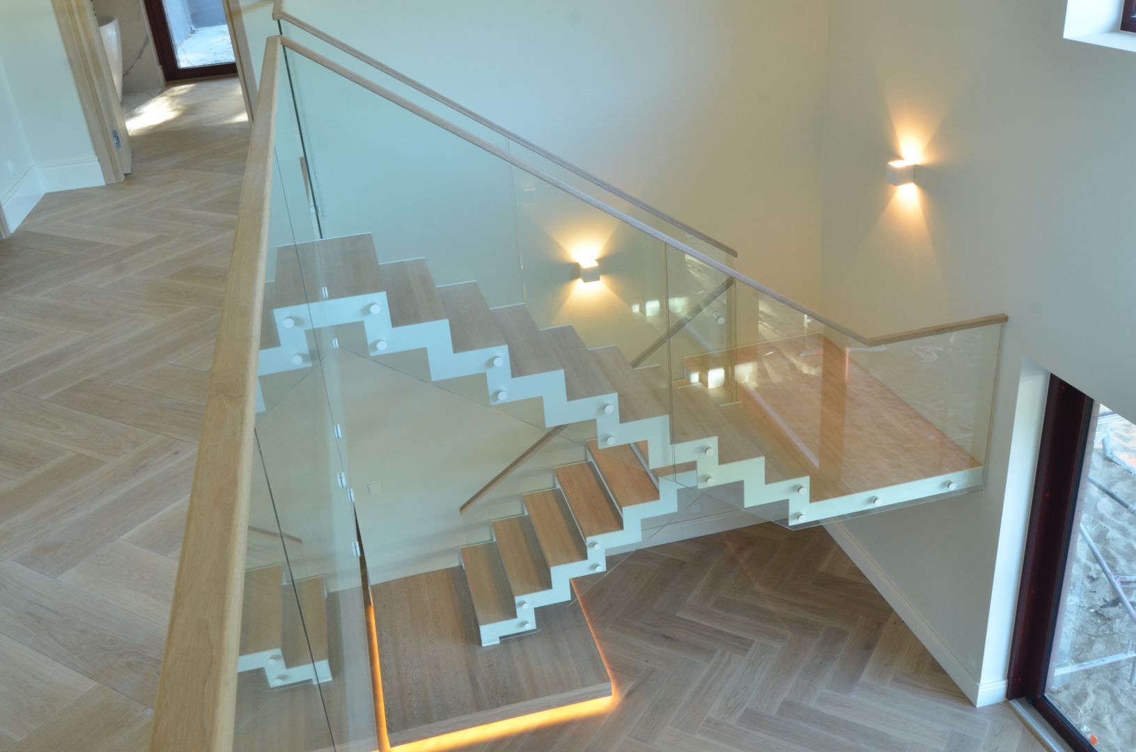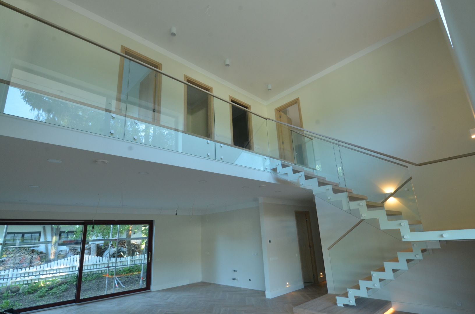 Platvormiga trepp. Kandekonstruktsioon 10x120 mm sik-sak teraslehest. Piireteks kirgas karastatud 12 mm klaas.