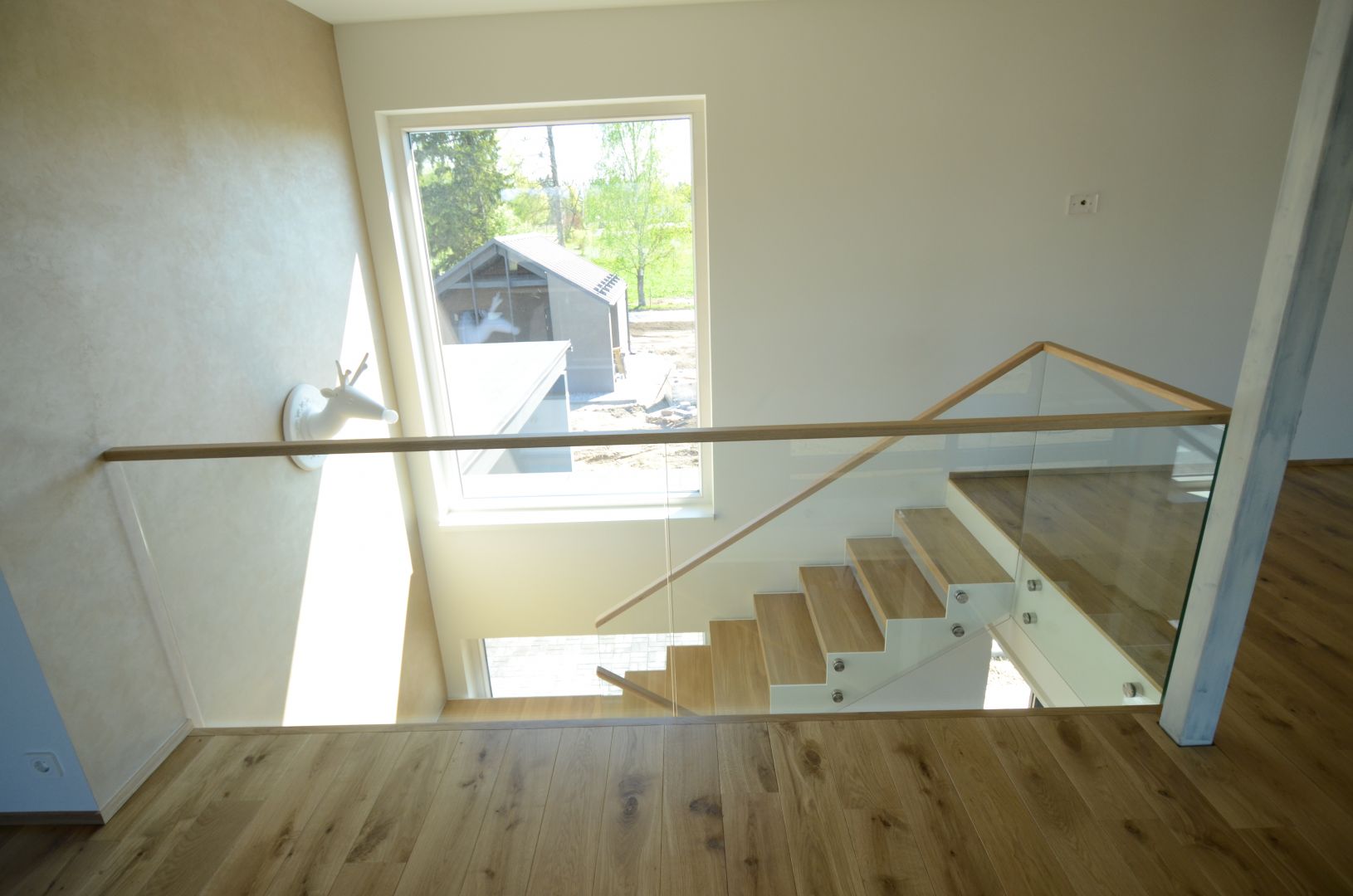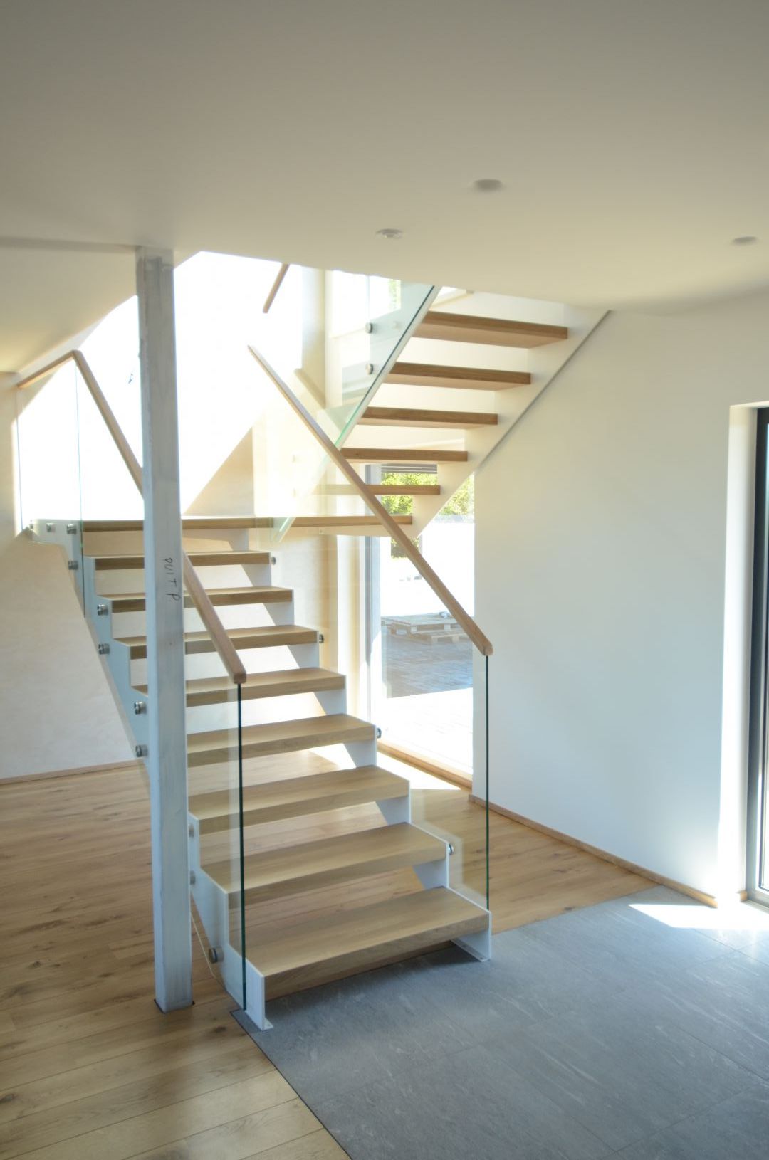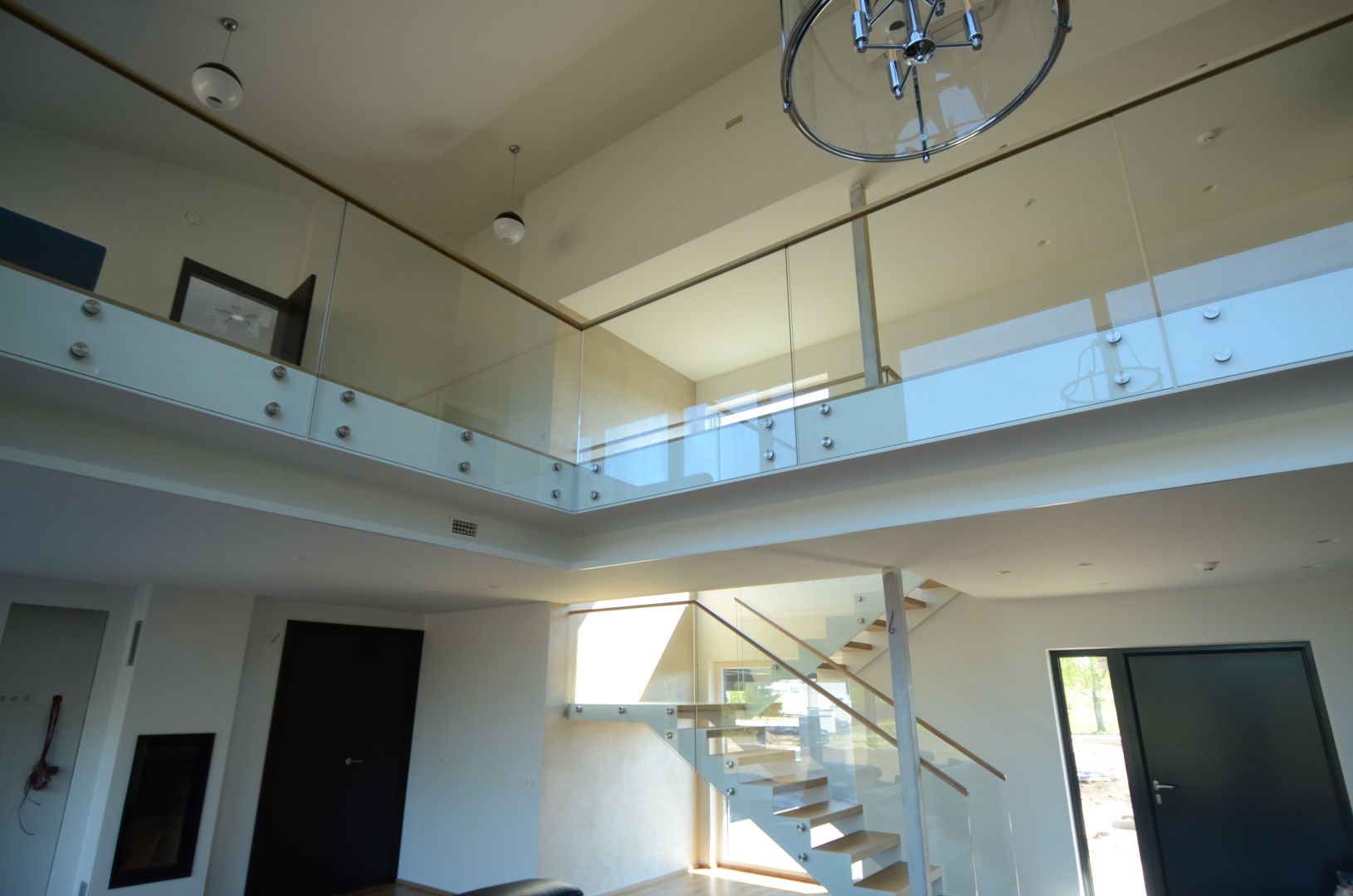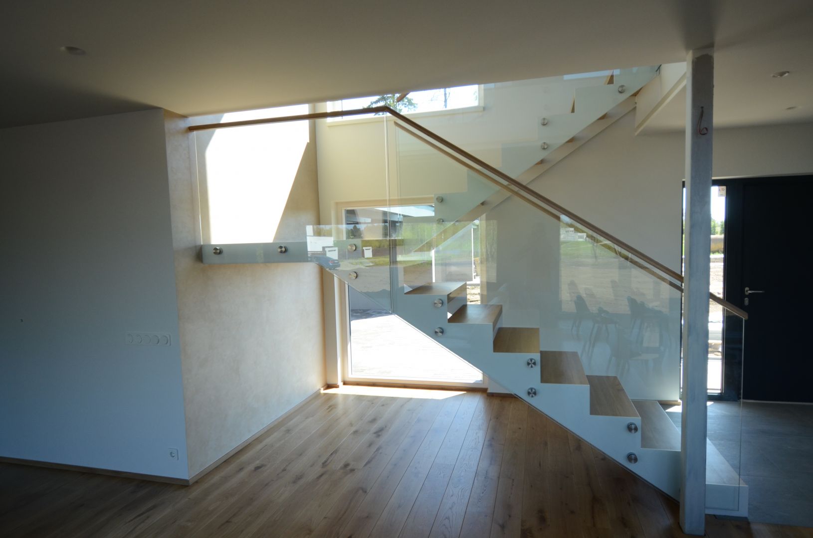 Teraslehest kandekonstruktsioon paksusega 10 mm, nende vahel 60 mm tamme liimpuidust astmed. Piirdeks kirgas karastatud 12 mm klaas, peal tammest käsipuu 32x50 mm.