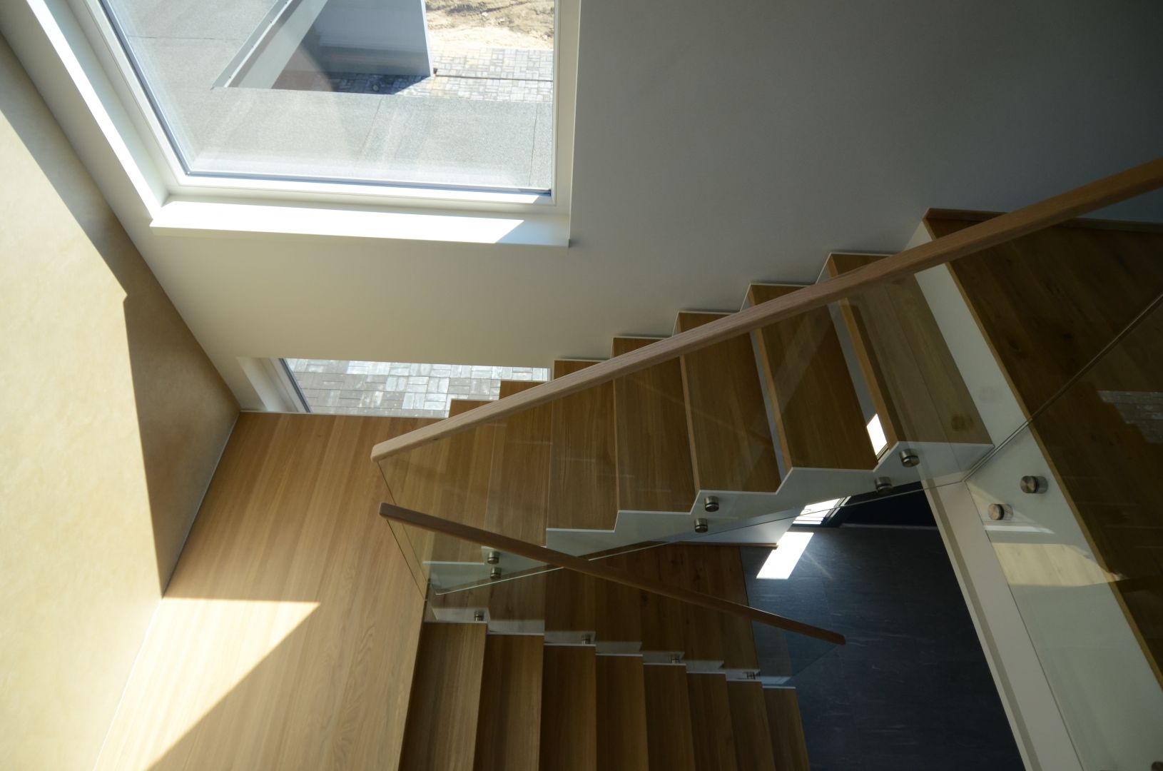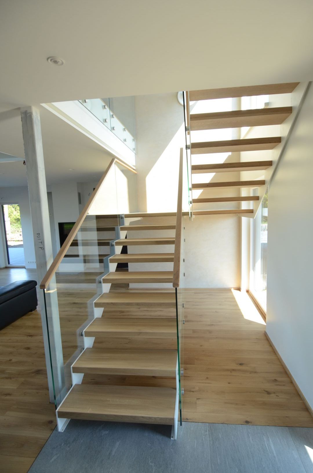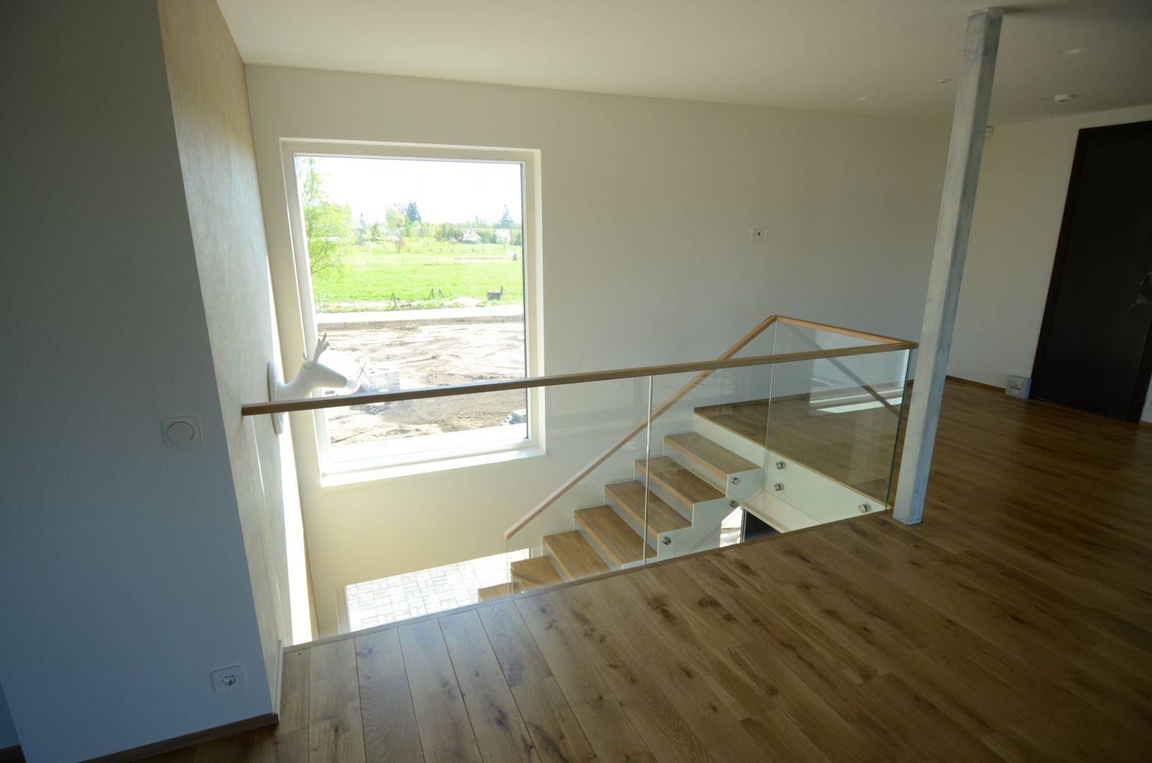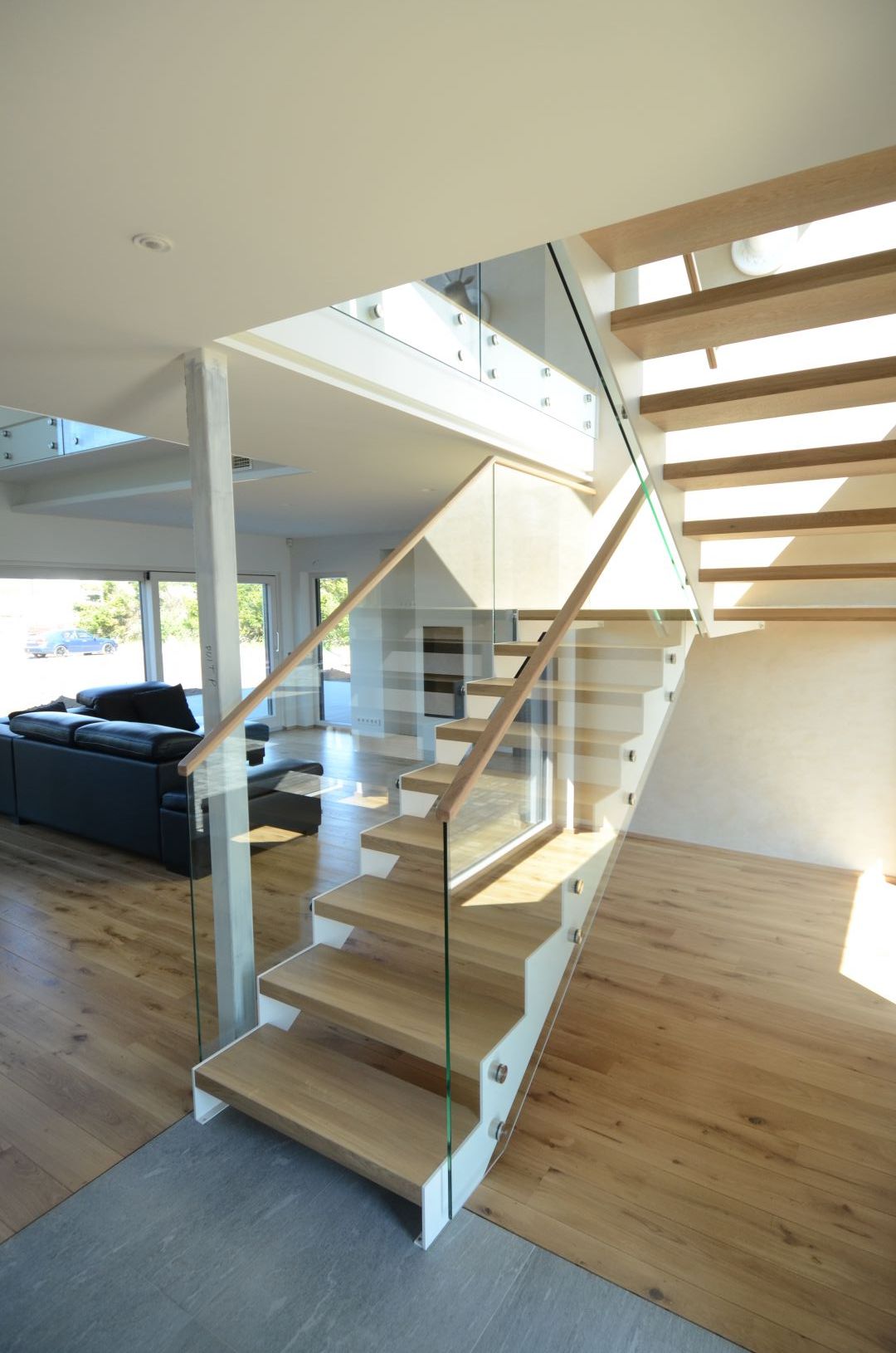 Teraslehest kandekonstruktsioon paksusega 10 mm, nende vahel 60 mm tamme liimpuidust astmed. Piirdeks kirgas karastatud 12 mm klaas, peal tammest käsipuu 32x50 mm.