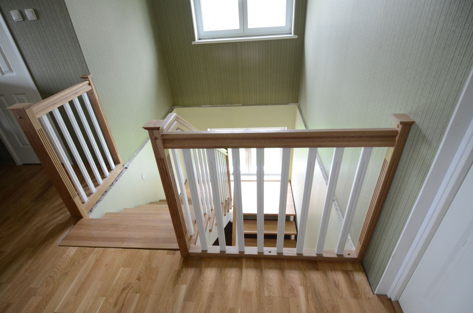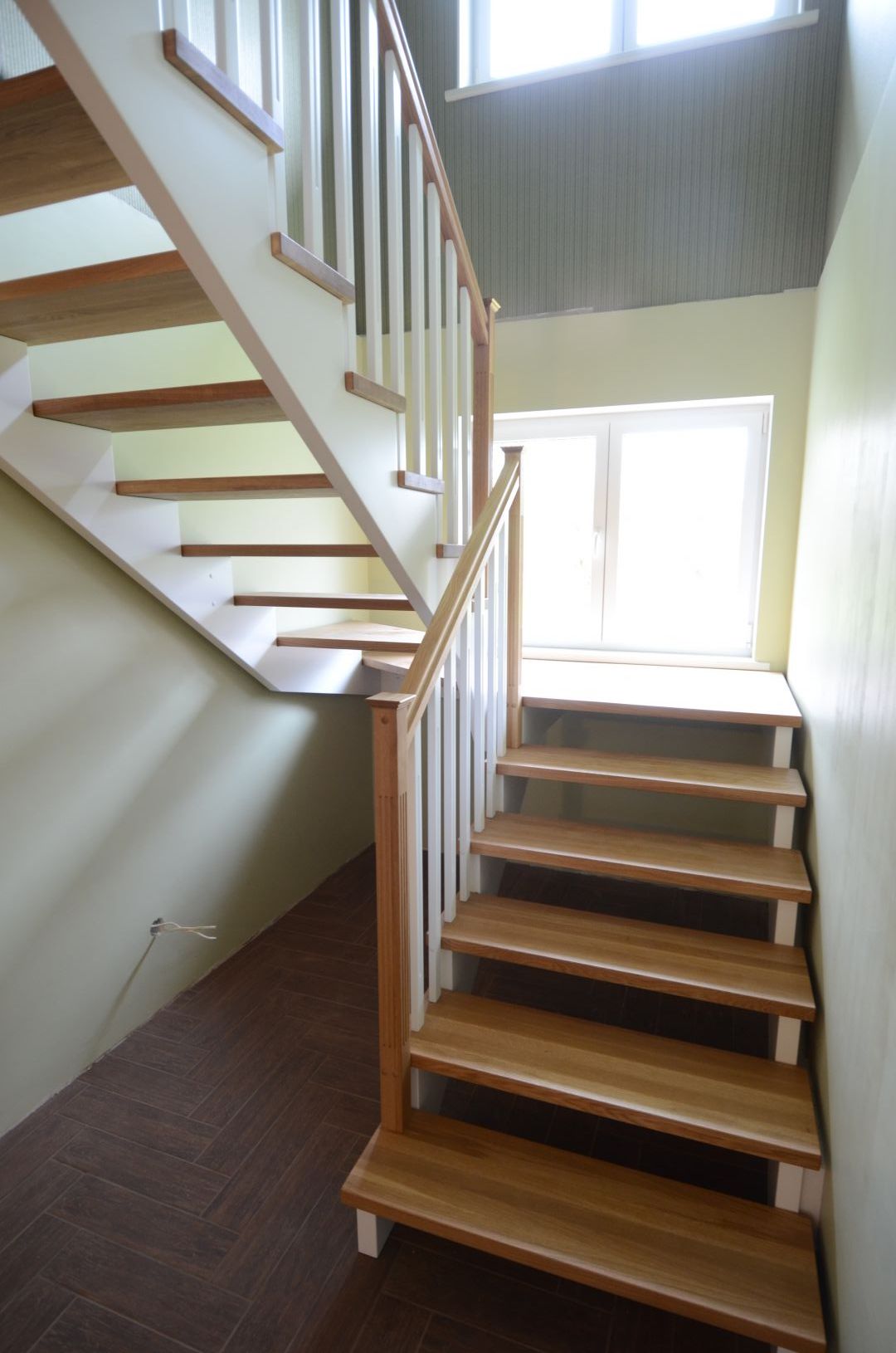 U-trepp. Astmed tamme liimpuidust, põsepuud ristvineerist, toepulgad pöögist ja värvitud valge värviga. T