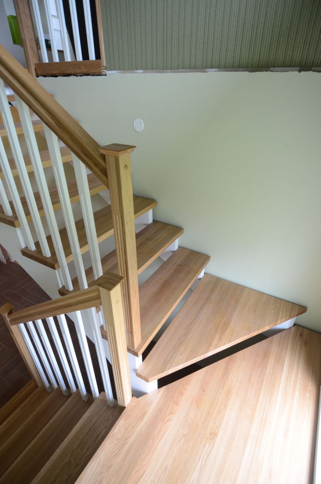 U-trepp. Astmed tamme liimpuidust, põsepuud ristvineerist, toepulgad pöögist ja värvitud valge värviga.