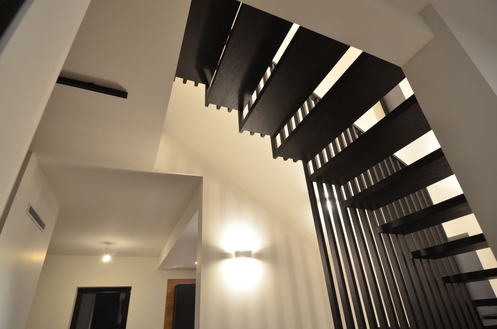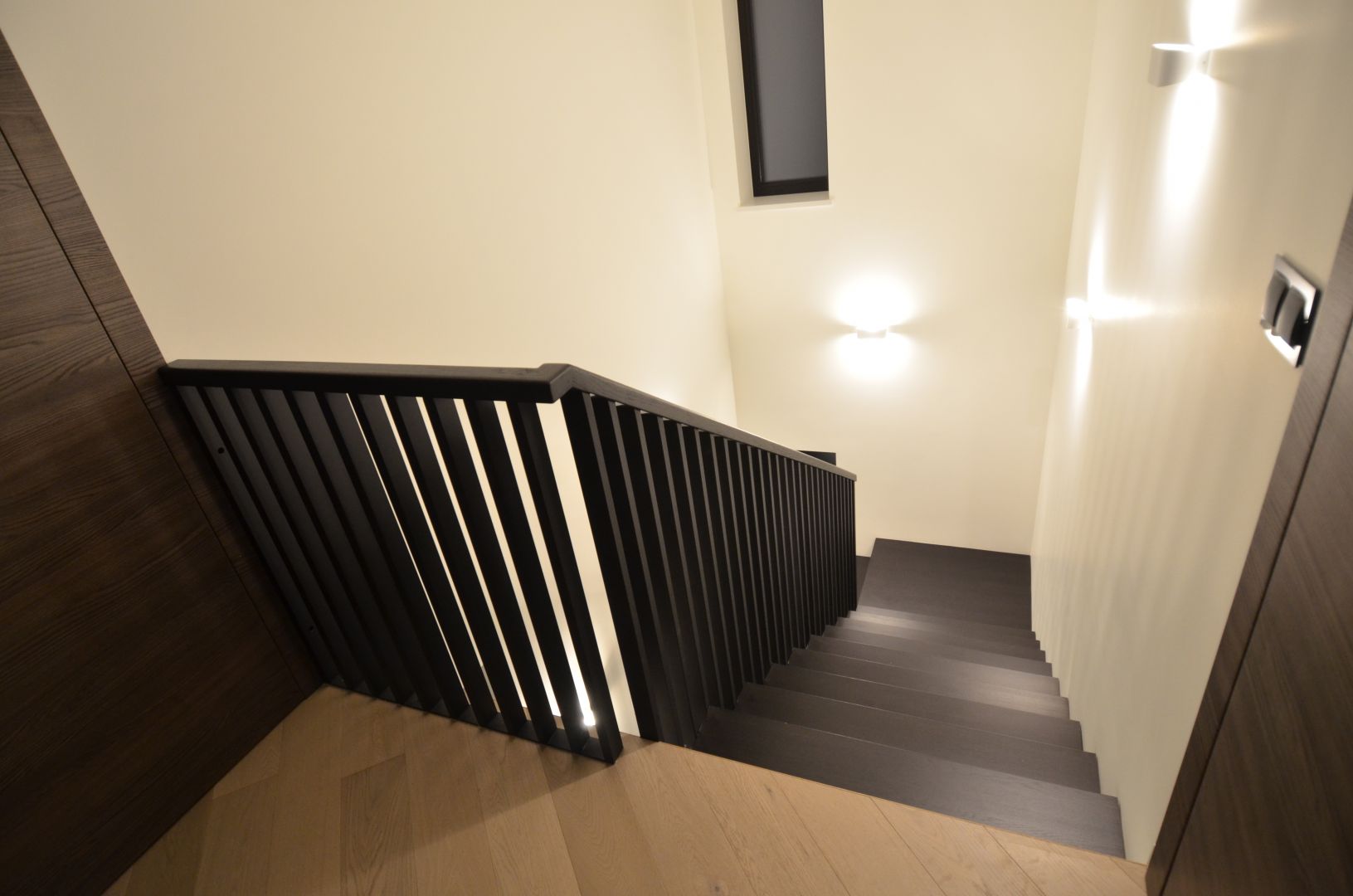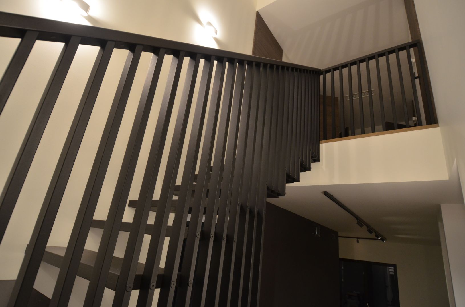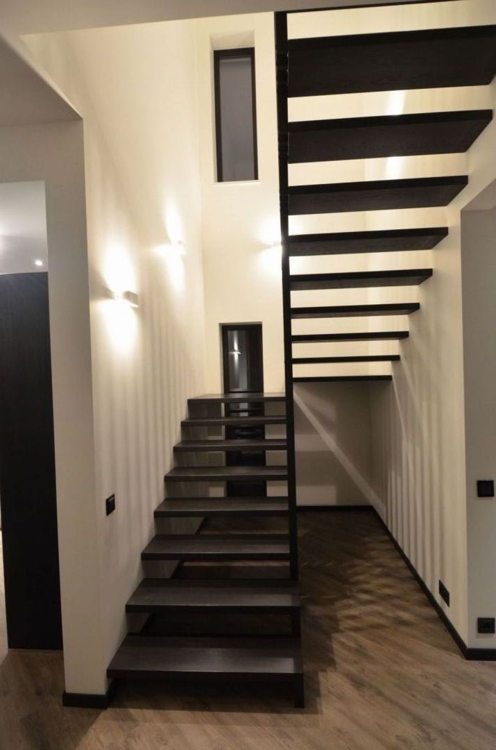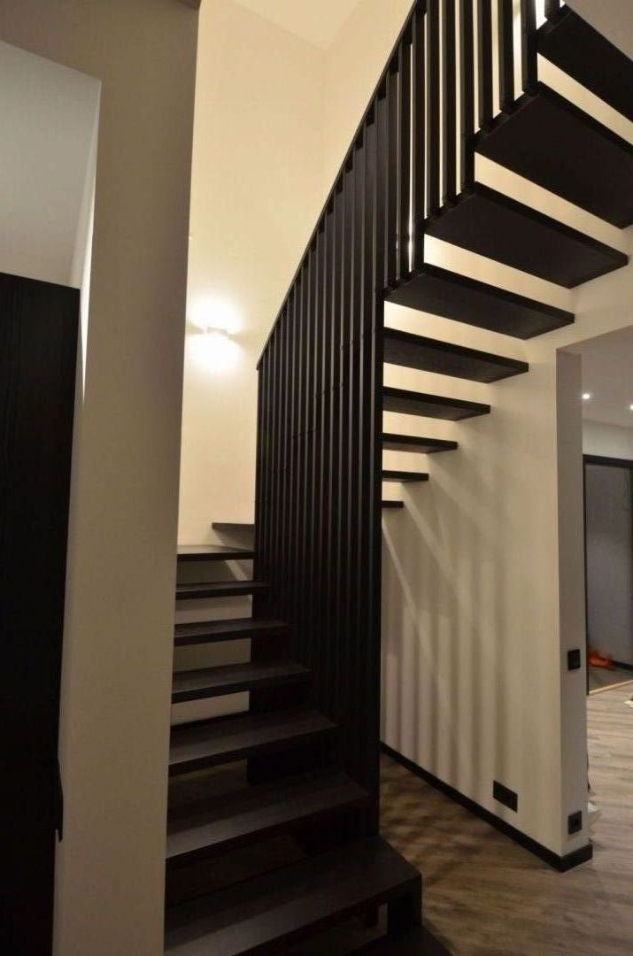 Galerii » Platvormiga trepid » Varbtrepp Varbtrepp Keskosas 30x50 mm torud, seinas konsoolid. Astmed tamme liimpuidust õlitatud mustaks. Tagasi 335