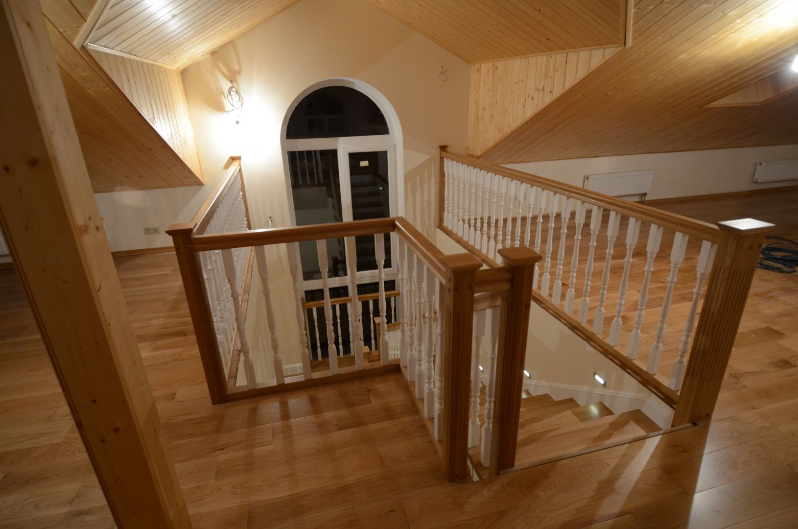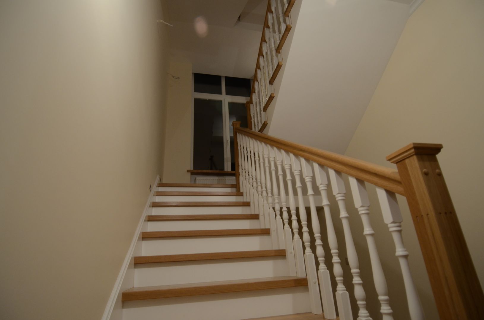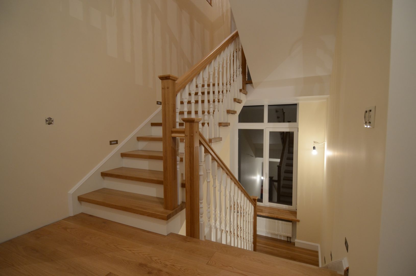 Betoontrepp kaetud tamme liimpuidust astmete ja värvitud mdf-ist varvaslaudadega.