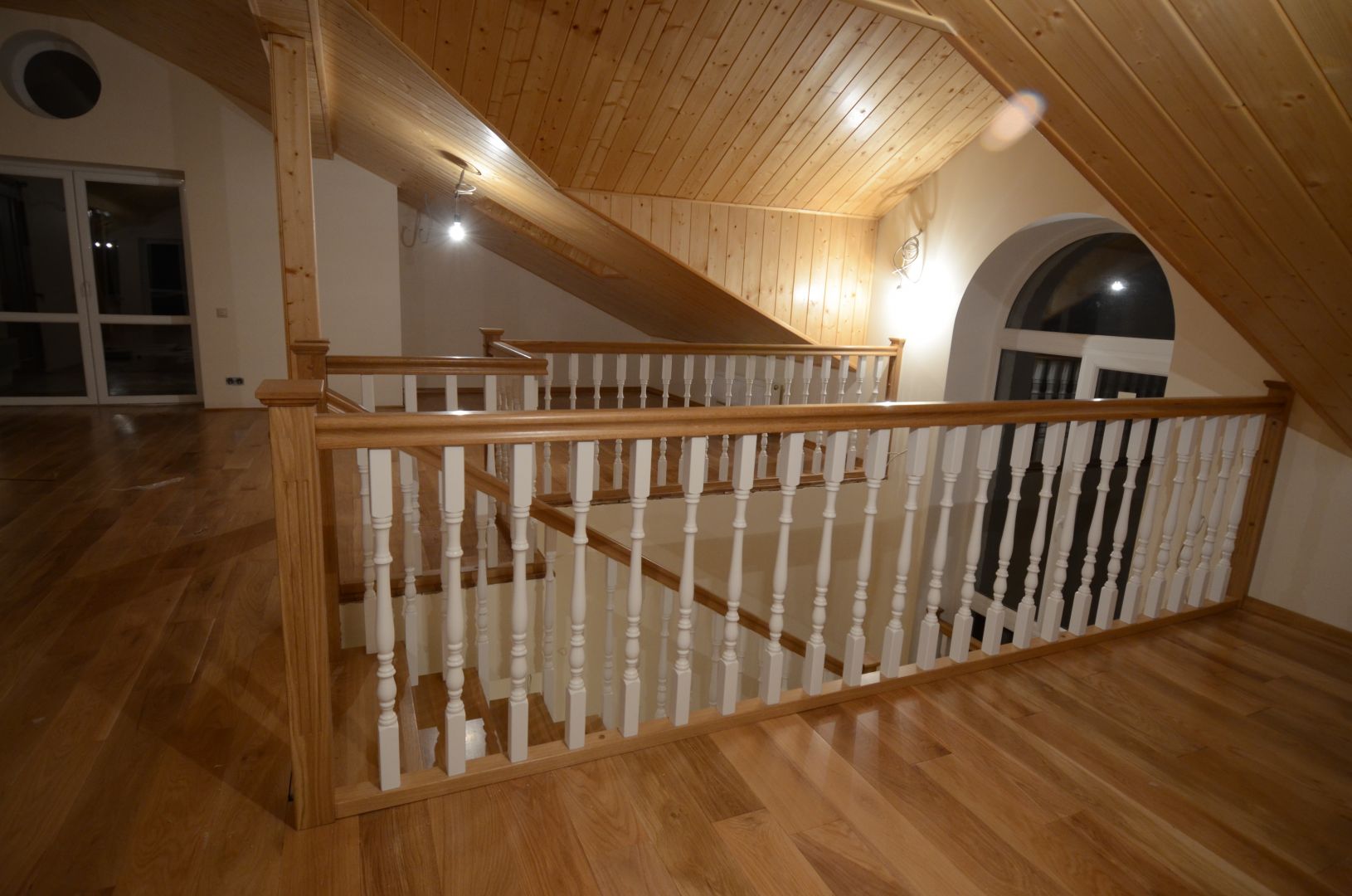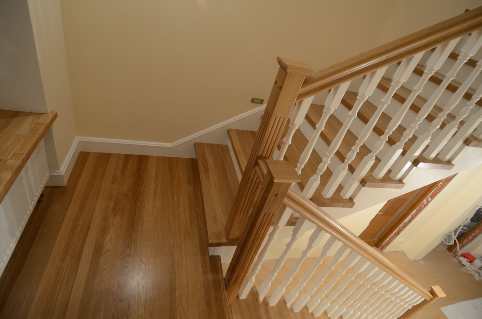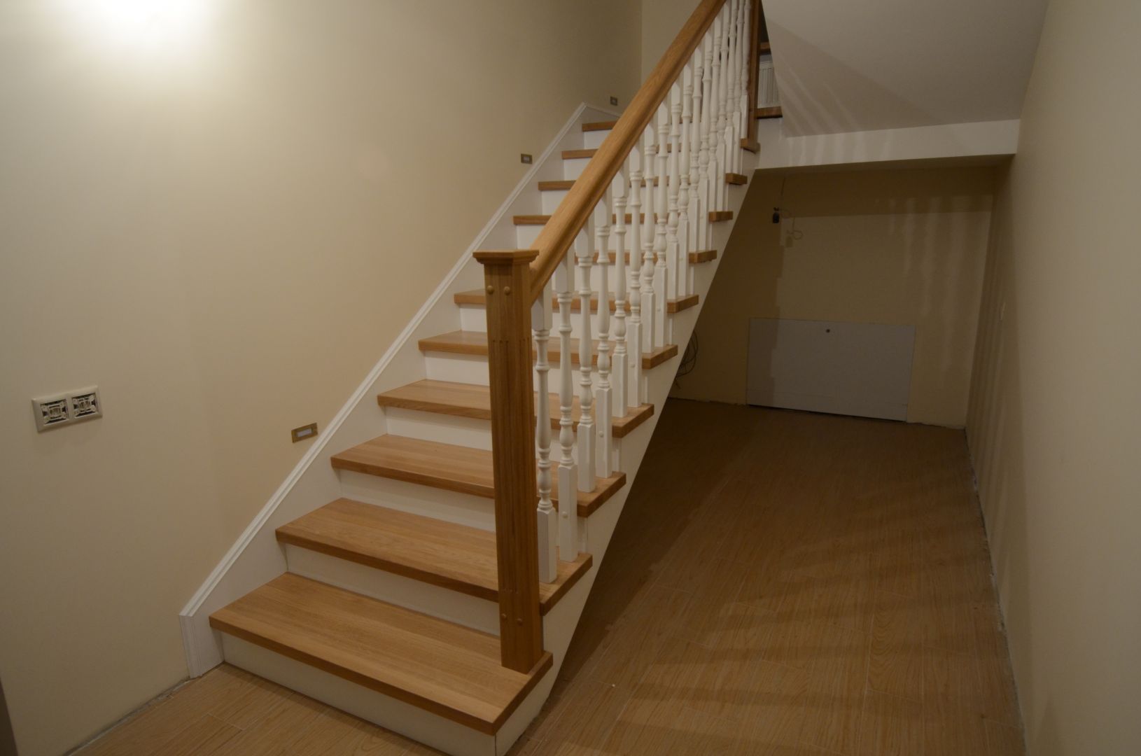 Betoontrepp kaetud tamme liimpuidust astmete ja värvitud mdf-ist varvaslaudadega.