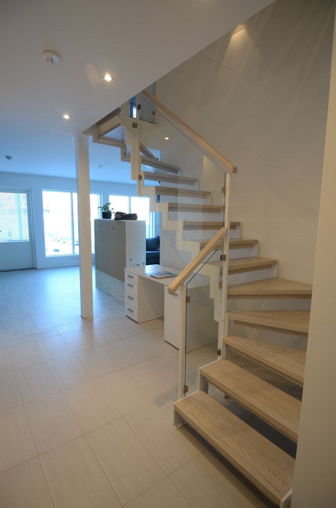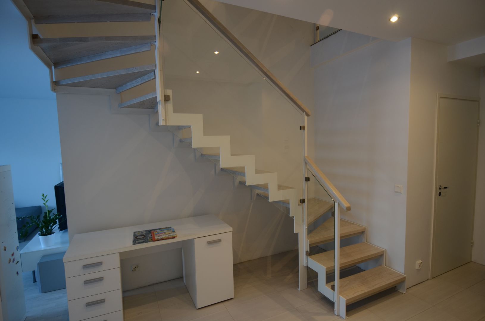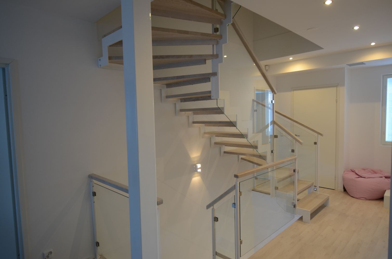 Kandekonstruktsioon 12x100mm sik-sak teraslehest, astmed tamme liimpuidust peitsitud valgeks ja lakitud. Piirdeks 30x30 mm metallist postide vahel kirgas karastatud 8 mm klaas.